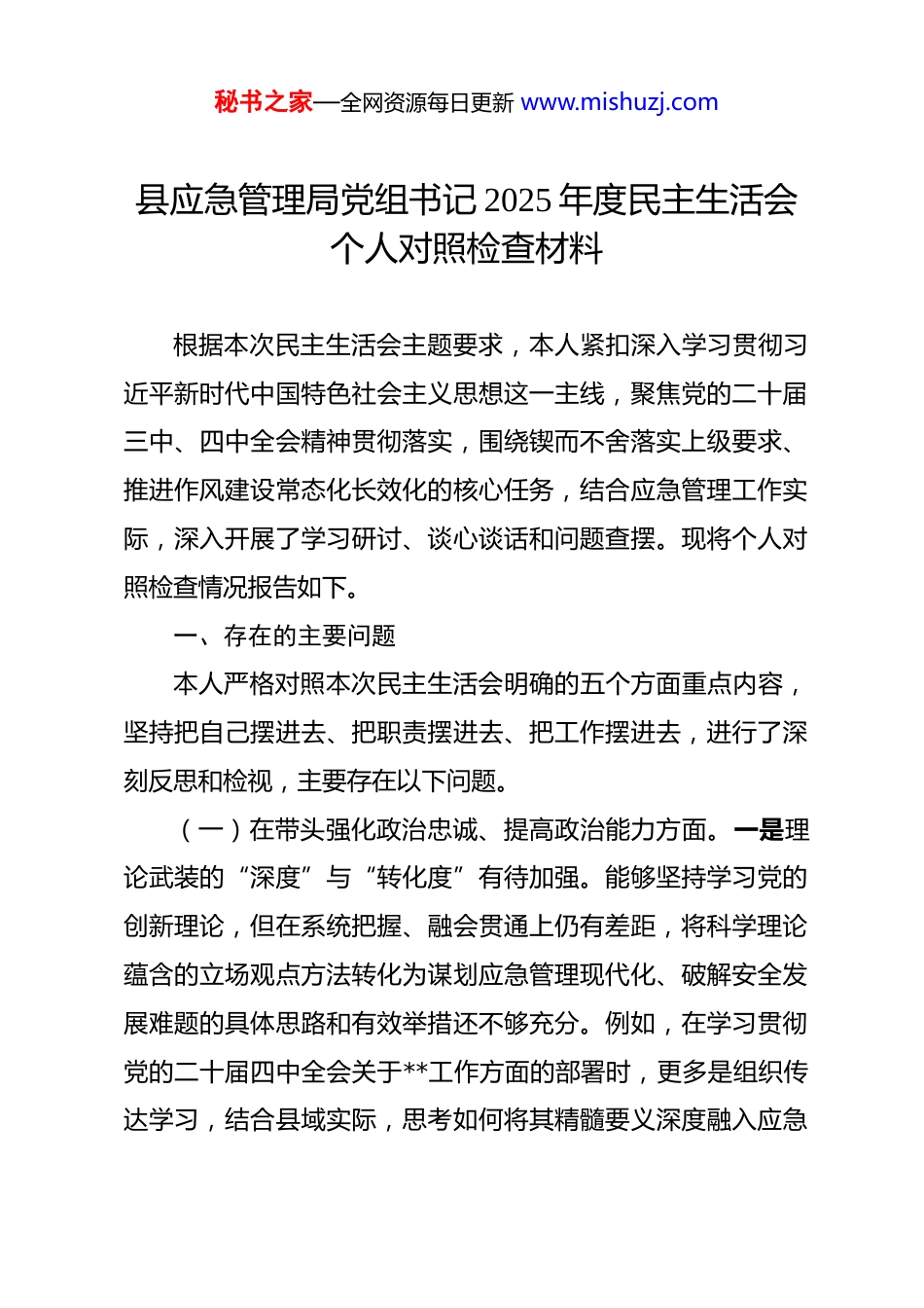 秘书之家—全网资源每日更新 www.mishuzj.com县应急管理局党组书记 2025 年度民主生活会个人对照检查材料 根据本次民主生活会主题要求,本人紧扣深入学习贯彻习近平新时代中国特色社会主义思想这一主线,聚焦党的二十届三中、四中全会精神贯彻落实,围绕锲而不舍落实上级要求、推进作风建设常态化长效化的核心任务,结合应急管理工作实际,深入开展了学习研讨、谈心谈话和问题查摆。现将个人对照检查情况报告如下。一、存在的主要问题本人严格对照本次民主生活会明确的五个方面重点内容,坚持把自己摆进去、把职责摆进去、把工作摆进去,进行了深刻反思和检视,主要存在以下问题。(一)在带头强化政治忠诚、提高政治能力方面。一是理论武装的“深度”与“转化度”有待加强。能够坚持学习党的创新理论,但在系统把握、融会贯通上仍有差距,将科学理论蕴含的立场观点方法转化为谋划应急管理现代化、破解安全发展难题的具体思路和有效举措还不够充分。例如,在学习贯彻党的二十届四中全会关于**工作方面的部署时,更多是组织传达学习,结合县域实际,思考如何将其精髓要义深度融入应急秘书之家—全网资源每日更新 www.mishuzj.com管理体制改革、基层应急能力建设等具体规划中,形成具有**特色的落实路径,这方面的前瞻性研究和系统性设计尚显不足,理论学习的“后半篇文章”做得不够扎实。二是政治判断的“敏锐性”与“前瞻性”有待提升。面对复杂严峻的安全生产形势和自然灾害风险,有时更多关注具体隐患的排查整治,从政治高度审视风险、把握全局的能力仍需加强。例如,在分析研判**领域安全风险时,虽然能够看到直接的技术和管理问题,但对其可能引发的社会影响、舆情风险乃至对全县稳定发展大局的潜在冲击,预判不够精准,未能始终将“时时放心不下”的责任感,完全转化为“事事心中有底”的洞察力,在统筹发展和安全上政治能力的“工具箱”还不够丰富。三是执行决策的“穿透力”与“创造性”有待增强。对党中央的大政方针和上级党委的决策部署能够做到坚决执行,但在结合应急管理实际创造性地抓落实上,有时存在按部就班、路径依赖的情况。比如,在落实上级关于深化应急管理综合行政执法改革的要求时,虽然完成了机构整合和人员转隶,但在如何优化执法方式、提升执法效能、实现“一支队伍管执法”优势最大化方面,主动探索、先行先试的劲头不足,一定程度上存在“等”具体指导、“看”周边做法的现象,将上级精神转化为本地生动实践的“最后一公里”尚未完全打通。秘书之家—全网资源每日更新 www.mishuzj.com(二)在带头固本培元、增强党性方面。一是党性锤炼的“常态性”与“斗争性”有待巩固。能够参加党的组织生活,但在运用批评和自我批评武器上,有时“辣味”不足,存在“好人主义”思想。在班子内部或组织生活会上,对同志们存在的问题,多以提醒、建议的方式提出,怕影响团结、伤及面子,未能真正做到“红脸出汗”。对照党章党规党纪进行自我检视,有时对思想深处的一些模糊认识、惯性思维,缺乏刨根问底的勇气和刀刃向内的狠劲,自我革命的主动性有所减弱。二是理想信念的“实践性”与“坚韧性”有待彰显。深知坚定理想信念的重要性,但将其融入日常、化为行动的标准有时不够高。面对应急管理工作“高负荷、高压力、高风险”的常态,偶尔会产生疲惫心态和畏难情绪,攻坚克难的锐气和“赴汤蹈火”的牺牲精神有所淡化。例如,在推动一项历史遗留的安全生产复杂隐患彻底整改时,因涉及多方利益协调和较大资金投入,曾一度感到棘手,推进节奏放缓,缺乏那种“不破楼兰终不还”的执着韧劲,理想信念在应对具体困难挑战时的“压舱石”作用发挥不够充分。三是道德修养的“示范性”与“引领性”有待强化。虽然能够做到廉洁自律,但在以自身高尚道德情操感染带动全局党员干部方面,主动性和方法上有欠缺。更多是要求大家怎么做,而通过言传身教、潜移默化地弘扬共产秘书之家—全网资源每日更新 www.mishuzj.com党人价值观、传承应急管理优良传统的举措不多。(三)在带头敬畏人民、敬畏组织、敬畏法纪方面。一是群众路线的“实践性”与“实效性”有待深化。落实“四下基...