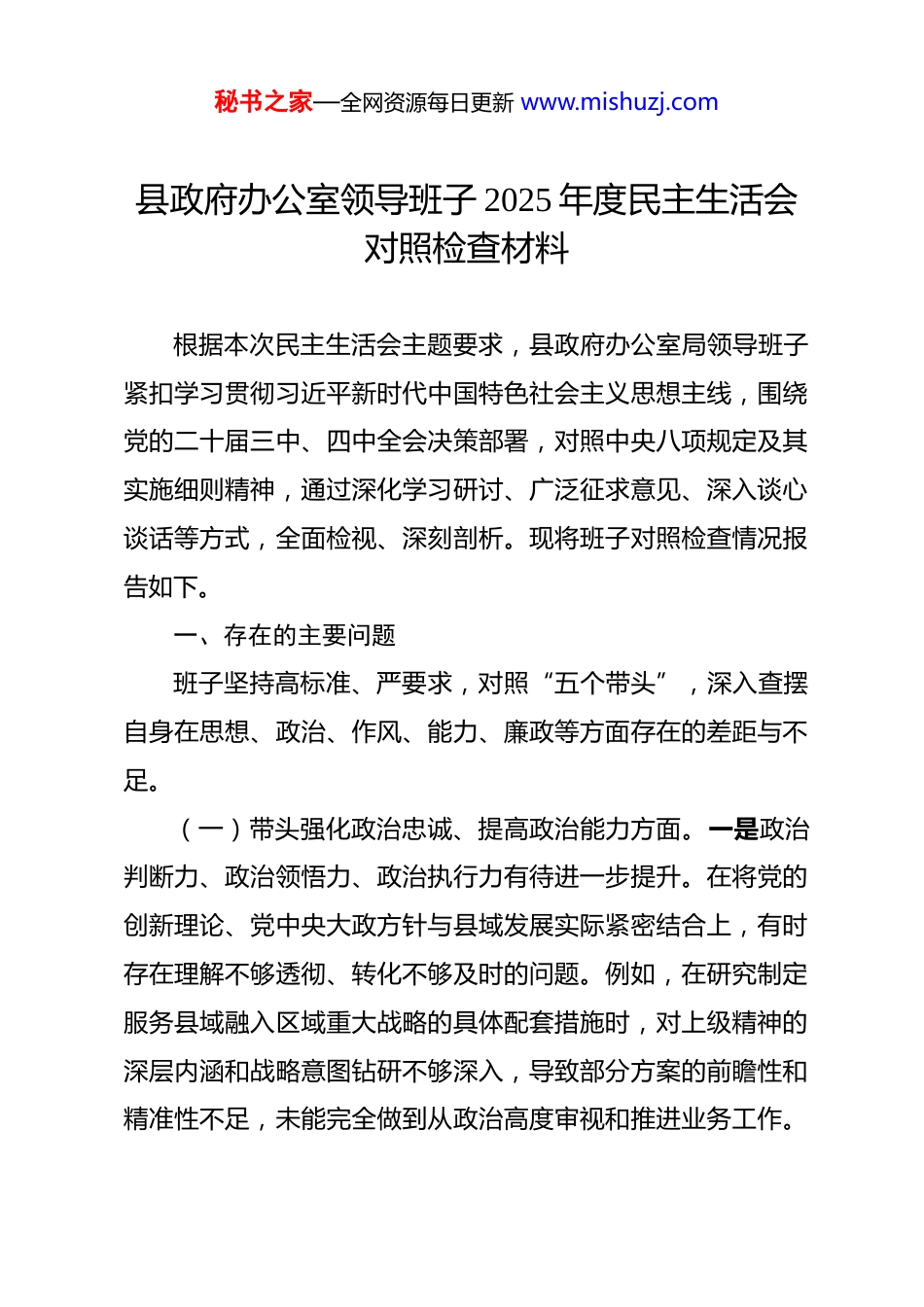 秘书之家—全网资源每日更新 www.mishuzj.com县政府办公室领导班子 2025 年度民主生活会对照检查材料 根据本次民主生活会主题要求,县政府办公室局领导班子紧扣学习贯彻习近平新时代中国特色社会主义思想主线,围绕党的二十届三中、四中全会决策部署,对照中央八项规定及其实施细则精神,通过深化学习研讨、广泛征求意见、深入谈心谈话等方式,全面检视、深刻剖析。现将班子对照检查情况报告如下。一、存在的主要问题班子坚持高标准、严要求,对照“五个带头”,深入查摆自身在思想、政治、作风、能力、廉政等方面存在的差距与不足。(一)带头强化政治忠诚、提高政治能力方面。一是政治判断力、政治领悟力、政治执行力有待进一步提升。在将党的创新理论、党中央大政方针与县域发展实际紧密结合上,有时存在理解不够透彻、转化不够及时的问题。例如,在研究制定服务县域融入区域重大战略的具体配套措施时,对上级精神的深层内涵和战略意图钻研不够深入,导致部分方案的前瞻性和精准性不足,未能完全做到从政治高度审视和推进业务工作。秘书之家—全网资源每日更新 www.mishuzj.com二是政治敏锐性和斗争精神需持续加强。对社会上一些错误思潮和模糊认识,班子在组织引导干部旗帜鲜明进行辨析和抵制方面,主动性、针对性不够强。在协调处理涉及多部门利益的复杂事务时,有时过于强调操作层面的可行性,从维护政治原则和政治纪律角度进行刚性约束的力度有待加大。三是贯彻落实决策部署的“最后一公里”存在温差。虽然能够坚决执行县委、县政府的各项决定,但在推动办公室局内部各科室及协调相关单位形成合力、确保政令畅通无阻方面,督查督办的长效机制和穿透力尚有提升空间。例如,在督办 2025 年度部分重点改革任务时,满足于文件转办和进度收集,对执行过程中遇到的政策瓶颈和协同梗阻,主动牵头“啃硬骨头”、打通关节的韧劲不足。(二)带头固本培元、增强党性方面。一是理论武装的深度和系统性有欠缺。班子集体学习有时与工作结合不够紧密,存在“以干代学”现象,对习近平新时代中国特色社会主义思想的世界观、方法论掌握运用不够纯熟。例如,在组织年度理论学习中心组学习时,虽然完成了既定篇目和次数,但围绕“六个必须坚持”指导办公室“三服务”工作实践开展的专题研讨不够深入,运用党的创新理论解决实际问题的能力有待提高。二是党性修养的锤炼不够经常严格。班子成员以普通党员秘书之家—全网资源每日更新 www.mishuzj.com身份参加所在党支部组织生活的自觉性、规范性有待加强,开展批评与自我批评有时“辣味”不足。在传承红色基因、弘扬优良传统方面,组织形式的创新性不够,教育感染力有待提升。例如,在策划开展革命传统教育时,多采用参观学习等传统方式,如何引导党员干部将感悟内化为坚定理想信念、筑牢信仰之基的自觉行动,方法措施不够丰富有效。三是理想信念教育融入日常管理不够紧密。对党员干部的思想动态跟踪分析不够及时全面,谈心谈话多侧重于工作交流,在深入了解干部世界观、人生观、价值观状况,针对性加强引导方面做得不够。例如,对于年轻干部在职业发展、工作压力等方面的思想困惑,班子集体研究进行系统性疏导和价值观引领的机制不够健全。(三)带头敬畏人民、敬畏组织、敬畏法纪方面。一是践行群众路线不够深入扎实。“四下基层”制度落实中,存在“身入”基层多、“心到”基层少的情况。调研安排有时考虑基层实际不够,提前打招呼、按设定路线走的情况仍有发生,难以全面掌握原汁原味的民情民意。例如,在协调推进 2025 年“丰富开放式全民健身空间”民生实事项目前期,虽然组织了现场调研,但对不同社区、不同年龄段居民差异化需求的摸排不够细致,导致部分点位规划与群众实际使用习惯存在偏差,后期进行了调整。二是民主集中制执行质量有待提高。班子议秘书之家—全网资源每日更新 www.mishuzj.com事决策程序虽然规范,但在一些非重大事项上,会前酝酿沟通有时不够充分,会上听取不同意见的耐心和包容性可以更强。例如,在研究办公室内部信息化建设方案时,由于前期技术论证和意见征求范围不够广,会上对部分技术路线的争议较大...