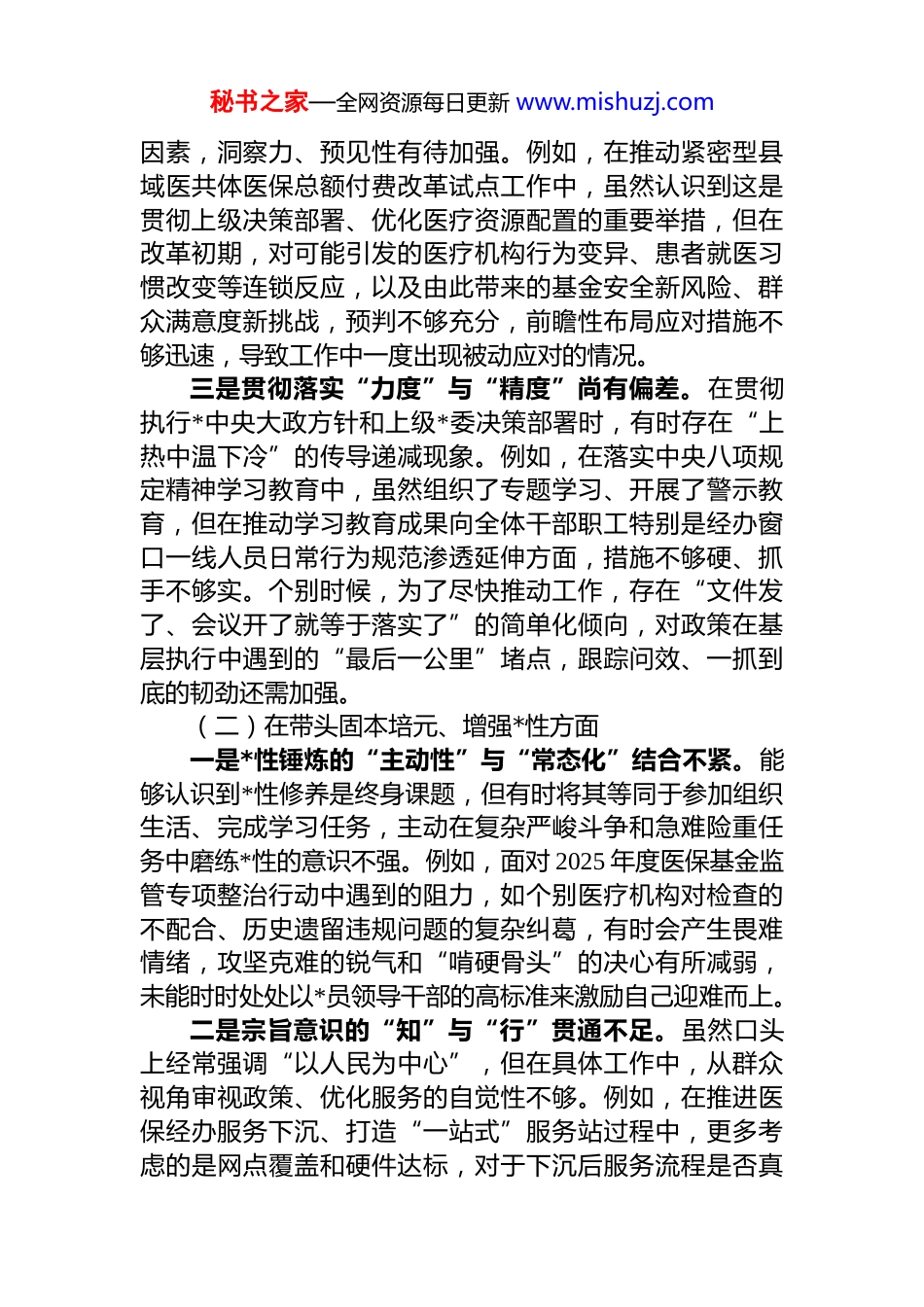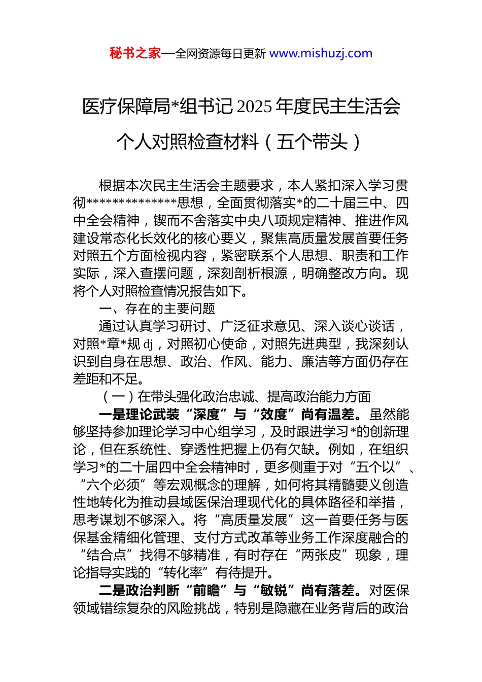 秘书之家—全网资源每日更新 www.mishuzj.com医疗保障局*组书记 2025 年度民主生活会个人对照检查材料(五个带头)根据本次民主生活会主题要求,本人紧扣深入学习贯彻**************思想,全面贯彻落实*的二十届三中、四中全会精神,锲而不舍落实中央八项规定精神、推进作风建设常态化长效化的核心要义,聚焦高质量发展首要任务对照五个方面检视内容,紧密联系个人思想、职责和工作实际,深入查摆问题,深刻剖析根源,明确整改方向。现将个人对照检查情况报告如下。一、存在的主要问题通过认真学习研讨、广泛征求意见、深入谈心谈话,对照*章*规 dj,对照初心使命,对照先进典型,我深刻认识到自身在思想、政治、作风、能力、廉洁等方面仍存在差距和不足。(一)在带头强化政治忠诚、提高政治能力方面一是理论武装“深度”与“效度”尚有温差。虽然能够坚持参加理论学习中心组学习,及时跟进学习*的创新理论,但在系统性、穿透性把握上仍有欠缺。例如,在组织学习*的二十届四中全会精神时,更多侧重于对“五个以”、“六个必须”等宏观概念的理解,如何将其精髓要义创造性地转化为推动县域医保治理现代化的具体路径和举措,思考谋划不够深入。将“高质量发展”这一首要任务与医保基金精细化管理、支付方式改革等业务工作深度融合的“结合点”找得不够精准,有时存在“两张皮”现象,理论指导实践的“转化率”有待提升。二是政治判断“前瞻”与“敏锐”尚有落差。对医保领域错综复杂的风险挑战,特别是隐藏在业务背后的政治秘书之家—全网资源每日更新 www.mishuzj.com因素,洞察力、预见性有待加强。例如,在推动紧密型县域医共体医保总额付费改革试点工作中,虽然认识到这是贯彻上级决策部署、优化医疗资源配置的重要举措,但在改革初期,对可能引发的医疗机构行为变异、患者就医习惯改变等连锁反应,以及由此带来的基金安全新风险、群众满意度新挑战,预判不够充分,前瞻性布局应对措施不够迅速,导致工作中一度出现被动应对的情况。三是贯彻落实“力度”与“精度”尚有偏差。在贯彻执行*中央大政方针和上级*委决策部署时,有时存在“上热中温下冷”的传导递减现象。例如,在落实中央八项规定精神学习教育中,虽然组织了专题学习、开展了警示教育,但在推动学习教育成果向全体干部职工特别是经办窗口一线人员日常行为规范渗透延伸方面,措施不够硬、抓手不够实。个别时候,为了尽快推动工作,存在“文件发了、会议开了就等于落实了”的简单化倾向,对政策在基层执行中遇到的“最后一公里”堵点,跟踪问效、一抓到底的韧劲还需加强。(二)在带头固本培元、增强*性方面一是*性锤炼的“主动性”与“常态化”结合不紧。能够认识到*性修养是终身课题,但有时将其等同于参加组织生活、完成学习任务,主动在复杂严峻斗争和急难险重任务中磨练*性的意识不强。例如,面对 2025 年度医保基金监管专项整治行动中遇到的阻力,如个别医疗机构对检查的不配合、历史遗留违规问题的复杂纠葛,有时会产生畏难情绪,攻坚克难的锐气和“啃硬骨头”的决心有所减弱,未能时时处处以*员领导干部的高标准来激励自己迎难而上。二是宗旨意识的“知”与“行”贯通不足。虽然口头上经常强调“以人民为中心”,但在具体工作中,从群众视角审视政策、优化服务的自觉性不够。例如,在推进医保经办服务下沉、打造“一站式”服务站过程中,更多考虑的是网点覆盖和硬件达标,对于下沉后服务流程是否真秘书之家—全网资源每日更新 www.mishuzj.com正简便、老年人等群体使用是否便捷、群众反馈渠道是否畅通等“软环境”建设,深入调研、体验式察访不够,导致部分服务点的实效与群众期盼存在差距。2025 年我县全民参保率稳定在 97%以上,但在如何精准动员剩余 3%的困难群体参保、解决其“急难愁盼”问题上,思路和办法还不够多。三是纪律规矩的“内化”与“外塑”尚有差距。能够自觉学习*章*规 dj,但在将其内化为日用而不觉的言行准则方面,标准还不够高。例如,在规范*员干部网络言行方面,虽然对全局干部职工提出了要求,但对自己在非工作场合、在非正式交流中的言论尺度,警惕性有时不足,未能时刻以...