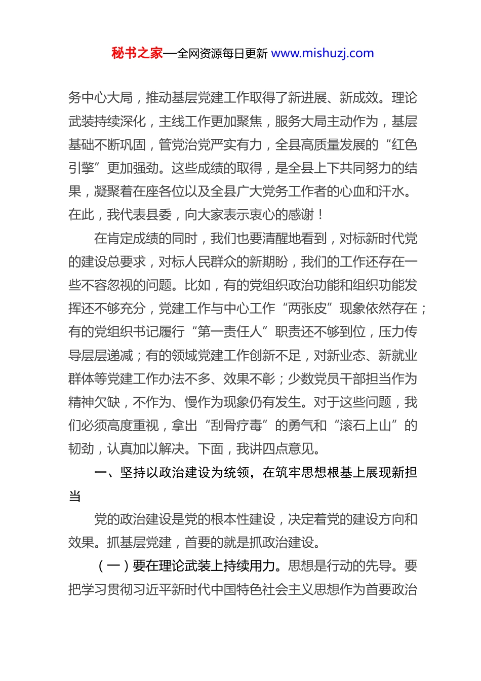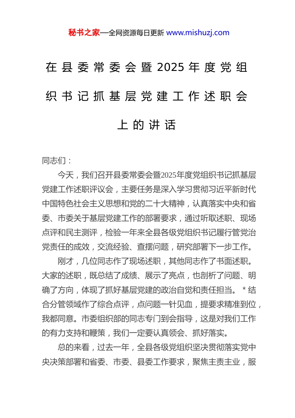 秘书之家—全网资源每日更新 www.mishuzj.com在 县 委 常 委 会 暨 2025 年 度 党 组织 书 记 抓 基 层 党 建 工 作 述 职 会上 的 讲 话同志们: 今天,我们召开县委常委会暨2025年度党组织书记抓基层党建工作述职评议会,主要任务是深入学习贯彻习近平新时代中国特色社会主义思想和党的二十大精神,认真落实中央和省委、市委关于基层党建工作的部署要求,通过听取述职、现场点评和民主测评,检验一年来全县各级党组织书记履行管党治党责任的成效,交流经验、查摆问题,研究部署下一步工作。刚才,几位同志作了现场述职,其他同志作了书面述职。大家的述职,既总结了成绩、展示了亮点,也剖析了问题、明确了方向,体现了抓好基层党建的政治自觉和责任担当。*结合分管领域作了综合点评,点问题一针见血,提要求精准到位,我都同意。市委组织部的同志专门到会指导,这是对我们工作的有力支持和鞭策,我们一定要认真领会、抓好落实。总的来看,过去一年,全县各级党组织坚决贯彻落实党中央决策部署和省委、市委、县委工作要求,聚焦主责主业,服秘书之家—全网资源每日更新 www.mishuzj.com务中心大局,推动基层党建工作取得了新进展、新成效。理论武装持续深化,主线工作更加聚焦,服务大局主动作为,基层基础不断巩固,管党治党严实有力,全县高质量发展的“红色引擎”更加强劲。这些成绩的取得,是全县上下共同努力的结果,凝聚着在座各位以及全县广大党务工作者的心血和汗水。在此,我代表县委,向大家表示衷心的感谢!在肯定成绩的同时,我们也要清醒地看到,对标新时代党的建设总要求,对标人民群众的新期盼,我们的工作还存在一些不容忽视的问题。比如,有的党组织政治功能和组织功能发挥还不够充分,党建工作与中心工作“两张皮”现象依然存在;有的党组织书记履行“第一责任人”职责还不够到位,压力传导层层递减;有的领域党建工作创新不足,对新业态、新就业群体等党建工作办法不多、效果不彰;少数党员干部担当作为精神欠缺,不作为、慢作为现象仍有发生。对于这些问题,我们必须高度重视,拿出“刮骨疗毒”的勇气和“滚石上山”的韧劲,认真加以解决。下面,我讲四点意见。一、坚持以政治建设为统领,在筑牢思想根基上展现新担当党的政治建设是党的根本性建设,决定着党的建设方向和效果。抓基层党建,首要的就是抓政治建设。(一)要在理论武装上持续用力。思想是行动的先导。要把学习贯彻习近平新时代中国特色社会主义思想作为首要政治秘书之家—全网资源每日更新 www.mishuzj.com任务,巩固拓展主题教育成果,建立常态化长效化学习机制。要严格落实“第一议题”制度,确保党中央的重要指示精神和上级党委的重要会议精神第一时间传达学习、第一时间贯彻落实。根据我们去年的实践,常态化落实“第一议题”制度,把理论学习作为县委常委会、政府党组会等重要会议的必学内容,是统一思想、凝聚共识的有效途径。2025年,全县各级党组织通过党委(党组)理论学习中心组学习开展专题研讨超过150次,举办各类培训班,累计培训党员干部超过5000人次,有效提升了党员干部的政治判断力、政治领悟力、政治执行力。新的一年,要继续在学懂弄通做实上下功夫,推动理论学习与我们正在推进的招商引资、项目建设、乡村振兴等重点工作深度融合,真正把学习成果转化为谋划发展的正确思路、促进发展的政策举措、领导发展的实际能力。(二)要在政治忠诚上毫不动摇。基层党组织是贯彻落实党中央决策部署的“最后一公里”。全县各级党组织要教育引导广大党员干部深刻领悟“两个确立”的决定性意义,坚决做到“两个维护”,始终在思想上政治上行动上同以习近平同志为核心的党中央保持高度一致。要不断完善党中央决策部署和上级工作要求闭环落实机制,做到令行禁止、政令畅通,确保党的路线方针政策在**大地不折不扣落地生根、开花结果。(三)要在意识形态上守土尽责。要严格落实意识形态工作责任制,牢牢掌握意识形态工作领导权。要加强对各类阵地秘书之家—全网资源每日更新 www.mishuzj.com的管理,特别是要强化网络意识形态阵地建设,弘扬主旋律,传...