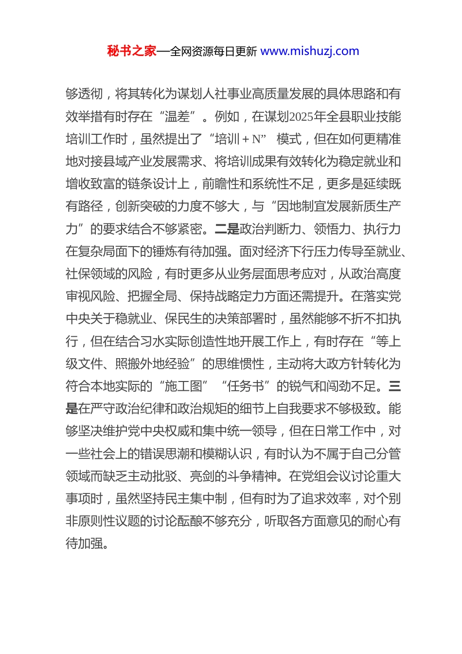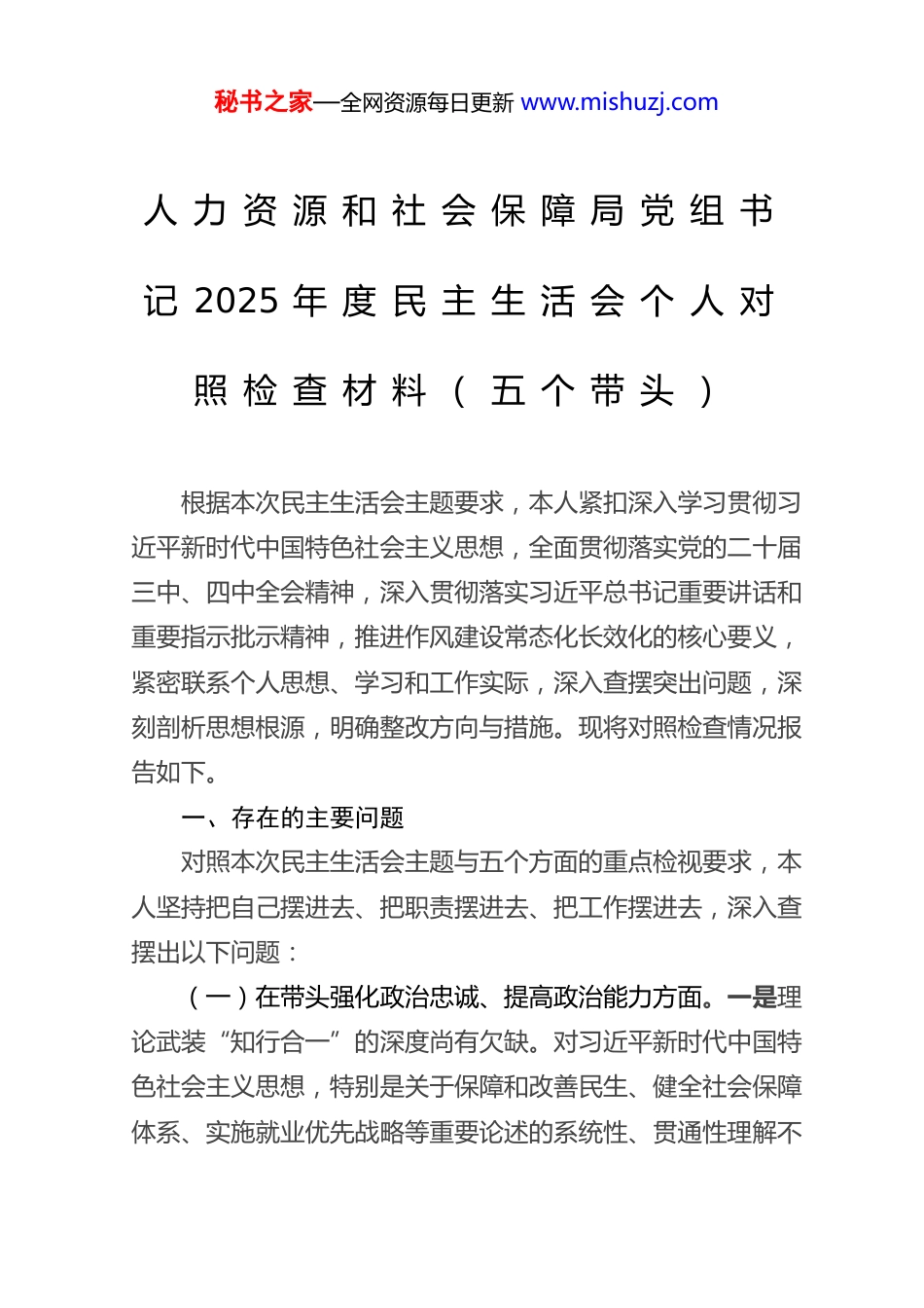 秘书之家—全网资源每日更新 www.mishuzj.com人 力 资 源 和 社 会 保 障 局 党 组 书记 2025 年 度 民 主 生 活 会 个 人 对照 检 查 材 料 ( 五 个 带 头 )根据本次民主生活会主题要求,本人紧扣深入学习贯彻习近平新时代中国特色社会主义思想,全面贯彻落实党的二十届三中、四中全会精神,深入贯彻落实习近平总书记重要讲话和重要指示批示精神,推进作风建设常态化长效化的核心要义,紧密联系个人思想、学习和工作实际,深入查摆突出问题,深刻剖析思想根源,明确整改方向与措施。现将对照检查情况报告如下。一、存在的主要问题对照本次民主生活会主题与五个方面的重点检视要求,本人坚持把自己摆进去、把职责摆进去、把工作摆进去,深入查摆出以下问题:(一)在带头强化政治忠诚、提高政治能力方面。一是理论武装“知行合一”的深度尚有欠缺。对习近平新时代中国特色社会主义思想,特别是关于保障和改善民生、健全社会保障体系、实施就业优先战略等重要论述的系统性、贯通性理解不秘书之家—全网资源每日更新 www.mishuzj.com够透彻,将其转化为谋划人社事业高质量发展的具体思路和有效举措有时存在“温差”。例如,在谋划2025年全县职业技能培训工作时,虽然提出了“培训+N”模式,但在如何更精准地对接县域产业发展需求、将培训成果有效转化为稳定就业和增收致富的链条设计上,前瞻性和系统性不足,更多是延续既有路径,创新突破的力度不够大,与“因地制宜发展新质生产力”的要求结合不够紧密。二是政治判断力、领悟力、执行力在复杂局面下的锤炼有待加强。面对经济下行压力传导至就业、社保领域的风险,有时更多从业务层面思考应对,从政治高度审视风险、把握全局、保持战略定力方面还需提升。在落实党中央关于稳就业、保民生的决策部署时,虽然能够不折不扣执行,但在结合习水实际创造性地开展工作上,有时存在“等上级文件、照搬外地经验”的思维惯性,主动将大政方针转化为符合本地实际的“施工图”“任务书”的锐气和闯劲不足。三是在严守政治纪律和政治规矩的细节上自我要求不够极致。能够坚决维护党中央权威和集中统一领导,但在日常工作中,对一些社会上的错误思潮和模糊认识,有时认为不属于自己分管领域而缺乏主动批驳、亮剑的斗争精神。在党组会议讨论重大事项时,虽然坚持民主集中制,但有时为了追求效率,对个别非原则性议题的讨论酝酿不够充分,听取各方面意见的耐心有待加强。秘书之家—全网资源每日更新 www.mishuzj.com(二)在带头固本培元、增强党性方面。一是党性修养的“源头活水”汲取不够持续。虽然能够坚持参加中心组学习,但个人自学的主动性、系统性不强,存在“以干代学”现象。对党章党规党纪的学习,有时满足于知道条文,对其深刻内涵、实践要求钻研不深,运用党性原则进行自我净化、自我完善、自我革新、自我提高的自觉性不够强。例如,在推进“互联网+人社”数字化服务过程中,更多关注平台功能建设和业务上线数量,对于如何通过数字化手段更好地践行党的群众路线、提升服务温度、防范数据安全与廉政风险等深层次问题,从党性修养角度进行思考和把握不够深入。二是理想信念的“压舱石”作用在应对繁重任务时有所松动。面对人社领域信访维稳、基金安全、劳动关系调处等多重压力,有时会产生畏难情绪和求稳心态,攻坚克难的锐气有所消减。对照革命先辈和先进典型,在艰苦奋斗、无私奉献的精神境界上存在差距。例如,在推动解决某些历史遗留的社保欠费问题时,虽然进行了多次协调,但在面对企业实际困难和复杂债权债务关系时,缺乏“一抓到底”的韧劲和“破局解题”的狠劲,一定程度上影响了问题解决的时效。三是世界观、人生观、价值观的“总开关”拧得不够时时紧。随着职务提升和工作年限增长,有时不自觉地放松了对主观世界的持续改造,批评与自我批评的武器运用不够经常、不够有力。在对待个人名利得失上,虽然能保持清醒,秘书之家—全网资源每日更新 www.mishuzj.com但偶尔也会在对比中产生心态上的微妙波动,艰苦奋斗、勤俭办事的意识需要进一步强化。(三)在带头敬畏人民、敬畏组织、敬畏...