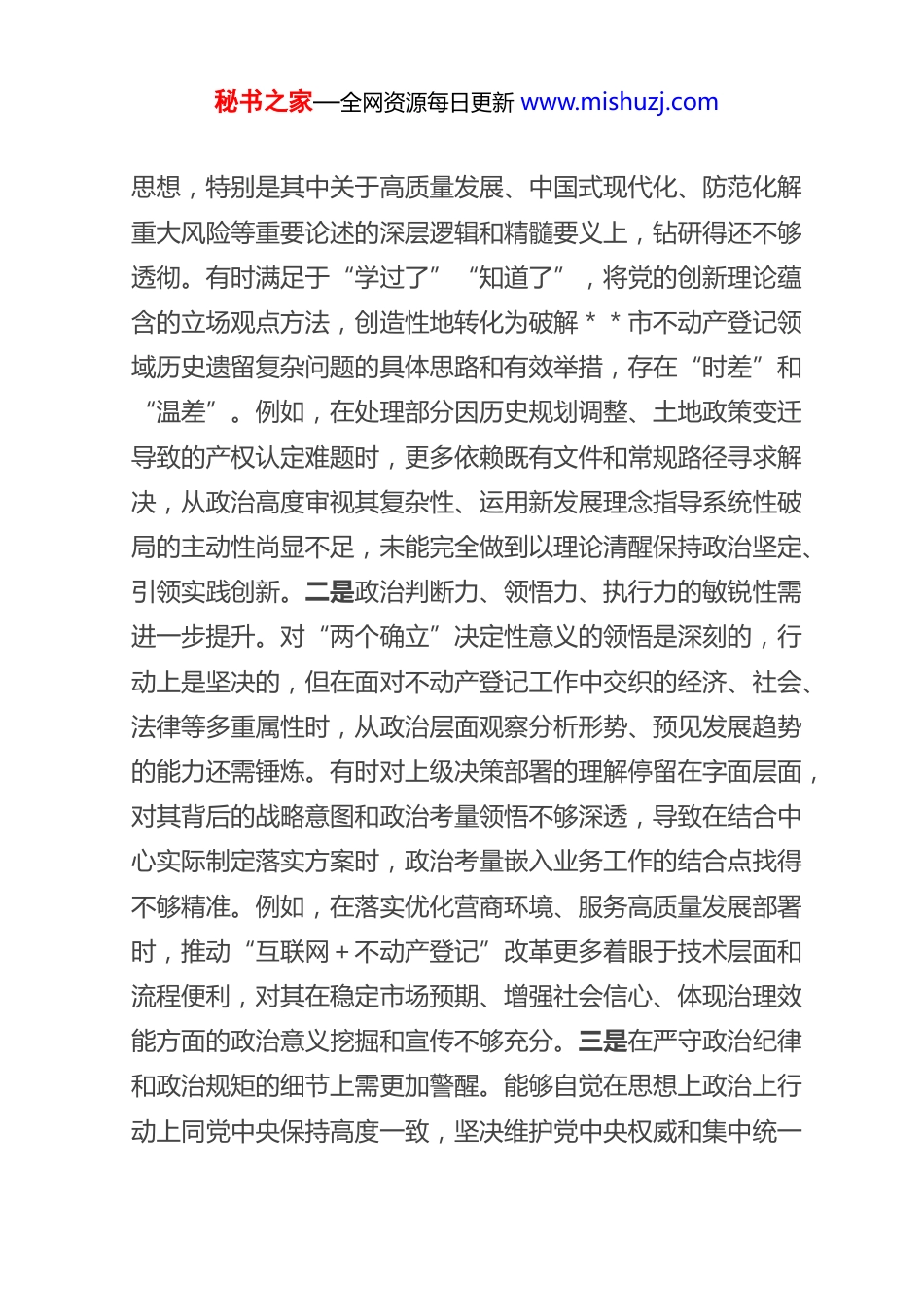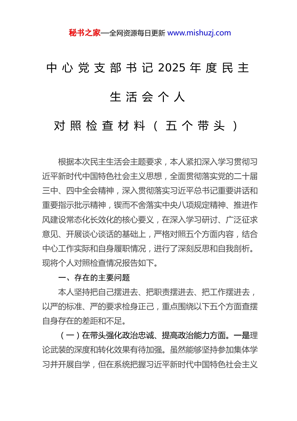 秘书之家—全网资源每日更新 www.mishuzj.com中 心 党 支 部 书 记 2025 年 度 民 主生 活 会 个 人对 照 检 查 材 料 ( 五 个 带 头 )根据本次民主生活会主题要求,本人紧扣深入学习贯彻习近平新时代中国特色社会主义思想,全面贯彻落实党的二十届三中、四中全会精神,深入贯彻落实习近平总书记重要讲话和重要指示批示精神,锲而不舍落实中央八项规定精神、推进作风建设常态化长效化的核心要义,在深入学习研讨、广泛征求意见、开展谈心谈话的基础上,严格对照五个方面内容,结合中心工作实际和自身履职情况,进行了深刻反思和自我剖析。现将个人对照检查情况报告如下。一、存在的主要问题本人坚持把自己摆进去、把职责摆进去、把工作摆进去,以严的标准、严的要求检身正己,重点围绕以下五个方面查摆自身存在的差距和不足。(一)在带头强化政治忠诚、提高政治能力方面。一是理论武装的深度和转化效果有待加强。虽然能够坚持参加集体学习并开展自学,但在系统把握习近平新时代中国特色社会主义秘书之家—全网资源每日更新 www.mishuzj.com思想,特别是其中关于高质量发展、中国式现代化、防范化解重大风险等重要论述的深层逻辑和精髓要义上,钻研得还不够透彻。有时满足于“学过了”“知道了”,将党的创新理论蕴含的立场观点方法,创造性地转化为破解**市不动产登记领域历史遗留复杂问题的具体思路和有效举措,存在“时差”和“温差”。例如,在处理部分因历史规划调整、土地政策变迁导致的产权认定难题时,更多依赖既有文件和常规路径寻求解决,从政治高度审视其复杂性、运用新发展理念指导系统性破局的主动性尚显不足,未能完全做到以理论清醒保持政治坚定、引领实践创新。二是政治判断力、领悟力、执行力的敏锐性需进一步提升。对“两个确立”决定性意义的领悟是深刻的,行动上是坚决的,但在面对不动产登记工作中交织的经济、社会、法律等多重属性时,从政治层面观察分析形势、预见发展趋势的能力还需锤炼。有时对上级决策部署的理解停留在字面层面,对其背后的战略意图和政治考量领悟不够深透,导致在结合中心实际制定落实方案时,政治考量嵌入业务工作的结合点找得不够精准。例如,在落实优化营商环境、服务高质量发展部署时,推动“互联网+不动产登记”改革更多着眼于技术层面和流程便利,对其在稳定市场预期、增强社会信心、体现治理效能方面的政治意义挖掘和宣传不够充分。三是在严守政治纪律和政治规矩的细节上需更加警醒。能够自觉在思想上政治上行动上同党中央保持高度一致,坚决维护党中央权威和集中统一秘书之家—全网资源每日更新 www.mishuzj.com领导。但在日常工作中,对一些可能产生政治影响的苗头性、倾向性问题,警惕性不够高。例如,在审核涉及重大利益调整或可能引发社会关注的不动产登记事项时,虽然履行了程序,但对其中可能隐含的社会稳定风险、舆情风险的预判和评估,有时未能提升到维护政治安全的高度进行前置性研判和周密部署,在“时时处处事事”讲政治的要求上还有提升空间。(二)在带头固本培元、增强党性方面。一是运用党的创新理论改造主观世界的自觉性有待增强。虽然认识到党性修养首在政治修养,坚持用习近平新时代中国特色社会主义思想凝心铸魂,但在“内化于心、外化于行”的转化链条上,存在“中间梗阻”。理论学习有时与个人思想实际、党性锻炼结合不够紧密,运用科学理论对照检视自身世界观、人生观、价值观的“总开关”拧得不够经常、不够彻底。面对登记工作中人情干扰或复杂诉求时,虽然能坚守原则底线,但内心深处偶尔会产生“是不是可以变通一下”的念头,反映出理想信念的根基在应对复杂现实考验时,仍需持续加固。二是党章党规党纪的学习践行未能完全做到刻骨铭心。能够组织并参加党章党规党纪的学习,但在入脑入心、融入日常、化为习惯上还有差距。有时存在“业务干部主要看业务”的潜意识,将党纪学习视为“软任务”,投入的精力不如钻研业务政策多。对《中国共产党纪律处分条例》等党内法规的新精神新要求,满足于了解基本条款,对其深刻内涵和实践要求缺乏逐条逐项的深研细读。秘书之家...