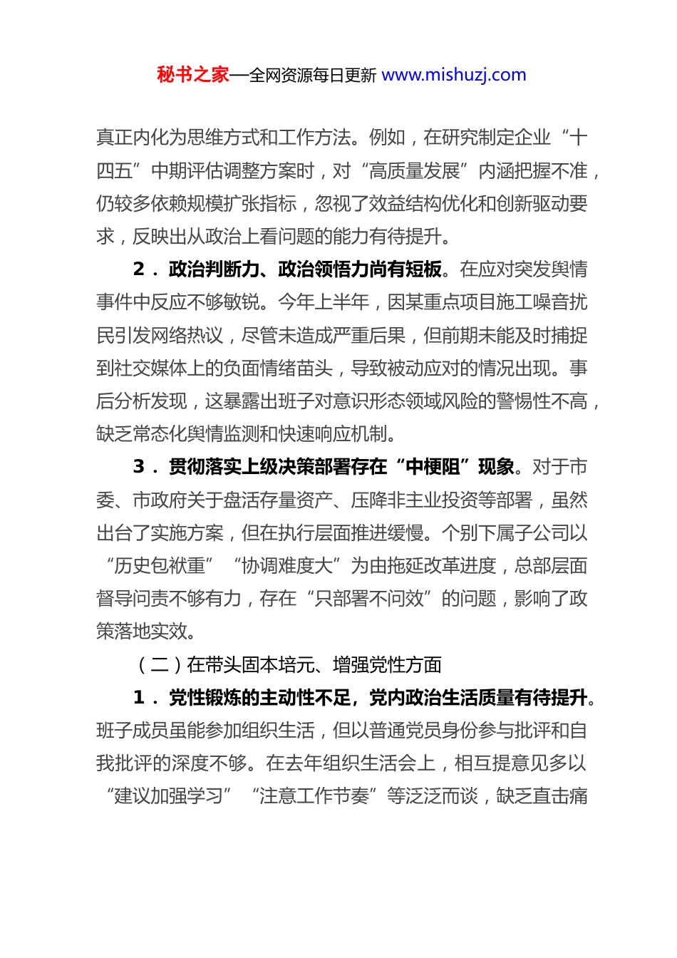 秘书之家—全网资源每日更新 www.mishuzj.com某 国 企 领 导 班 子 2025 年 度 民 主生 活 会 对 照检 查 材 料根据本次民主生活会的要求,我单位领导班子紧紧围绕“五个带头”要求,结合2025年以来学习贯彻习近平新时代中国特色社会主义思想和党的二十届四中全会精神、贯彻落实党中央关于深化国有企业改革决策部署、落实中央八项规定及其实施细则精神、推进企业高质量发展等重点工作任务,聚焦思想政治建设、履职担当作为、作风建设等方面,深入查摆问题,深刻剖析根源,明确整改方向。现将对照检查情况汇报如下:一、存在的主要问题对照“五个带头”要求,结合巡视反馈意见、审计发现问题、群众反映诉求及日常监督掌握情况,领导班子认真开展自查自纠,深入查摆出以下五个方面的主要问题:(一)在带头强化政治忠诚、提高政治能力方面1 .政治理论学习系统性不强,学用转化不够到位。虽然能够按要求组织中心组学习,完成规定动作,但存在“重数量轻质量”现象,对一些重大理论观点的理解停留在表面,未能秘书之家—全网资源每日更新 www.mishuzj.com真正内化为思维方式和工作方法。例如,在研究制定企业“十四五”中期评估调整方案时,对“高质量发展”内涵把握不准,仍较多依赖规模扩张指标,忽视了效益结构优化和创新驱动要求,反映出从政治上看问题的能力有待提升。2 .政治判断力、政治领悟力尚有短板。在应对突发舆情事件中反应不够敏锐。今年上半年,因某重点项目施工噪音扰民引发网络热议,尽管未造成严重后果,但前期未能及时捕捉到社交媒体上的负面情绪苗头,导致被动应对的情况出现。事后分析发现,这暴露出班子对意识形态领域风险的警惕性不高,缺乏常态化舆情监测和快速响应机制。3 .贯彻落实上级决策部署存在“中梗阻”现象。对于市委、市政府关于盘活存量资产、压降非主业投资等部署,虽然出台了实施方案,但在执行层面推进缓慢。个别下属子公司以“历史包袱重”“协调难度大”为由拖延改革进度,总部层面督导问责不够有力,存在“只部署不问效”的问题,影响了政策落地实效。(二)在带头固本培元、增强党性方面1 .党性锻炼的主动性不足,党内政治生活质量有待提升。班子成员虽能参加组织生活,但以普通党员身份参与批评和自我批评的深度不够。在去年组织生活会上,相互提意见多以“建议加强学习”“注意工作节奏”等泛泛而谈,缺乏直击痛秘书之家—全网资源每日更新 www.mishuzj.com点的“辣味”,削弱了党内生活的战斗性。个别成员因出差或会议冲突全年缺席支部活动达4 次以上,示范作用发挥不充分。2 .理想信念根基需进一步夯实。面对企业经营压力加大、绩效考核趋严的现实,个别班子成员出现“重业绩轻党建”“怕出错少干事”的消极心态。如在推动一项技术改造项目时,因担心短期内影响利润指标,迟迟未予立项,实质上是担当精神弱化的表现。说明在处理短期利益与长远发展关系上,党性原则坚守还不够坚定。3 .宗旨意识树得不牢,服务基层一线不够扎实。虽然建立了领导班子联系点制度,但调研存在“走流程”倾向。一次赴子公司调研安全生产工作,行程安排紧凑,主要听取管理层汇报,未深入车间班组与一线员工面对面交流,未能发现个别岗位存在疲劳作业隐患。反映出“从群众中来、到群众中去”的工作方法践行不到位。(三)在带头敬畏人民、敬畏组织、敬畏法纪方面1 .对职工群众关切回应不够及时有效。近年来公司推进薪酬制度改革,总体方向正确,但在具体操作中对部分老员工心理落差关注不够,沟通解释工作不细致,导致个别单位出现匿名信反映“同工不同酬”问题。虽经查证不属实,但也暴露出我们在涉及职工切身利益事项上,民主协商程序执行不到位,群众工作精细化程度不高。秘书之家—全网资源每日更新 www.mishuzj.com2 .在组织纪律执行上存在“好人主义”倾向。对于个别中层干部长期不在岗、兼职取酬等问题,虽掌握线索但处理迟缓,顾虑过多,担心影响队伍稳定的状况。直到上级纪委提醒后才启动核查程序,反映出对组织纪律的敬畏意识有所淡化,执纪刚性不足。3 .依法合规经营意识有待强化。在某工程项目招投标过程...