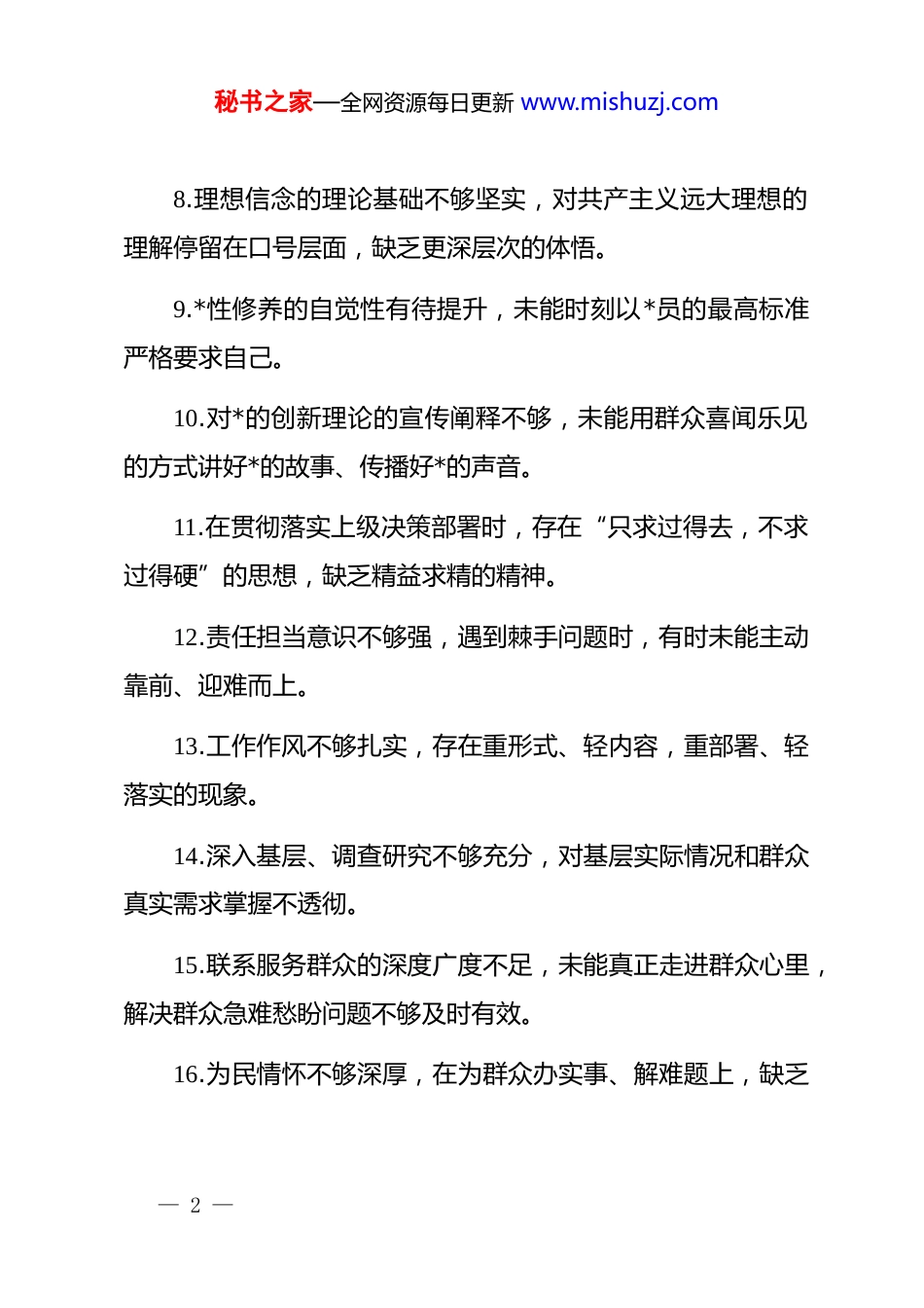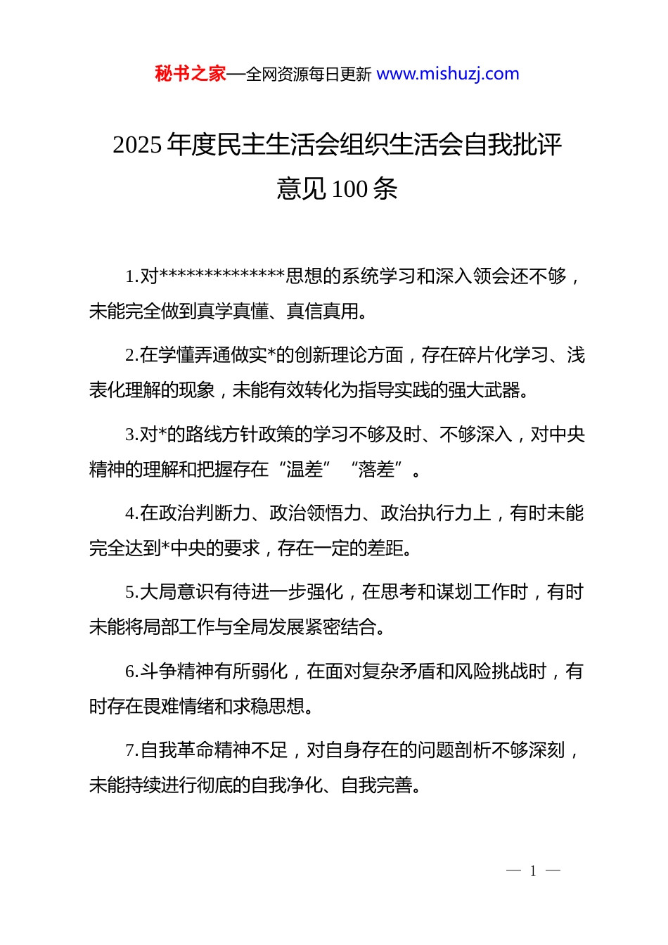 秘书之家—全网资源每日更新 www.mishuzj.com2025 年度民主生活会组织生活会自我批评意见 100 条1.对**************思想的系统学习和深入领会还不够,未能完全做到真学真懂、真信真用。2.在学懂弄通做实*的创新理论方面,存在碎片化学习、浅表化理解的现象,未能有效转化为指导实践的强大武器。3.对*的路线方针政策的学习不够及时、不够深入,对中央精神的理解和把握存在“温差”“落差”。4.在政治判断力、政治领悟力、政治执行力上,有时未能完全达到*中央的要求,存在一定的差距。5.大局意识有待进一步强化,在思考和谋划工作时,有时未能将局部工作与全局发展紧密结合。6.斗争精神有所弱化,在面对复杂矛盾和风险挑战时,有时存在畏难情绪和求稳思想。7.自我革命精神不足,对自身存在的问题剖析不够深刻,未能持续进行彻底的自我净化、自我完善。— 1 —秘书之家—全网资源每日更新 www.mishuzj.com8.理想信念的理论基础不够坚实,对共产主义远大理想的理解停留在口号层面,缺乏更深层次的体悟。9.*性修养的自觉性有待提升,未能时刻以*员的最高标准严格要求自己。10.对*的创新理论的宣传阐释不够,未能用群众喜闻乐见的方式讲好*的故事、传播好*的声音。11.在贯彻落实上级决策部署时,存在“只求过得去,不求过得硬”的思想,缺乏精益求精的精神。12.责任担当意识不够强,遇到棘手问题时,有时未能主动靠前、迎难而上。13.工作作风不够扎实,存在重形式、轻内容,重部署、轻落实的现象。14.深入基层、调查研究不够充分,对基层实际情况和群众真实需求掌握不透彻。15.联系服务群众的深度广度不足,未能真正走进群众心里,解决群众急难愁盼问题不够及时有效。16.为民情怀不够深厚,在为群众办实事、解难题上,缺乏— 2 —秘书之家—全网资源每日更新 www.mishuzj.com更强的紧迫感和主动性。17.创新意识有所欠缺,在推动工作高质量发展上,未能提出更多富有开创性的思路和举措。18.攻坚克难的勇气不足,面对长期积累的顽瘴痼疾,有时存在等靠观望思想。19.工作效率有待提高,部分工作存在拖沓现象,未能做到雷厉风行、立行立改。20.破解难题的能力不足,在复杂局面中未能迅速找到症结、拿出有效对策。21.专业知识学习不够系统,对新领域、新业态、新技术的了解存在盲区。22.实践经验积累不足,理论与实践结合不紧密,导致工作方法有时过于程式化。23.应对突发事件的处置能力有待加强,有时面对紧急情况未能做到沉着冷静、果断应对。24.调查研究的针对性和实效性不强,存在走马观花、浅尝辄止的情况。— 3 —秘书之家—全网资源每日更新 www.mishuzj.com25.文风会风有待改进,存在过多使用套话、空话的现象,未能做到言简意赅、求真务实。26.批评和自我批评开展不够彻底,有时碍于情面,未能真点问题、点真问题。27.听取意见不够广泛,对不同声音和建议未能充分重视和吸纳。28.廉洁自律的弦绷得不够紧,在一些小事小节上有所放松警惕。29.艰苦奋斗的精神有所减退,有时存在贪图安逸、追求享受的思想苗头。30.对身边不正之风的抵制不够坚决,有时存在“老好人”思想。31.对*风廉政建设的重要性认识不够深刻,未能将其融入日常工作和生活方方面面。32.纪律规矩意识有所松懈,未能时刻做到令行禁止、严守底线。33.落实意识形态工作责任制不够到位,对一些模糊认识和— 4 —秘书之家—全网资源每日更新 www.mishuzj.com错误思潮未能及时辨别和纠正。34.维护班子团结的意识有待加强,有时未能主动沟通、凝聚共识。35.对年轻干部的传帮带作用发挥不够充分,未能有效激发其干事创业的积极性。36.个人情绪管理能力有待提高,有时在压力面前出现急躁情绪。37.工作前瞻性不足,未能对潜在风险和挑战进行充分预判和防范。38.科学决策水平有待提升,有时在决策过程中未能充分听取各方意见、进行深入论证。39.执行力有待强化,对定下来的事情未能一抓到底、久久为功。40.自身建设要求不高,存在“差不多就行”的思想。41.学习的系统性和持久性不足,缺乏“活到老、学到老”的劲头。42.思想解放程度不够,对新事物、新理念接受较慢,存在— 5 —秘书之家—全网资源每日更新 w...