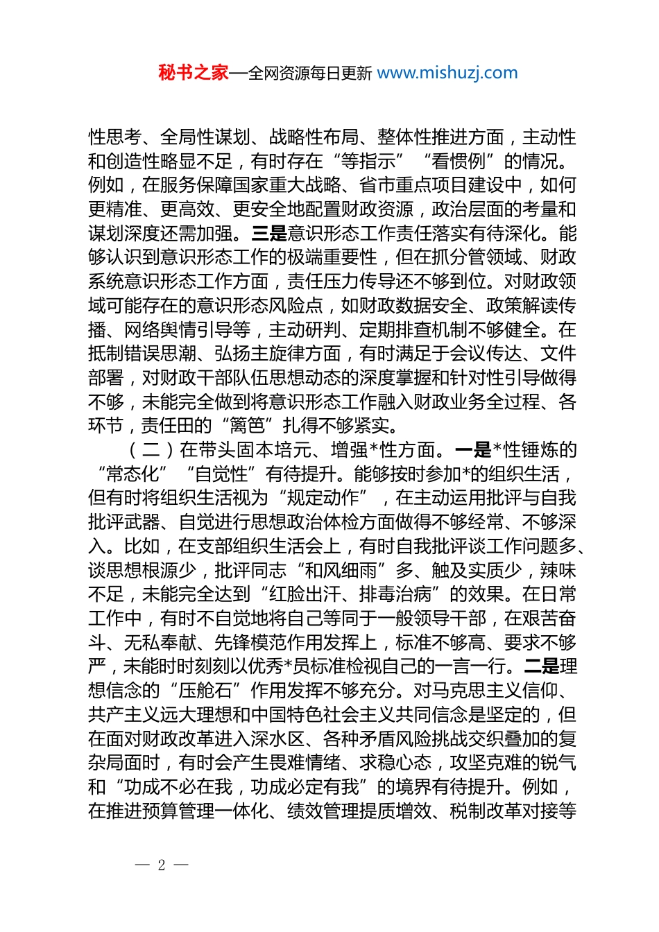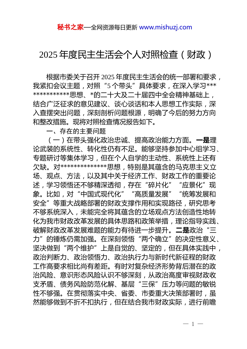 秘书之家—全网资源每日更新 www.mishuzj.com2025 年度民主生活会个人对照检查(财政)根据市委关于召开 2025 年度民主生活会的统一部署和要求,我紧扣会议主题,对照“5 个带头”具体要求,在深入学习**************思想、*的二十大及二十届四中全会精神基础上,结合广泛征求的意见建议、谈心谈话和本人思想工作实际,深入查摆突出问题,深刻剖析问题根源,明确了今后的努力方向和整改措施。现将对照检查情况报告如下。一、存在的主要问题(一)在带头强化政治忠诚、提高政治能力方面。一是理论武装的系统性、转化性仍有不足。能够坚持参加中心组学习、专题研讨等集体学习,但在个人自学的主动性、系统性上还有欠缺。对**************思想,特别是其蕴含的马克思主义立场、观点、方法,以及其中关于经济工作、财政工作的重要论述,学习领悟还不够精深透彻,存在“碎片化”“应景化”现象。比如,对“中国式现代化”“高质量发展”“统筹发展和安全”等重大战略部署的财政支撑作用和实现路径,研究思考不够系统深入,未能完全将其蕴含的立场观点方法创造性地转化为我市财政改革发展的具体思路和政策举措,理论指导实践、破解财政改革发展难题的能力有待进一步提升。二是政治“三力”的锤炼仍需加强。在深刻领悟“两个确立”的决定性意义、坚决做到“两个维护”上是自觉的、坚定的,但在具体实践中,政治判断力、政治领悟力、政治执行力与新时代新征程的财政工作高要求相比尚有差距。有时对复杂经济形势背后潜在的政治风险、意识形态风险认识不够深刻,从政治高度审视财政收支矛盾、债务风险防范化解、基层“三保”压力等问题的敏锐性不够强。在贯彻落实中央、省委、市委重大决策部署时,虽然能够做到不折不扣执行,但在结合我市财政实际,进行前瞻— 1 —秘书之家—全网资源每日更新 www.mishuzj.com性思考、全局性谋划、战略性布局、整体性推进方面,主动性和创造性略显不足,有时存在“等指示”“看惯例”的情况。例如,在服务保障国家重大战略、省市重点项目建设中,如何更精准、更高效、更安全地配置财政资源,政治层面的考量和谋划深度还需加强。三是意识形态工作责任落实有待深化。能够认识到意识形态工作的极端重要性,但在抓分管领域、财政系统意识形态工作方面,责任压力传导还不够到位。对财政领域可能存在的意识形态风险点,如财政数据安全、政策解读传播、网络舆情引导等,主动研判、定期排查机制不够健全。在抵制错误思潮、弘扬主旋律方面,有时满足于会议传达、文件部署,对财政干部队伍思想动态的深度掌握和针对性引导做得不够,未能完全做到将意识形态工作融入财政业务全过程、各环节,责任田的“篱笆”扎得不够紧实。(二)在带头固本培元、增强*性方面。一是*性锤炼的“常态化”“自觉性”有待提升。能够按时参加*的组织生活,但有时将组织生活视为“规定动作”,在主动运用批评与自我批评武器、自觉进行思想政治体检方面做得不够经常、不够深入。比如,在支部组织生活会上,有时自我批评谈工作问题多、谈思想根源少,批评同志“和风细雨”多、触及实质少,辣味不足,未能完全达到“红脸出汗、排毒治病”的效果。在日常工作中,有时不自觉地将自己等同于一般领导干部,在艰苦奋斗、无私奉献、先锋模范作用发挥上,标准不够高、要求不够严,未能时时刻刻以优秀*员标准检视自己的一言一行。二是理想信念的“压舱石”作用发挥不够充分。对马克思主义信仰、共产主义远大理想和中国特色社会主义共同信念是坚定的,但在面对财政改革进入深水区、各种矛盾风险挑战交织叠加的复杂局面时,有时会产生畏难情绪、求稳心态,攻坚克难的锐气和“功成不必在我,功成必定有我”的境界有待提升。例如,在推进预算管理一体化、绩效管理提质增效、税制改革对接等— 2 —秘书之家—全网资源每日更新 www.mishuzj.com硬骨头任务时,有时存在路径依赖,怕出错、怕担责,敢闯敢试、先行先试的劲头有所减弱,理想信念内化为推动财政事业攻坚克难的不竭动力还需要持续加强。三是组织观念和纪律规矩的“内化”尚有差距。能够自觉遵守*的组织原则,严格执行民主集中制,但在具体...