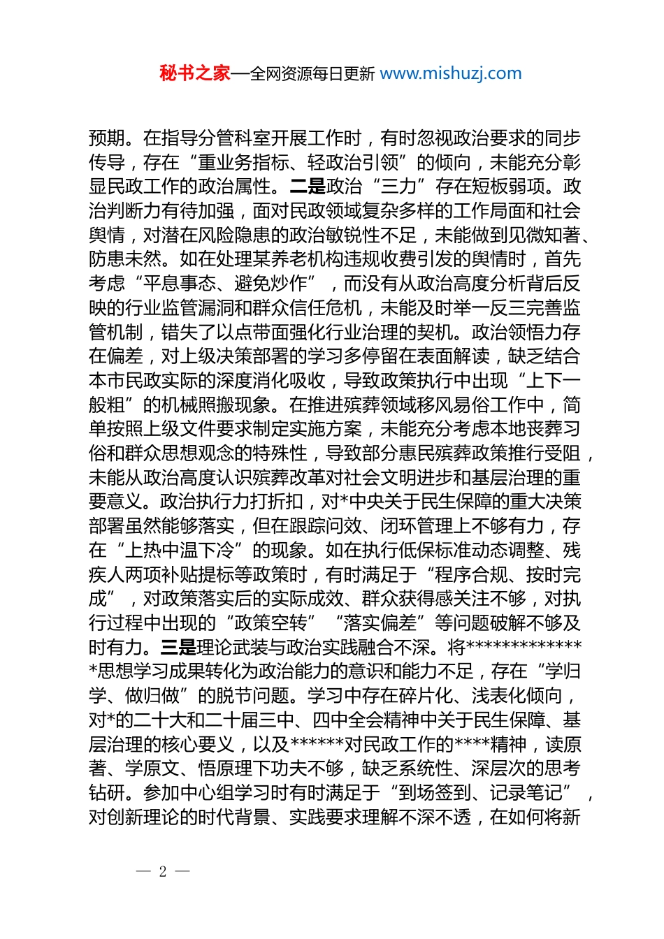 秘书之家—全网资源每日更新 www.mishuzj.com2025 年度民主生活会个人对照检查(民政)根据局*组关于召开 2025 年度专题民主生活会的统一部署,我紧扣“以**************思想为指导,深入学习贯彻*的二十大和二十届三中、四中全会精神,全面落实******对民政工作的****和全国民政会议部署,锤炼政治品格、提升履职能力、强化担当作为,奋力推动新时代民政事业高质量发展”的会议主题,严格遵循“学思想、强*性、重实践、建新功”总要求,坚持把理论学习、问题查摆、根源剖析、整改落实贯穿始终。通过个人自学、集中研讨、谈心谈话、征求意见等方式,广泛收集基层民政干部、服务对象、社会组织代表等各方面意见建议 x 条,深入查摆自身在思想、政治、能力、担当、作风、廉洁等方面存在的突出问题,深刻剖析问题根源,明确整改方向和具体措施。现将个人检视剖析情况汇报如下,恳请各位领导、同事批评指正。一、存在的主要问题(一)带头强化政治忠诚、提高政治能力方面。政治忠诚是*员干部的首要品质,政治能力是履职尽责的核心支撑。对照新时代*的建设总要求和民政工作的政治属性,自身仍存在政治素养锤炼不扎实、政治能力提升不全面的问题。一是政治忠诚的实践转化不够到位。能够始终坚定拥护“两个确立”、坚决做到“两个维护”,但在将政治忠诚融入民政工作全过程各方面时存在差距,对******关于民政工作“关系民生、连着民心”的重要论述蕴含的政治意义领悟不深,未能始终从“国之大者”的高度谋划推进分管工作。例如,在落实全国民政会议部署的“四个体系”建设要求时,更多聚焦业务层面的任务分解,对其保障民生福祉、巩固执政根基的政治价值思考不足,导致部分工作推进缺乏政治站位引领,落实效果未能完全达到— 1 —秘书之家—全网资源每日更新 www.mishuzj.com预期。在指导分管科室开展工作时,有时忽视政治要求的同步传导,存在“重业务指标、轻政治引领”的倾向,未能充分彰显民政工作的政治属性。二是政治“三力”存在短板弱项。政治判断力有待加强,面对民政领域复杂多样的工作局面和社会舆情,对潜在风险隐患的政治敏锐性不足,未能做到见微知著、防患未然。如在处理某养老机构违规收费引发的舆情时,首先考虑“平息事态、避免炒作”,而没有从政治高度分析背后反映的行业监管漏洞和群众信任危机,未能及时举一反三完善监管机制,错失了以点带面强化行业治理的契机。政治领悟力存在偏差,对上级决策部署的学习多停留在表面解读,缺乏结合本市民政实际的深度消化吸收,导致政策执行中出现“上下一般粗”的机械照搬现象。在推进殡葬领域移风易俗工作中,简单按照上级文件要求制定实施方案,未能充分考虑本地丧葬习俗和群众思想观念的特殊性,导致部分惠民殡葬政策推行受阻,未能从政治高度认识殡葬改革对社会文明进步和基层治理的重要意义。政治执行力打折扣,对*中央关于民生保障的重大决策部署虽然能够落实,但在跟踪问效、闭环管理上不够有力,存在“上热中温下冷”的现象。如在执行低保标准动态调整、残疾人两项补贴提标等政策时,有时满足于“程序合规、按时完成”,对政策落实后的实际成效、群众获得感关注不够,对执行过程中出现的“政策空转”“落实偏差”等问题破解不够及时有力。三是理论武装与政治实践融合不深。将**************思想学习成果转化为政治能力的意识和能力不足,存在“学归学、做归做”的脱节问题。学习中存在碎片化、浅表化倾向,对*的二十大和二十届三中、四中全会精神中关于民生保障、基层治理的核心要义,以及******对民政工作的****精神,读原著、学原文、悟原理下功夫不够,缺乏系统性、深层次的思考钻研。参加中心组学习时有时满足于“到场签到、记录笔记”,对创新理论的时代背景、实践要求理解不深不透,在如何将新— 2 —秘书之家—全网资源每日更新 www.mishuzj.com发展理念融入民政领域普惠性、基础性、兜底性民生建设方面,缺乏融会贯通的能力。例如,在推进居家和社区基本养老服务提升行动中,对******“积极应对人口老龄化国家战略”的理解停留在宏观层面,未能结合本市老龄化率高、空巢老人多的实际细化落实路径...