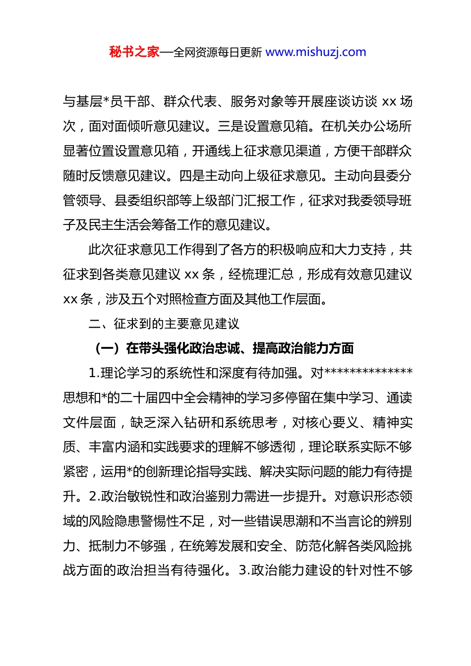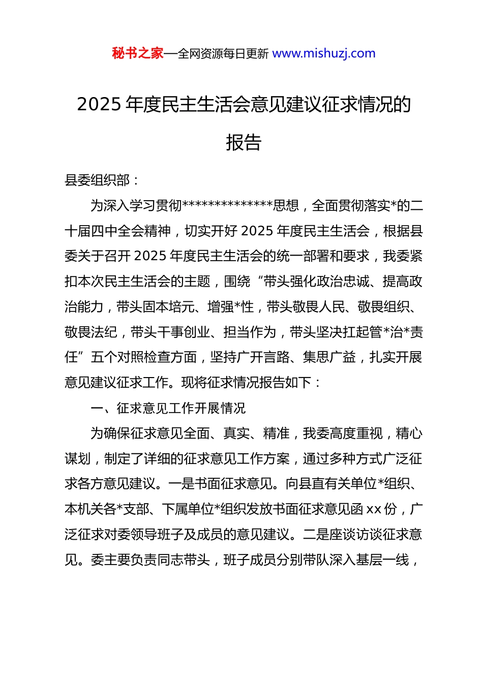 秘书之家—全网资源每日更新 www.mishuzj.com2025 年度民主生活会意见建议征求情况的报告县委组织部:为深入学习贯彻**************思想,全面贯彻落实*的二十届四中全会精神,切实开好 2025 年度民主生活会,根据县委关于召开 2025 年度民主生活会的统一部署和要求,我委紧扣本次民主生活会的主题,围绕“带头强化政治忠诚、提高政治能力,带头固本培元、增强*性,带头敬畏人民、敬畏组织、敬畏法纪,带头干事创业、担当作为,带头坚决扛起管*治*责任”五个对照检查方面,坚持广开言路、集思广益,扎实开展意见建议征求工作。现将征求情况报告如下:一、征求意见工作开展情况为确保征求意见全面、真实、精准,我委高度重视,精心谋划,制定了详细的征求意见工作方案,通过多种方式广泛征求各方意见建议。一是书面征求意见。向县直有关单位*组织、本机关各*支部、下属单位*组织发放书面征求意见函 xx 份,广泛征求对委领导班子及成员的意见建议。二是座谈访谈征求意见。委主要负责同志带头,班子成员分别带队深入基层一线,秘书之家—全网资源每日更新 www.mishuzj.com与基层*员干部、群众代表、服务对象等开展座谈访谈 xx 场次,面对面倾听意见建议。三是设置意见箱。在机关办公场所显著位置设置意见箱,开通线上征求意见渠道,方便干部群众随时反馈意见建议。四是主动向上级征求意见。主动向县委分管领导、县委组织部等上级部门汇报工作,征求对我委领导班子及民主生活会筹备工作的意见建议。此次征求意见工作得到了各方的积极响应和大力支持,共征求到各类意见建议 xx 条,经梳理汇总,形成有效意见建议xx 条,涉及五个对照检查方面及其他工作层面。二、征求到的主要意见建议(一)在带头强化政治忠诚、提高政治能力方面1.理论学习的系统性和深度有待加强。对**************思想和*的二十届四中全会精神的学习多停留在集中学习、通读文件层面,缺乏深入钻研和系统思考,对核心要义、精神实质、丰富内涵和实践要求的理解不够透彻,理论联系实际不够紧密,运用*的创新理论指导实践、解决实际问题的能力有待提升。2.政治敏锐性和政治鉴别力需进一步提升。对意识形态领域的风险隐患警惕性不足,对一些错误思潮和不当言论的辨别力、抵制力不够强,在统筹发展和安全、防范化解各类风险挑战方面的政治担当有待强化。3.政治能力建设的针对性不够秘书之家—全网资源每日更新 www.mishuzj.com强。在加强政治判断力、政治领悟力、政治执行力建设方面,缺乏具体有效的举措,部分班子成员在面对复杂问题时,从政治高度分析研判、推动解决问题的能力有待提高。(二)在带头固本培元、增强*性方面1.*性修养锤炼不够经常。对*内政治生活的重要性认识不够深刻,民主生活会、组织生活会上批评与自我批评不够“辣味”十足,存在避重就轻、隔靴搔痒的现象,未能真正达到红脸出汗、排毒治病的效果。2.理想信念教育形式较为单一。在开展理想信念教育、*性教育时,多以集中学习、观看教育片等传统形式为主,缺乏创新性和吸引力,难以充分激发*员干部的内生动力。3.担当精神和斗争精神有待强化。面对工作中的难点堵点问题,有时存在畏难情绪,缺乏“刀刃向内”的勇气和攻坚克难的锐气,在推动改革发展、破解发展难题中主动担当作为的意识不够强。(三)在带头敬畏人民、敬畏组织、敬畏法纪方面1.群众观念有所淡化。深入基层、深入群众调研不够经常,对群众的急难愁盼问题了解不够深入细致,服务群众的主动性、针对性不够强,解决群众反映强烈问题的效率和质量有待提升。2.对组织纪律的遵守不够严格。在执行组织制度、落实请示报告制度等方面,有时存在不够及时、不够规范的情秘书之家—全网资源每日更新 www.mishuzj.com况,对组织安排的工作有时存在推诿扯皮、敷衍塞责的现象。3.法纪意识和规矩意识需进一步增强。对法律法规和 dj*规的学习不够深入,运用法治思维和法治方式开展工作的能力有待提高,在日常工作中存在重业务、轻法纪的倾向。(四)在带头干事创业、担当作为方面1.推动高质量发展的举措不够有力。围绕贯彻落实*的二十届四中全会精神和县委决策部署,在谋划推动本领域重...