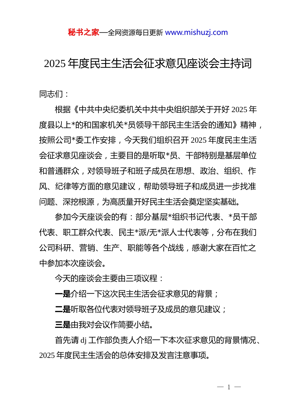 秘书之家—全网资源每日更新 www.mishuzj.com2025 年度民主生活会征求意见座谈会主持词同志们:根据《中共中央纪委机关中共中央组织部关于开好 2025 年度县以上*的和国家机关*员领导干部民主生活会的通知》精神,按照公司*委工作安排,今天我们组织召开 2025 年度民主生活会征求意见座谈会,主要目的是听取*员、干部特别是基层单位和普通群众,对领导班子和班子成员在思想、政治、组织、作风、纪律等方面的意见建议,帮助领导班子和成员进一步找准问题、深挖根源,为高质量开好民主生活会奠定坚实基础。参加今天座谈会的有:部分基层*组织书记代表、*员干部代表、职工群众代表、民主*派/无*派人士代表等,分布在我们公司科研、营销、生产、职能等各个战线,感谢大家在百忙之中参加本次座谈会。今天的座谈会主要由三项议程:一是介绍一下这次民主生活会征求意见的背景;二是听取各位代表对领导班子及成员的意见建议;三是由我对会议作简要小结。首先请 dj 工作部负责人介绍一下本次征求意见的背景情况、2025 年度民主生活会的总体安排及发言注意事项。— 1 —秘书之家—全网资源每日更新 www.mishuzj.com(dj 工作部负责人介绍毕)开好本次座谈会,对于开好民主生活会,加强领导班子自身建设、推动公司发展具有重要意义。希望大家能够本着对*的事业、对公司发展、对同志高度负责的态度,坚持问题导向,敞开心扉、畅所欲言,讲真话、说实话、心里话,重点围绕本次民主生活会的主题和对照检查的重点内容,结合工作实际和切身感受,实事求是、客观公正地提出意见建议。既可以谈对领导班子的整体看法,也可以谈对班子成员个人的具体建议;既可以直接指出存在的问题和不足,也可以提出改进的建议和措施。发言时请聚焦主题、突出重点,力求具体实在,避免空泛议论。对于大家提出的意见建议,我们将认真梳理汇总,原汁原味反馈给领导班子和每位成员,并将在民生生活会对照检查和整改落实中充分吸纳。下面,进行第二项议程,请各位代表依次发言。发言时间请尽量控制在 10 分钟以内。(根据现场情况,有序引导与会代表发言,按照会前安排的顺序进行。每位代表发言后,简单回应或“谢谢**同志提出的宝贵意见”)……(待所有代表发言毕)……— 2 —秘书之家—全网资源每日更新 www.mishuzj.com刚才,各位代表做了很好的发言。大家会前做了认真准备思考深入,提出的意见建议非常中肯,既有对领导班子整体工作的评价和建议,也有对班子成员个人在思想、政治、作风、纪律等方面的具体意见;既指出了当前工作中存在的一些突出问题和短板弱项,也提出了许多富有建设性的改进思路和具体措施。这些意见建议,饱含着大家对公司发展的深切关注和对领导班子及成员的真诚帮助,体现了高度的政治责任感和强烈的事业心。在此,我代表领导班子,向各位代表表示衷心的感谢!对于大家提出的意见建议,我们会认真对待。会后,请 dj工作部、公司办公室立即着手,对会上提出的以及通过其他渠道征集到的意见建议进行系统梳理、分类归纳,原汁原味地整理形成书面材料,及时报送领导班子和各位成员。领导班子和成员在接下来的学习研讨、谈心谈话、撰写对照检查材料等环节中,主动认领、深刻反思、深入剖析,并将这些意见建议作为查摆问题、开展批评、整改落实的重要依据。征求意见是开好民主生活会的前提,但是更为关键是抓好整改落实。领导班子将以此次民主生活会为契机,对征集的意见建议和自身查摆出的问题,列出清单、制定措施、明确时限、落实责任,切实抓好整改。对于能够立即解决的问题,立行立— 3 —秘书之家—全网资源每日更新 www.mishuzj.com改;对于需要一段时间解决的问题,明确阶段性目标,持续推进;对于涉及体制机制等深层次问题,加强研究,积极推动解决。整改情况将通过适当方式在一定范围内公开,接受大家监督。希望各位代表继续关心、支持领导班子的工作,通过多种渠道、多种形式随时提出意见建议,帮助我们更好改进工作、转变作风、推动发展。今天的座谈会到此结束,谢谢大家,散会!— 4 —