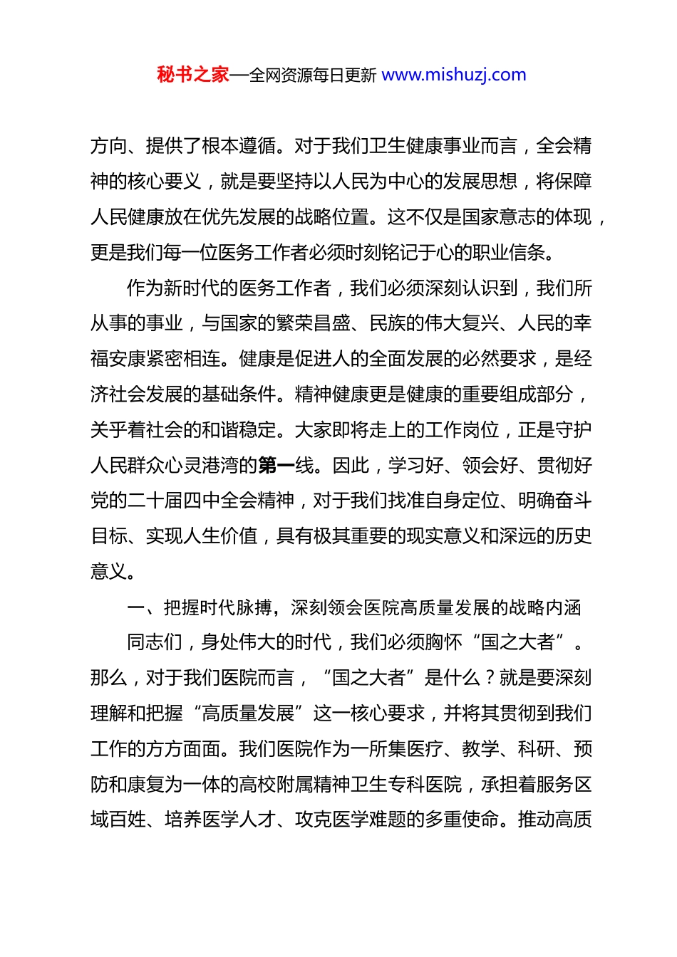 秘书之家—全网资源每日更新 www.mishuzj.com党课:坚定不移学习贯彻全会精神,以医院高质量发展推进健康中国建设 同志们,各位新同事:大家好!今天,我们在这里隆重举行新员工岗前培训,首先,我代表医院党总支和全体干部职工,向各位新同事的加入表示最热烈的欢迎!你们的到来,为我们这支守护人民群众精神健康的队伍注入了新鲜的血液,带来了新的希望与活力。你们选择加入我们,不仅是选择了一份职业,更是选择了一份沉甸甸的责任和使命。作为你们进入医院的第一堂课,我想和大家深入交流一个至关重要的话题,那就是如何将我们个人的职业理想,融入国家发展的宏伟蓝图之中,以实际行动推动医院的高质量发展,为健康中国建设贡献我们的力量。因此,我今天党课的主题是“坚定不移学习贯彻党的二十届四中全会精神,以医院高质量发展推进健康中国建设”。党的二十届四中全会,是在我们党团结带领全国各族人民迈上全面建设社会主义现代化国家新征程、向第二个百年奋斗目标进军的关键时刻,召开的一次具有里程碑意义的重要会议。全会擘画了未来发展的宏伟蓝图,为我们各行各业指明了前进秘书之家—全网资源每日更新 www.mishuzj.com方向、提供了根本遵循。对于我们卫生健康事业而言,全会精神的核心要义,就是要坚持以人民为中心的发展思想,将保障人民健康放在优先发展的战略位置。这不仅是国家意志的体现,更是我们每一位医务工作者必须时刻铭记于心的职业信条。作为新时代的医务工作者,我们必须深刻认识到,我们所从事的事业,与国家的繁荣昌盛、民族的伟大复兴、人民的幸福安康紧密相连。健康是促进人的全面发展的必然要求,是经济社会发展的基础条件。精神健康更是健康的重要组成部分,关乎着社会的和谐稳定。大家即将走上的工作岗位,正是守护人民群众心灵港湾的第一线。因此,学习好、领会好、贯彻好党的二十届四中全会精神,对于我们找准自身定位、明确奋斗目标、实现人生价值,具有极其重要的现实意义和深远的历史意义。一、把握时代脉搏,深刻领会医院高质量发展的战略内涵同志们,身处伟大的时代,我们必须胸怀“国之大者”。那么,对于我们医院而言,“国之大者”是什么?就是要深刻理解和把握“高质量发展”这一核心要求,并将其贯彻到我们工作的方方面面。我们医院作为一所集医疗、教学、科研、预防和康复为一体的高校附属精神卫生专科医院,承担着服务区域百姓、培养医学人才、攻克医学难题的多重使命。推动高质秘书之家—全网资源每日更新 www.mishuzj.com量发展,绝不是一句空洞的口号,而是关系到医院生存与发展的根本性课题。首先,高质量发展体现在服务质效的全面提升上。过去,我们衡量一家医院的好坏,可能更多地看它的规模有多大、床位有多少。但进入新发展阶段,人民群众对健康服务的需求已经从“有没有”转向“好不好”。我们必须清醒地认识到,量的扩张已非首要目标,质的飞跃才是关键所在。截至 2024 年底,我们医院开放床位已达到 1300 张,拥有在职医护人员 1650 余人,全年门急诊服务量超过 85 万人次,收治住院患者近 1.9 万人次,完成各类物理治疗与手术近 5 万例次。这些数据背后,是沉甸甸的责任与信任。但我们不能满足于此,我们追求的高质量,是让每一位患者都能感受到更安全、更有效、更温暖的医疗服务。这意味着,我们要持续优化诊疗流程,缩短患者等候时间,提升诊疗精准度。2024 年,我们的患者满意度综合得分达到了 96.2 分,医疗质量综合指数较前一年提升了 4.5 个百分点,这正是我们坚持以患者为中心、持续改进服务质量的初步成果。未来,我们要继续在改善患者就医体验、加强医患沟通、推行人性化服务等方面下更大功夫,让“以病人为中心”的理念真正内化于心、外化于行。其次,高质量发展体现在服务能级的持续优化上。精神卫秘书之家—全网资源每日更新 www.mishuzj.com生服务体系的建设,是国家卫生健康事业发展的重要一环。国家卫生健康委和*省卫健委近期密集出台了一系列关于推动精神卫生事业高质量发展的政策文件,明确要求要加强精神专科医院建设,构建从预防、治疗到康复的一体化服务网络。这为我们医院的...