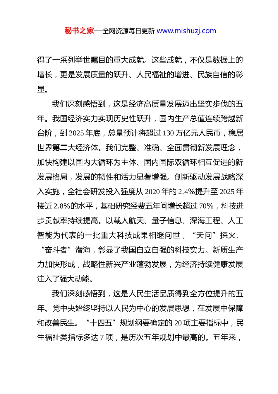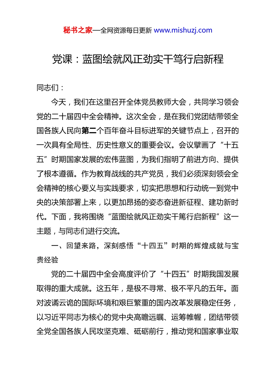 秘书之家—全网资源每日更新 www.mishuzj.com党课:蓝图绘就风正劲实干笃行启新程 同志们:今天,我们在这里召开全体党员教师大会,共同学习领会党的二十届四中全会精神。这次全会,是在我们党团结带领全国各族人民向第二个百年奋斗目标进军的关键节点上,召开的一次具有全局性、历史性意义的重要会议。会议擘画了“十五五”时期国家发展的宏伟蓝图,为我们指明了前进方向、提供了根本遵循。作为教育战线的共产党员,我们必须深刻领会全会精神的核心要义与实践要求,切实把思想和行动统一到党中央的决策部署上来,以更加昂扬的姿态奋进新征程、建功新时代。下面,我将围绕“蓝图绘就风正劲实干篤行启新程”这一主题,与同志们进行交流。一、回望来路,深刻感悟“十四五”时期的辉煌成就与宝贵经验党的二十届四中全会高度评价了“十四五”时期我国发展取得的重大成就。这五年,是极不寻常、极不平凡的五年。面对波谲云诡的国际环境和艰巨繁重的国内改革发展稳定任务,以习近平同志为核心的党中央高瞻远瞩、运筹帷幄,团结带领全党全国各族人民攻坚克难、砥砺前行,推动党和国家事业取秘书之家—全网资源每日更新 www.mishuzj.com得了一系列举世瞩目的重大成就。这些成就,不仅是数据上的增长,更是发展质量的跃升、人民福祉的增进、民族自信的彰显。我们深刻感悟到,这是经济高质量发展迈出坚实步伐的五年。我国经济实力实现历史性跃升,国内生产总值连续跨越新台阶,到 2025 年底,总量预计将超过 130 万亿元人民币,稳居世界第二大经济体。我们完整、准确、全面贯彻新发展理念,加快构建以国内大循环为主体、国内国际双循环相互促进的新发展格局,发展的韧性和活力显著增强。创新驱动发展战略深入实施,全社会研发投入强度从 2020 年的 2.4%提升至 2025 年接近 2.8%的水平,基础研究经费五年间增长超过 70%,科技进步贡献率持续提高。以载人航天、量子信息、深海工程、人工智能为代表的一批重大科技成果相继问世,“天问”探火、“奋斗者”潜海,彰显了我国自立自强的科技实力。新质生产力加快形成,战略性新兴产业蓬勃发展,为经济持续健康发展注入了强大动能。我们深刻感悟到,这是人民生活品质得到全方位提升的五年。党中央始终坚持以人民为中心的发展思想,在发展中保障和改善民生。“十四五”规划纲要确定的 20 项主要指标中,民生福祉类指标多达 7 项,是历次五年规划中最高的。五年来,秘书之家—全网资源每日更新 www.mishuzj.com民生领域财政投入累计近百万亿元,占全国一般公共预算支出的 70%以上。就业形势总体稳定,城镇新增就业每年都稳定在1200 万人以上。我们建成了世界上规模最大的社会保障体系,到 2025 年底,基本养老保险覆盖超过 10.7 亿人,基本医疗保险覆盖超过 13.3 亿人,人民群众的获得感、幸福感、安全感更加充实、更有保障、更可持续。居民人均可支配收入增长与经济增长基本同步,中等收入群体规模持续扩大,人民对美好生活的向往正在一步步变为现实。我们深刻感悟到,这是教育事业取得历史性成就、发生格局性变化的五年。教育是国之大计、党之大计。五年来,我国教育普及水平实现新提升,学前教育毛入园率超过 92%,九年义务教育巩固率达到 96%以上,高等教育毛入学率接近 65%,进入了世界公认的普及化阶段。劳动年龄人口平均受教育年限提高到 11.5 年,新增劳动力平均受教育年限更是超过 14 年,为建设现代化强国提供了坚实的人力资本支撑。教育公平迈出新步伐,城乡、区域、校际、群体间的教育差距持续缩小。教育质量实现新突破,立德树人根本任务得到有效落实,德智体美劳全面培养的教育体系更加完善。这些成就的取得,最根本在于有习近平总书记作为党中央的核心、全党的核心领航掌舵,在于有习近平新时代中国特色秘书之家—全网资源每日更新 www.mishuzj.com社会主义思想的科学指引。实践雄辩地证明,中国式现代化道路是符合中国国情、体现社会主义建设规律、顺应人类社会发展规律的康庄大道。我们作为党员教师,必须深刻认识“两个确立”的决定性意义,增强“四个意识”、坚定“四个自信”、做到“两个维护...