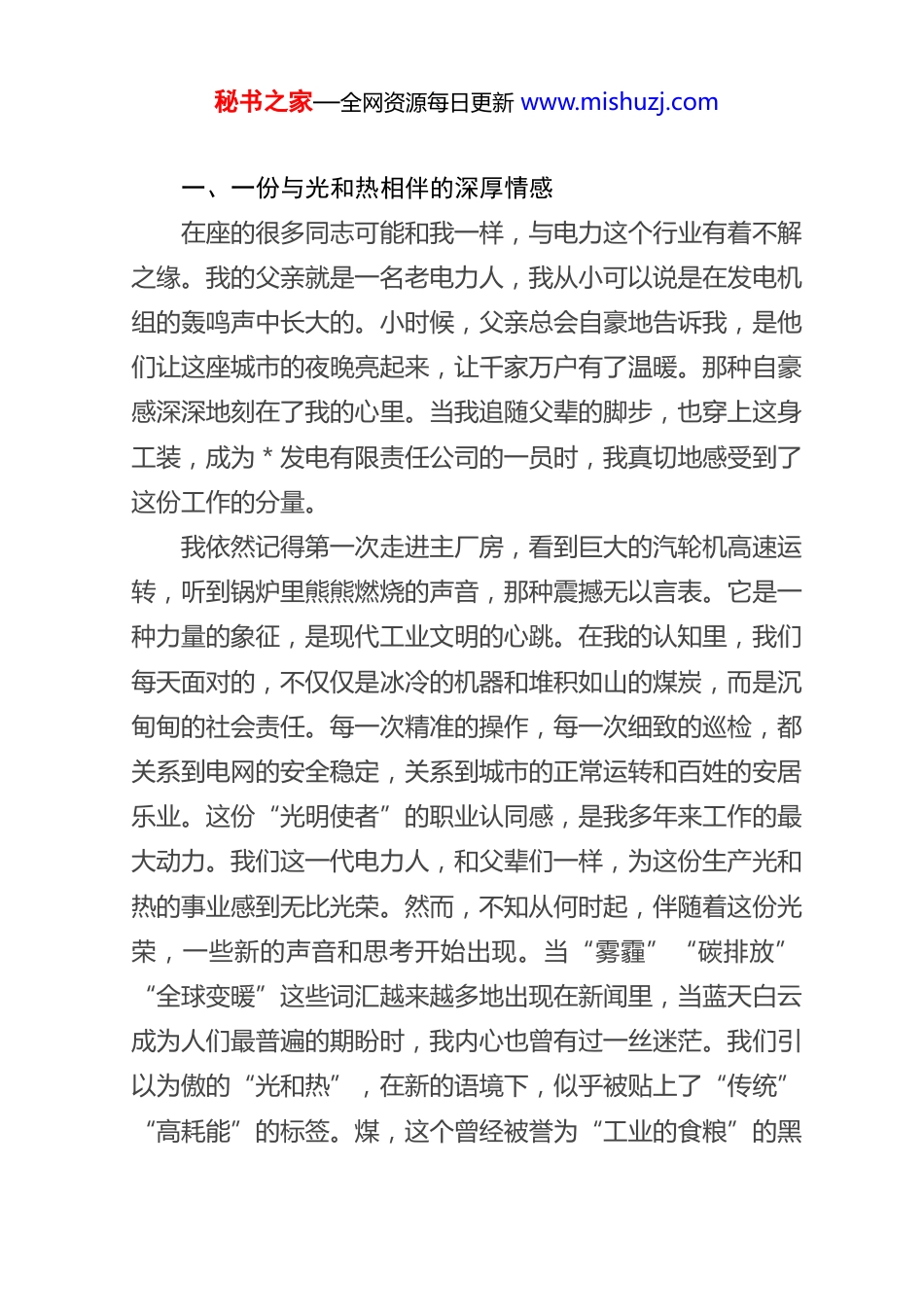 秘书之家—全网资源每日更新 www.mishuzj.com党 课 讲 稿 : 立 足 岗 位 , 拥 抱 变革 , 在 绿 色 转 型 中 书 写 奋 斗 新篇尊敬的各位领导,亲爱的党员同志们:大家好!今天,能有这样一个机会,作为一名普通的党员和一线的员工,站在这里和大家分享我个人的一些学习体会和思想感悟,我感到非常荣幸,也有些许紧张。这不像是在汇报工作,更像是一次心与心的交流。我想和大家聊聊的,不是什么高深的理论,而是我们每天身处其中的工作,以及这些工作背后,我所理解的时代变化和我们每个人的未来。今天我分享的主题是“立足岗位拥抱变革在绿色转型中书写奋斗新篇”。这个题目听起来或许有些大,但它源自我最近一段时间最真实、最深刻地感受。特别是公司组织学习了党的二十届四中全会精神后,我的内心受到了很大的触动。我想结合自己的经历,谈一谈我眼中的光荣与梦想,困惑与求索,以及最终找到的那份坚定与希望。秘书之家—全网资源每日更新 www.mishuzj.com一、一份与光和热相伴的深厚情感在座的很多同志可能和我一样,与电力这个行业有着不解之缘。我的父亲就是一名老电力人,我从小可以说是在发电机组的轰鸣声中长大的。小时候,父亲总会自豪地告诉我,是他们让这座城市的夜晚亮起来,让千家万户有了温暖。那种自豪感深深地刻在了我的心里。当我追随父辈的脚步,也穿上这身工装,成为*发电有限责任公司的一员时,我真切地感受到了这份工作的分量。我依然记得第一次走进主厂房,看到巨大的汽轮机高速运转,听到锅炉里熊熊燃烧的声音,那种震撼无以言表。它是一种力量的象征,是现代工业文明的心跳。在我的认知里,我们每天面对的,不仅仅是冰冷的机器和堆积如山的煤炭,而是沉甸甸的社会责任。每一次精准的操作,每一次细致的巡检,都关系到电网的安全稳定,关系到城市的正常运转和百姓的安居乐业。这份“光明使者”的职业认同感,是我多年来工作的最大动力。我们这一代电力人,和父辈们一样,为这份生产光和热的事业感到无比光荣。然而,不知从何时起,伴随着这份光荣,一些新的声音和思考开始出现。当“雾霾”“碳排放”“全球变暖”这些词汇越来越多地出现在新闻里,当蓝天白云成为人们最普遍的期盼时,我内心也曾有过一丝迷茫。我们引以为傲的“光和热”,在新的语境下,似乎被贴上了“传统”“高耗能”的标签。煤,这个曾经被誉为“工业的食粮”的黑秘书之家—全网资源每日更新 www.mishuzj.com色金子,也成了高碳的代名词。这种认知上的冲击,是真实而深刻的。我相信,这种感受,在座的许多同志或许也曾有过。我们未来的路,究竟在何方?我们这份与煤打了半辈子交道的事业,又将如何延续?二、从时代大局读懂绿色转型的必然趋势带着这些困惑,我认真学习了党的二十届四中全会精神。全会审议通过了《中共中央关于制定国民经济和社会发展第十五个五年规划的建议》,这不仅是为国家未来五年的发展擘画蓝图,也为我们每个人、每个行业指明了前进的方向。在全会提出的十二项重大战略部署中,有一项内容让我豁然开朗,也让我找到了解答内心困惑的钥匙。这就是第十项部署:“加快经济社会发展全面绿色转型,建设美丽中国”。这短短的一句话,分量千钧。它清晰地告诉我们,绿色发展不再仅仅是环保部门的要求,也不是一道可做可不做的选择题,而是贯穿于经济社会发展全局的系统性变革,是实现高质量发展的核心引擎。“十五五”时期,正是我们国家实现碳达峰目标的关键期和窗口期,推动经济社会发展全面绿色转型,是必须完成的硬任务。从能耗双控转向碳排放双控,以碳达峰碳中和为核心牵引协同推进降碳、减污、扩绿、增长,加快建设新型能源体系…… 这些部署,不再是遥远的概念,而是正在发生的现实。它意秘书之家—全网资源每日更新 www.mishuzj.com味着一场深刻的能源革命已经到来,也意味着像我们这样的传统煤电企业,正站在一个决定未来的十字路口。起初,我对“转型”这个词的理解是片面的,甚至有些悲观。我会想,转型是不是意味着要淘汰我们?是不是意味着我们的价值将被否定?但是,通过深入学习,我逐渐明白,转型不是对过去的否定,而是...