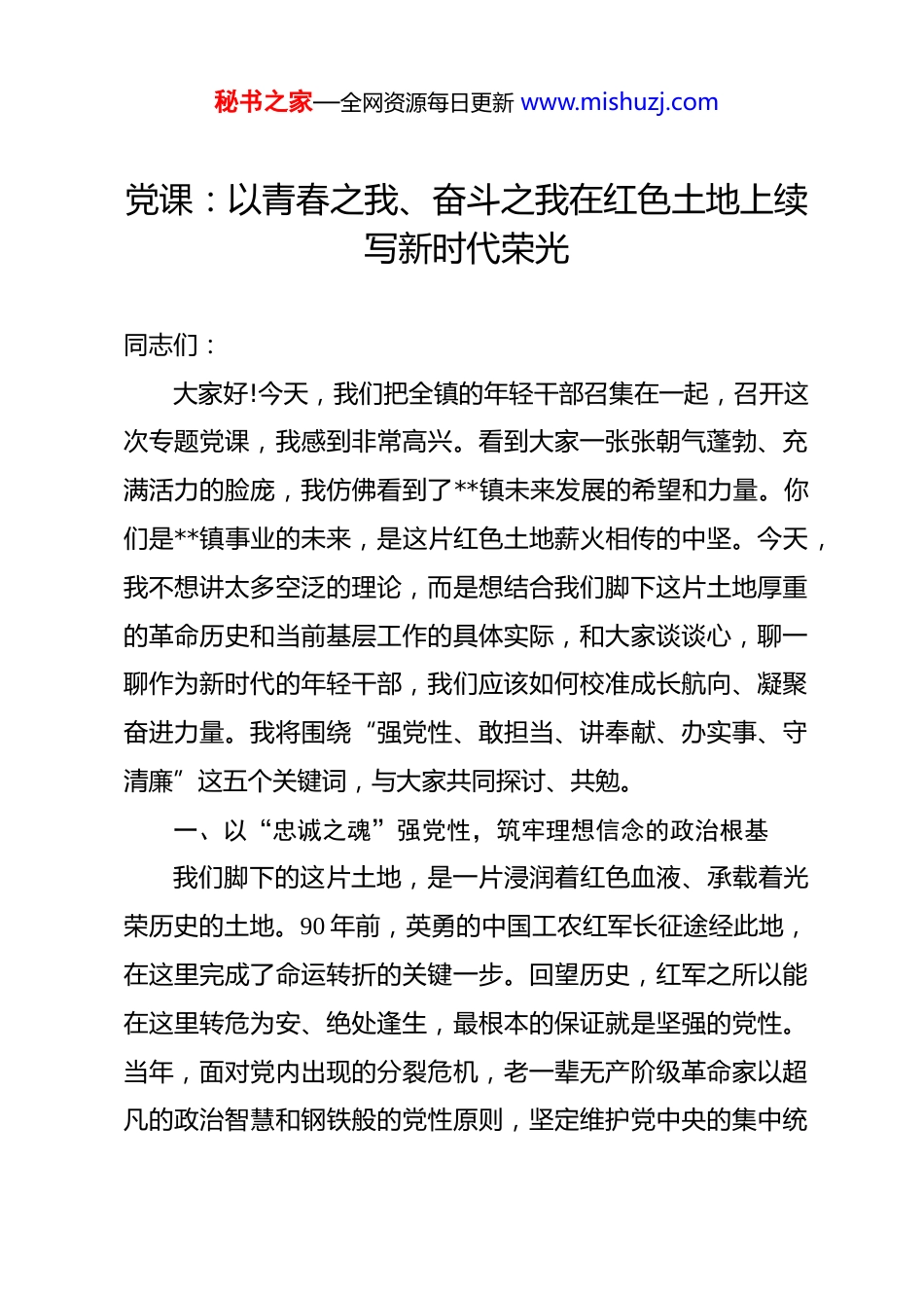 秘书之家—全网资源每日更新 www.mishuzj.com党课:以青春之我、奋斗之我在红色土地上续写新时代荣光 同志们:大家好!今天,我们把全镇的年轻干部召集在一起,召开这次专题党课,我感到非常高兴。看到大家一张张朝气蓬勃、充满活力的脸庞,我仿佛看到了**镇未来发展的希望和力量。你们是**镇事业的未来,是这片红色土地薪火相传的中坚。今天,我不想讲太多空泛的理论,而是想结合我们脚下这片土地厚重的革命历史和当前基层工作的具体实际,和大家谈谈心,聊一聊作为新时代的年轻干部,我们应该如何校准成长航向、凝聚奋进力量。我将围绕“强党性、敢担当、讲奉献、办实事、守清廉”这五个关键词,与大家共同探讨、共勉。一、以“忠诚之魂”强党性,筑牢理想信念的政治根基我们脚下的这片土地,是一片浸润着红色血液、承载着光荣历史的土地。90 年前,英勇的中国工农红军长征途经此地,在这里完成了命运转折的关键一步。回望历史,红军之所以能在这里转危为安、绝处逢生,最根本的保证就是坚强的党性。当年,面对党内出现的分裂危机,老一辈无产阶级革命家以超凡的政治智慧和钢铁般的党性原则,坚定维护党中央的集中统秘书之家—全网资源每日更新 www.mishuzj.com一领导,在**镇进行了著名的政治整训,统一了思想,凝聚了力量,最终作出了“到革命圣地去”的伟大战略抉择,引领中国革命走向了胜利。历史的烽烟虽已散尽,但党性原则的光芒却穿越时空,永远照耀着我们前行的道路。对我们在座的每一位年轻干部而言,讲党性,永远是立身、立业、立言、立德的基石,是必须牢牢守住的政治生命线。讲党性,首要是做到“政治过硬”。年轻干部身处基层一线,是党中央各项方针政策最终的执行者和落实力。我们的政治能力如何,直接关系到党的路线方针政策能否在基层落地生根、开花结果。因此,我们必须持续不断地加强政治理论学习,深刻领悟“两个确立”的决定性意义,增强“四个意识”、坚定“四个自信”、做到“两个维护”。要善于从纷繁复杂的矛盾中把握政治逻辑,不断提高政治判断力、政治领悟力、政治执行力。要始终心怀“国之大者”,自觉把我们**镇的工作放到全县、全市乃至全国的发展大局中去思考和谋划,确保我们前进的每一步都始终与党中央的步调保持高度一致,决不出现任何偏差。讲党性,核心是做到“信念坚定”。当年红军在历经千难万险、前途未卜的困境中,支撑他们作出“到革命圣地去”这一抉择的,是对共产主义的坚定信仰和对革命必将胜利的无比秘书之家—全网资源每日更新 www.mishuzj.com信心。这种信仰的力量,就是共产党人的精神之“钙”。我们年轻干部成长于和平年代,没有经历过血与火的考验,精神上容易缺“钙”。因此,我们更要自觉地、持续地补“钙”。要深入学习党史、新中国史、改革开放史、社会主义发展史,从党的百年奋斗历程中汲取信仰的力量。要时常叩问自己的入党初心,想一想“当初为什么出发”,看一看“现在走到了哪里”,明确“未来要走向何方”。只有理想信念的根基扎得深、扎得牢,我们在面对各种诱惑和挑战时,才能做到“风雨不动安如山”。讲党性,关键是做到“团结奋进”。当年红军在**镇进行大整编,各部队摒弃前嫌,凝聚成一个坚强的战斗集体,极大地增强了战斗力。这就是团结的力量。团结是党的生命,也是我们战胜一切困难的法宝。**镇是一个多民族聚居的乡镇,维护班子团结、干群团结、民族团结尤为重要。年轻干部有思想、有活力,但也容易有主见、有棱角。我希望大家能把这种个性和活力,更多地运用到开拓创新、干事创业上,而在集体中,要多一份顾全大局的胸怀,多一份相互补台的担当。要心往一处想、劲往一处使,大事讲原则、小事讲风格,在党委的统一领导下,形成众志成城、无坚不摧的强大合力,让党的旗帜,始终在这片光荣的红色土地上高高飘扬。秘书之家—全网资源每日更新 www.mishuzj.com二、以“攻坚之力”敢担当,勇挑改革发展的时代重担担当,是共产党人与生俱来的政治品格,更是从这片红色土地传承下来的英雄血脉。90 年前,红军将士在**镇休整之后,面对敌人的围追堵截,没有丝毫畏惧,毅然发起了当年那场扭转乾坤的关键战役...