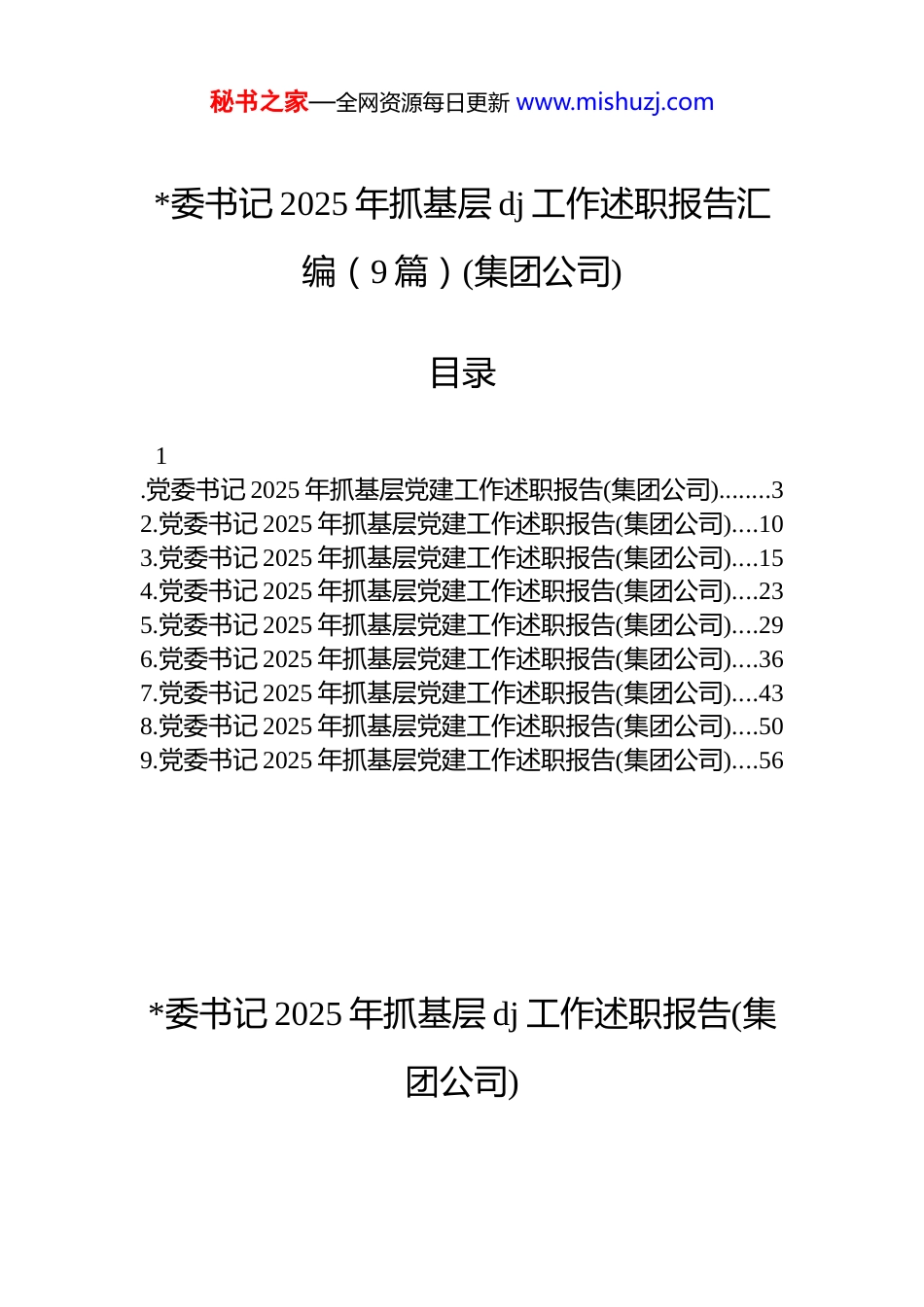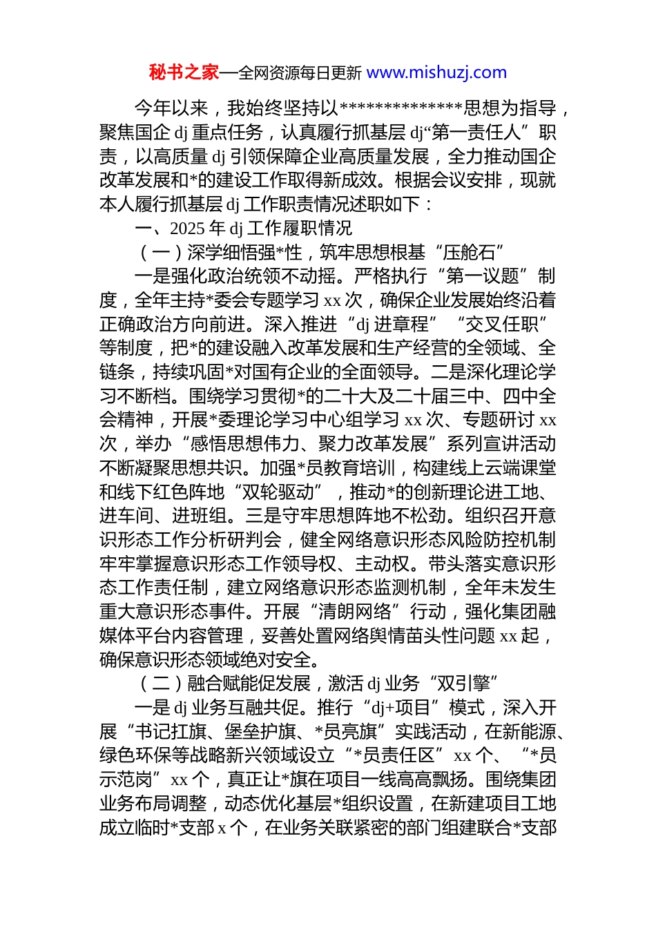 秘书之家—全网资源每日更新 www.mishuzj.com*委书记 2025 年抓基层 dj 工作述职报告汇编(9 篇)(集团公司)目录1.党委书记 2025 年抓基层党建工作述职报告(集团公司)........32.党委书记 2025 年抓基层党建工作述职报告(集团公司)....103.党委书记 2025 年抓基层党建工作述职报告(集团公司)....154.党委书记 2025 年抓基层党建工作述职报告(集团公司)....235.党委书记 2025 年抓基层党建工作述职报告(集团公司)....296.党委书记 2025 年抓基层党建工作述职报告(集团公司)....367.党委书记 2025 年抓基层党建工作述职报告(集团公司)....438.党委书记 2025 年抓基层党建工作述职报告(集团公司)....509.党委书记 2025 年抓基层党建工作述职报告(集团公司)....56*委书记 2025 年抓基层 dj 工作述职报告(集团公司)秘书之家—全网资源每日更新 www.mishuzj.com今年以来,我始终坚持以**************思想为指导,聚焦国企 dj 重点任务,认真履行抓基层 dj“第一责任人”职责,以高质量 dj 引领保障企业高质量发展,全力推动国企改革发展和*的建设工作取得新成效。根据会议安排,现就本人履行抓基层 dj 工作职责情况述职如下:一、2025 年 dj 工作履职情况(一)深学细悟强*性,筑牢思想根基“压舱石”一是强化政治统领不动摇。严格执行“第一议题”制度,全年主持*委会专题学习 xx 次,确保企业发展始终沿着正确政治方向前进。深入推进“dj 进章程”“交叉任职”等制度,把*的建设融入改革发展和生产经营的全领域、全链条,持续巩固*对国有企业的全面领导。二是深化理论学习不断档。围绕学习贯彻*的二十大及二十届三中、四中全会精神,开展*委理论学习中心组学习 xx 次、专题研讨 xx次,举办“感悟思想伟力、聚力改革发展”系列宣讲活动不断凝聚思想共识。加强*员教育培训,构建线上云端课堂和线下红色阵地“双轮驱动”,推动*的创新理论进工地、进车间、进班组。三是守牢思想阵地不松劲。组织召开意识形态工作分析研判会,健全网络意识形态风险防控机制牢牢掌握意识形态工作领导权、主动权。带头落实意识形态工作责任制,建立网络意识形态监测机制,全年未发生重大意识形态事件。开展“清朗网络”行动,强化集团融媒体平台内容管理,妥善处置网络舆情苗头性问题 xx 起,确保意识形态领域绝对安全。(二)融合赋能促发展,激活 dj 业务“双引擎”一是 dj 业务互融共促。推行“dj+项目”模式,深入开展“书记扛旗、堡垒护旗、*员亮旗”实践活动,在新能源、绿色环保等战略新兴领域设立“*员责任区”xx 个、“*员示范岗”xx 个,真正让*旗在项目一线高高飘扬。围绕集团业务布局调整,动态优化基层*组织设置,在新建项目工地成立临时*支部 x 个,在业务关联紧密的部门组建联合*支部秘书之家—全网资源每日更新 www.mishuzj.comx 个,确保业务开展到哪里、*组织就覆盖到哪里。二是先锋作用充分彰显。实施“*员领题破题”行动,组建由技术骨干、劳模工匠领衔的*员突击队 xx 支,在关键核心技术攻关中发挥“尖刀班”作用,全年攻克“卡脖子”技术难题xx 项。创新开展“首席讲技术”“*员骨干谈经验”等活动,建立“红色工匠”工作室,激发*员干部创新能力。与高校、科研院所开展共建活动,合作开展技术攻关项目 xx 项,*员牵头申报专利 xxx 项。三是人才效能持续释放。深化“三项制度”改革,实施“育鹰计划”,加大年轻干部选拔力度新提拔 xx 岁以下管理人员占比达 xx%。招录本科及以上学历毕业生 xxx 名,柔性引进院士 x 名,高层次人才 xx 名。完善 dj 与业务融合评价体系,将 dj 考核结果与领导班子和领导干部年度考核、经营业绩考核挂钩,权重提升至 xx%。开展“*员创新创效”金点子活动,收集合理化建议xxx 条,采纳实施 xxx 条,创造经济效益约 xxxx 万元。(三)强基固本夯基础,建强战斗堡垒“主阵地”一是聚焦强基固本。积极开展*支部标准化规范化建设“全面达标”行动,实施“清单化管理—项目化推进—常态化督导—标准化考核”的责任落实机制,推动 xx 项 dj 责任清单落实到位。制定《混...