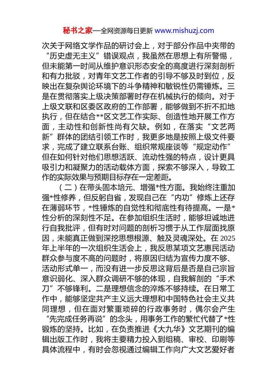 秘书之家—全网资源每日更新 www.mishuzj.com*组成员 2025 年度民主生活会个人对照检查材料(五个带头)根据区委关于召开 2025 年度民主生活会的统一部署,本人紧扣会议主题,在深入学习*的二十届三中、四中全会精神和******重要讲话精神的基础上,通过群众提、自己找、上级点、互相帮等多种方式,广泛征求意见建议,并与班子成员深入开展谈心谈话。在此基础上,我严格对照“五个带头”要求,深入查摆自身存在的差距和不足,深刻剖析问题根源,明确了今后的努力方向和整改措施。现将个人对照检查情况报告如下。一、存在的主要问题(一)在带头强化政治忠诚、提高政治能力方面。作为*组成员,我始终将政治建设摆在首位,深刻领悟“两个确立”的决定性意义,但在对标对表更高标准时,仍发现存在一些不足。一是在理论武装与文艺实践的结合上存在“温差”。对**************思想,特别是***文化思想的学习能够做到跟进及时、态度认真,但将宏大理论叙事转化为指导**区具体文艺工作的生动实践时,有时会感到思路不够开阔、方法不够鲜活。例如,在 2025 年组织筹划“放歌十五五”主题文艺创作系列活动时,最初的方案设计更多是对“十五五”规划建议中相关条文的图解式呈现对于如何用艺术语言深刻诠释新发展理念、展现高质量发展的人文内涵,思考得不够深入,导致初步构想的作品艺术感染力不足,后来在集体研讨中才得以深化和完善。二是政治敏锐性和鉴别力有待进一步增强。在日常工作中能够坚守政治原则,但在面对一些文艺领域出现的新思潮、新现象时,偶尔会存在“后知后觉”的情况。比如,在一秘书之家—全网资源每日更新 www.mishuzj.com次关于网络文学作品的研讨会上,对于部分作品中夹带的“历史虚无主义”错误观点,我虽然在思想上有所警惕,但未能第一时间从维护意识形态安全的高度进行深刻剖析和有力批驳,对青年文艺工作者的引导不够及时到位,反映出在复杂舆论环境下的斗争精神和敏锐性仍需锤炼。三是在贯彻落实上级决策部署时存在机械执行的倾向。对于上级文联和区委区政府的工作部署,能够做到不折不扣地执行,但在结合**区文艺工作实际、创造性地开展工作方面,主动性和创新性尚有欠缺。例如,在落实“文艺两新”群体的团结引领工作时,我更多地是按照上级文件要求,完成了建立联系台账、组织常规座谈等“规定动作”但在如何针对他们思想活跃、流动性强的特点,设计更具吸引力和凝聚力的活动载体方面,探索不够深入,导致工作的实际效果与预期目标存在一定差距。(二)在带头固本培元、增强*性方面。我始终注重加强*性修养,但反躬自省,发现自己在“内功”修炼上还存在薄弱环节,*性锤炼的自觉性和彻底性有待提高。一是*性分析的深刻性不足。在参加组织生活时,能够坦诚地进行自我批评,但有时对问题的剖析习惯于从工作层面找原因,未能真正做到深挖思想根源、触及灵魂深处。在 2025年上半年的一次组织生活会上,我反思某项文艺惠民活动群众参与度不高的问题时,将原因归结为宣传力度不够、活动形式单一,而没有进一步反思这背后是否是自己宗旨意识弱化、深入群众调研不够的体现,自我解剖的“手术刀”不够锋利。二是理想信念的淬炼不够持续。在日常工作中,能够坚定共产主义远大理想和中国特色社会主义共同理想,但在面对繁重琐碎的行政事务时,偶尔会产生“先完成任务再说”的念头,用事务工作的繁忙代替了*性锻炼的坚持。比如,在负责推进《大九华》文艺期刊的编辑出版工作时,我将主要精力投入到组稿、审校、印刷等具体流程中,有时会忽视通过编辑工作向广大文艺爱好者秘书之家—全网资源每日更新 www.mishuzj.com传播*的创新理论、弘扬社会主义核心价值观这一根本职责,把业务工作和 dj 工作割裂开来。三是在价值追求的坚守上偶有松懈。能够做到明大德、守公德、严私德,但在面对文艺界的一些不良风气时,有时态度不够鲜明、斗争不够坚决。例如,在一次文艺奖项的评审过程中,对于个别评委提出的“圈子化”“人情化”倾向的评审意见,我虽然内心不赞同,但考虑到“团结”和“和谐”,没有当场予以坚决抵制和纠正,而是采取了比较委婉的方式进行引导这实质...