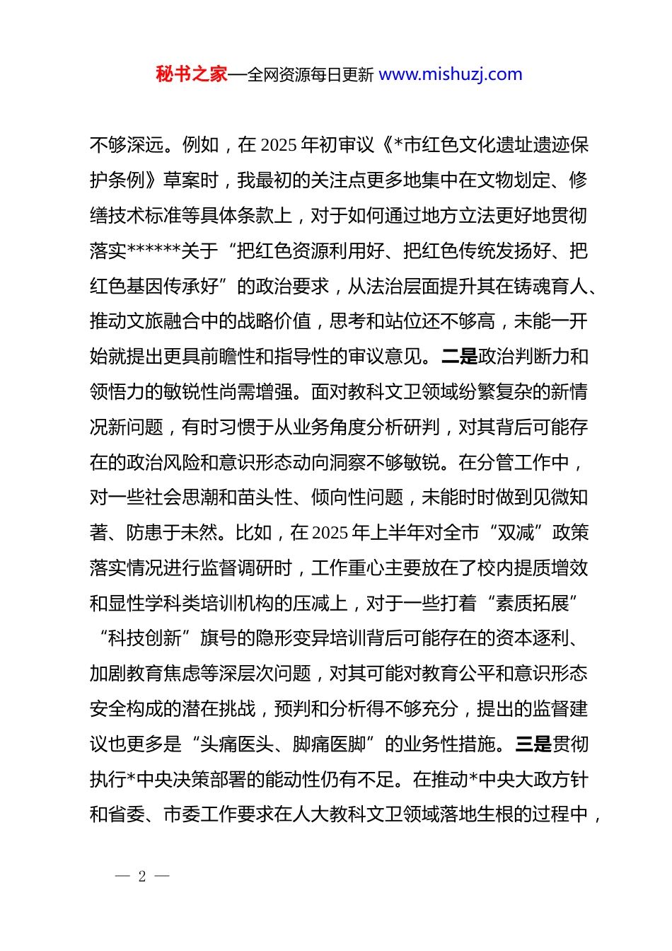 秘书之家—全网资源每日更新 www.mishuzj.com分管人大教科文卫工作市人大常委会副主任2025 年度民主生活会个人对照检查材料(五个带头)根据市委关于召开 2025 年度民主生活会的统一部署,我严格按照通知要求,在深入学习领会**************思想,特别是*的二十届三中、四中全会精神的基础上,紧紧围绕本次民主生活会主题,通过群众提、自己找、上级点、互相帮等多种方式,广泛征求意见建议,深入开展谈心谈话,全面梳理检视问题。现将个人对照检查情况报告如下。一、存在的主要问题(一)在带头强化政治忠诚、提高政治能力方面。一是理论武装的深度和转化率有待提升。尽管能够坚持参加常委会*组理论学习中心组的集体学习,但有时因分管领域工作繁杂、事务性会议和调研活动较多,对新思想、新理论、新论断的系统性钻研不够深入,特别是对*的二十大及二十届三中、四中全会精神中关于发展新质生产力、推进文化自信自强等重大部署,在如何与人大教科文卫工作精准结合、有效转化上思考谋划得— 1 —秘书之家—全网资源每日更新 www.mishuzj.com不够深远。例如,在 2025 年初审议《*市红色文化遗址遗迹保护条例》草案时,我最初的关注点更多地集中在文物划定、修缮技术标准等具体条款上,对于如何通过地方立法更好地贯彻落实******关于“把红色资源利用好、把红色传统发扬好、把红色基因传承好”的政治要求,从法治层面提升其在铸魂育人、推动文旅融合中的战略价值,思考和站位还不够高,未能一开始就提出更具前瞻性和指导性的审议意见。二是政治判断力和领悟力的敏锐性尚需增强。面对教科文卫领域纷繁复杂的新情况新问题,有时习惯于从业务角度分析研判,对其背后可能存在的政治风险和意识形态动向洞察不够敏锐。在分管工作中,对一些社会思潮和苗头性、倾向性问题,未能时时做到见微知著、防患于未然。比如,在 2025 年上半年对全市“双减”政策落实情况进行监督调研时,工作重心主要放在了校内提质增效和显性学科类培训机构的压减上,对于一些打着“素质拓展”“科技创新”旗号的隐形变异培训背后可能存在的资本逐利、加剧教育焦虑等深层次问题,对其可能对教育公平和意识形态安全构成的潜在挑战,预判和分析得不够充分,提出的监督建议也更多是“头痛医头、脚痛医脚”的业务性措施。三是贯彻执行*中央决策部署的能动性仍有不足。在推动*中央大政方针和省委、市委工作要求在人大教科文卫领域落地生根的过程中,— 2 —秘书之家—全网资源每日更新 www.mishuzj.com有时存在“等靠要”思想,主动谋划、创新落实的劲头不足,反应速度和执行力度与新形势新任务的要求相比存在一定差距。国家“十四五”规划中明确提出要加快建设高质量教育体系,但我市在优化教育资源布局、破解“城乡教育差异”等难题上进展相对缓慢。作为分管领导,尽管多次在调研中强调这些问题的重要性,但通过人大监督职能,创造性地设置监督议题、运用专题询问、组织代表约见等多种方式,持续用力、一督到底的韧劲还不够,未能更有力地推动政府及相关部门拿出更具突破性的解决方案。(二)在带头固本培元、增强*性方面。一是*性修养的自觉性锤炼得不够。在工作实践中,有时不自觉地将人大业务工作与*性锻炼割裂开来,认为只要履职尽责、完成任务就是*性强的表现,而忽视了在处理复杂矛盾、面对艰巨任务时对*性原则的内省和坚守。对严格执行双重组织生活制度存在认识偏差,因工作繁忙偶尔会“选择性”参加所在*支部的活动,即便参加了,也多是听取情况、布置工作,真正以一名普通*员身份投入其中、接受教育和监督做得不够。在开展批评和自我批评时,有时碍于情面,对同志的缺点只作笼统提醒,对自己的问题也多是谈工作不足、少谈思想根源,缺乏“红脸出汗”的辣味。— 3 —秘书之家—全网资源每日更新 www.mishuzj.com二是在攻坚克难中砥砺理想信念的韧劲不足。面对教科文卫领域的一些深层次改革难题,如公立医院高质量发展中面临的体制机制障碍、中医药传承创新发展中人才匮乏等“硬骨头”,虽然深知其重要性和紧迫性,但在持续推进监督、寻求破解之道的过程中,有时会产生畏难情绪和急躁心态。当一...