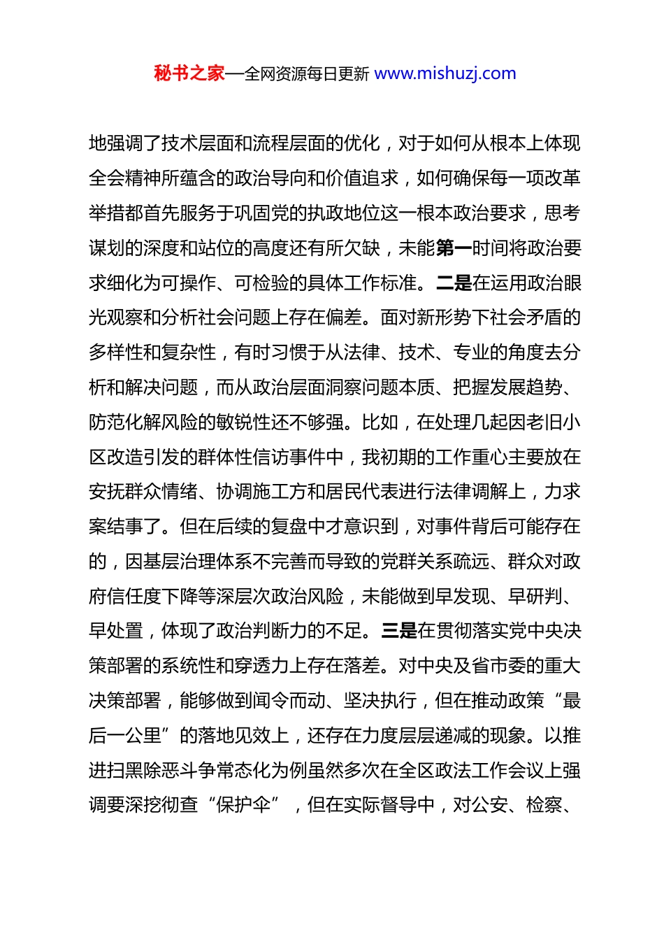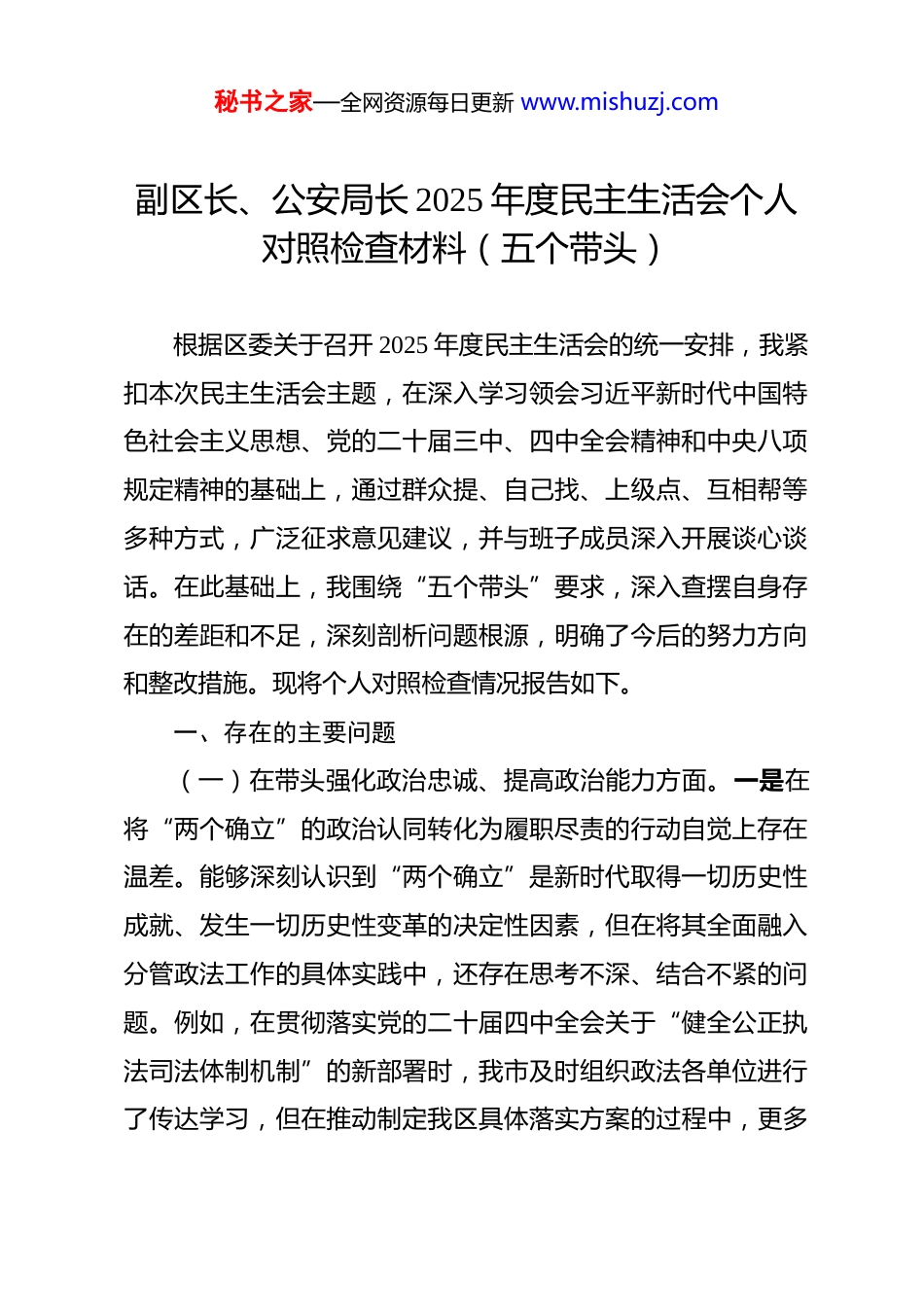 秘书之家—全网资源每日更新 www.mishuzj.com副区长、公安局长 2025 年度民主生活会个人对照检查材料(五个带头)根据区委关于召开 2025 年度民主生活会的统一安排,我紧扣本次民主生活会主题,在深入学习领会习近平新时代中国特色社会主义思想、党的二十届三中、四中全会精神和中央八项规定精神的基础上,通过群众提、自己找、上级点、互相帮等多种方式,广泛征求意见建议,并与班子成员深入开展谈心谈话。在此基础上,我围绕“五个带头”要求,深入查摆自身存在的差距和不足,深刻剖析问题根源,明确了今后的努力方向和整改措施。现将个人对照检查情况报告如下。一、存在的主要问题(一)在带头强化政治忠诚、提高政治能力方面。一是在将“两个确立”的政治认同转化为履职尽责的行动自觉上存在温差。能够深刻认识到“两个确立”是新时代取得一切历史性成就、发生一切历史性变革的决定性因素,但在将其全面融入分管政法工作的具体实践中,还存在思考不深、结合不紧的问题。例如,在贯彻落实党的二十届四中全会关于“健全公正执法司法体制机制”的新部署时,我市及时组织政法各单位进行了传达学习,但在推动制定我区具体落实方案的过程中,更多秘书之家—全网资源每日更新 www.mishuzj.com地强调了技术层面和流程层面的优化,对于如何从根本上体现全会精神所蕴含的政治导向和价值追求,如何确保每一项改革举措都首先服务于巩固党的执政地位这一根本政治要求,思考谋划的深度和站位的高度还有所欠缺,未能第一时间将政治要求细化为可操作、可检验的具体工作标准。二是在运用政治眼光观察和分析社会问题上存在偏差。面对新形势下社会矛盾的多样性和复杂性,有时习惯于从法律、技术、专业的角度去分析和解决问题,而从政治层面洞察问题本质、把握发展趋势、防范化解风险的敏锐性还不够强。比如,在处理几起因老旧小区改造引发的群体性信访事件中,我初期的工作重心主要放在安抚群众情绪、协调施工方和居民代表进行法律调解上,力求案结事了。但在后续的复盘中才意识到,对事件背后可能存在的,因基层治理体系不完善而导致的党群关系疏远、群众对政府信任度下降等深层次政治风险,未能做到早发现、早研判、早处置,体现了政治判断力的不足。三是在贯彻落实党中央决策部署的系统性和穿透力上存在落差。对中央及省市委的重大决策部署,能够做到闻令而动、坚决执行,但在推动政策“最后一公里”的落地见效上,还存在力度层层递减的现象。以推进扫黑除恶斗争常态化为例虽然多次在全区政法工作会议上强调要深挖彻查“保护伞”,但在实际督导中,对公安、检察、秘书之家—全网资源每日更新 www.mishuzj.com法院等部门的协同作战机制建设抓得比较紧,而对于如何推动纪检监察机关与政法机关在线索移交、协同办案方面建立更深层次、更高效的联动机制,所做的具体协调和制度设计还不够深入,导致个别案件在“打财断血”和深挖彻查环节进展相对缓慢,影响了整体斗争成效的进一步巩固和深化。(二)在带头固本培元、增强党性方面。一是在理论学习的深化内化上仍有不足。虽然能够坚持参加区委中心组学习和政府党组的集体学习,但有时存在“学过等于学好”的错误认识,满足于完成“规定动作”,在个人自学上投入的时间和精力还不够。特别是对习近平新时代中国特色社会主义思想的一些原创性理论、战略性思想,满足于知其然,对其所以然,所以必然的内在逻辑和深刻内涵,钻研得不够透彻。比如,在学习习近平法治思想时,对“坚持全面依法治国”的“十一个坚持”能够熟知熟记,但在如何运用其世界观和方法论去指导解决我区法治政府建设中遇到的实际难题,如行政执法“宽松软”与优化营商环境之间的平衡问题,思考和探索还不够深入,理论联系实际的能力有待进一步加强。二是在党性分析的经常性和深刻性上仍有不足。参加组织生活会时,能够坦诚地进行批评和自我批评,但会后主动“照镜子、正衣冠”的自觉性还不够。有时以工作繁忙为借口,静下心来反思自己思想动态、秘书之家—全网资源每日更新 www.mishuzj.com审视自己党性修养的时候不多,对于一些苗头性、倾向性问题,没能及时进行深入的自我剖...