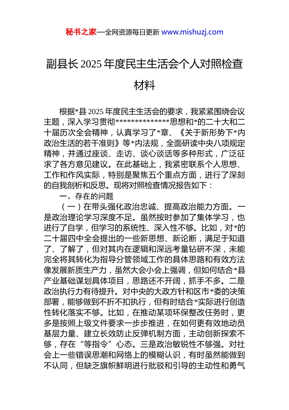 秘书之家—全网资源每日更新 www.mishuzj.com副县长 2025 年度民主生活会个人对照检查材料根据*县 2025 年度民主生活会的要求,我紧紧围绕会议主题,深入学习贯彻**************思想和*的二十大和二十届历次全会精神,认真学习了*章、《关于新形势下*内政治生活的若干准则》等*内法规,全面研读中央八项规定精神,并通过座谈、走访、谈心谈话等多种形式,广泛征求了各方意见建议。在此基础上,我紧密联系个人思想、工作和作风实际,特别是聚焦五个重点方面,进行了深刻的自我剖析和反思。现将对照检查情况报告如下:一、存在的问题(一)在带头强化政治忠诚、提高政治能力方面。一是政治理论学习深度不足。虽然按时参加了集体学习,也进行了自学,但学习的系统性、深入性不够。比如,对*的二十届四中全会提出的一些新思想、新论断,满足于知道了、了解了,但对其内在逻辑和深远考量钻研不深,未能完全将其转化为指导分管领域工作的具体思路和有效方法像发展新质生产力,虽然大会小会上强调,但如何结合*县产业基础谋划具体项目,思路还不开阔,抓手不多。二是政治执行力有待提升。对中央的大政方针和区市*委的决策部署,能够做到不折不扣执行,但有时结合*实际进行创造性转化落实不够。比如,在推动某项环保整改任务时,更多是按照上级文件要求一步步推进,在如何更有效地动员基层力量、建立长效防止反弹机制方面,主动创新探索不够,存在“等指令”心态。三是政治敏锐性不够强。对社会上一些错误思潮和网络上的模糊认识,有时虽然能做到不认同,但缺乏旗帜鲜明进行批驳和引导的主动性和勇气秘书之家—全网资源每日更新 www.mishuzj.com比如,在看到一些关于否定我县脱贫攻坚成就的片面言论时,大多时候只是内心不认同,很少主动站出来发声亮剑以正视听。(二)在带头固本培元、增强*性方面。一是*性修养不够坚定。随着工作事务增多,有时不自觉地放松了对主观世界的改造,艰苦奋斗的精神有所减退。比如,下基层调研,有时潜意识里会希望条件好一点,安排周到一点,对艰苦环境的适应力不如从前。开展批评与自我批评有时“辣味”不足,在班子民主生活会上,对同志的批评多是“希望式”“建议式”,怕伤和气、影响团结,动真碰硬的勇气不足。二是联系群众不够紧密。存在“事务主义”倾向,忙于开会、处理文件的时间多,静下心来深入田间地头、农户家中,与群众面对面拉家常、听真话的时间相对不足。比如,我们县里推动的某个特色种植项目,前期论证觉得挺好,但实际推广中部分群众有疑虑,参与度不高,后来深入了解才发觉,是我们对群众具体的收益预期技术掌握难度等现实顾虑摸底不透,说明“从群众中来、到群众中去”的工作方法落实还不到位。三是对组织的忠诚度有待加强。虽然能服从组织安排,但有时在面对一些急难险重任务时,内心也会闪过畏难情绪。比如,去年组织安排我牵头负责一项历史遗留问题的化解攻坚,初期心里确实有过打鼓,担心处理不好惹麻烦,这说明在关键时刻对组织的绝对忠诚、无条件服从意识还需要进一步锤炼。(三)在带头敬畏人民、敬畏组织、敬畏法纪方面。一是服务群众的意识有待增强。虽然有为群众办事的意愿但有时“官本位”思想仍有残留,未能始终将群众满意度作为最高标准。比如,在处理一些信访积案时,有时过于强调程序合规,对群众反映的核心诉求背后的实际困难体察不够,导致问题解决周期长,群众获得感不强。这说明“敬畏人民”的观念还未完全融入血脉。二是法纪观念有待强化。能够遵守 d 的纪律和国家法律法规,但在一些细节秘书之家—全网资源每日更新 www.mishuzj.com上自我要求不够严格。比如,在公务接待中,虽然明确要求不超标,但有时碍于情面,担心接待不周,对个别可能超标的环节提醒、制止不够坚决,存在“差不多就行”的侥幸心理。对分管部门干部在日常纪律执行上的“小毛病”,如偶尔迟到早退、工作效率不高等,有时批评教育不够严厉,存在“老好人”思想,影响了纪律的刚性约束力。三是对组织的敬畏之心体现不足。在执行组织决议、报告个人有关事项时,虽然能按规定办,但有时思考如何“避重就轻”“报喜不报忧”的潜意识还在...