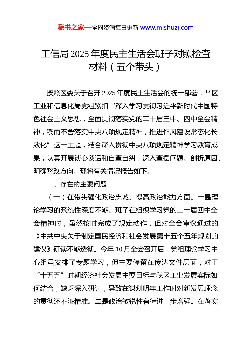 秘书之家—全网资源每日更新 www.mishuzj.com工信局 2025 年度民主生活会班子对照检查材料(五个带头)按照区委关于召开 2025 年度民主生活会的统一部署,**区工业和信息化局党组紧扣“深入学习贯彻习近平新时代中国特色社会主义思想,全面贯彻落实党的二十届三中、四中全会精神,锲而不舍落实中央八项规定精神,推进作风建设常态化长效化”这一主题,结合深入贯彻中央八项规定精神学习教育成果,认真开展谈心谈话和自查自纠,深入查摆问题、剖析原因、明确整改方向。现将有关情况报告如下。一、存在的主要问题(一)在带头强化政治忠诚、提高政治能力方面。一是理论学习的系统性深度不够。班子在组织学习党的二十届四中全会精神时,虽然按时完成了规定动作,但对全会审议通过的《中共中央关于制定国民经济和社会发展第十五个五年规划的建议》研读不够透彻。今年 10 月全会召开后,党组理论学习中心组虽安排了专题学习,但主要停留在传达文件层面,对于“十五五”时期经济社会发展主要目标与我区工业发展实际如何结合,缺乏深入研讨,导致在谋划明年工作时对新发展理念的贯彻还不够精准。二是政治敏锐性有待进一步增强。在落实秘书之家—全网资源每日更新 www.mishuzj.com上级重大决策部署时,有时存在机械执行的倾向。今年上半年,省里部署推进新型工业化相关工作,班子在制定实施方案时,对标对表不够主动,存在等上级细化要求的思想。在推进制造业数字化转型工作中,对工信部印发的《信息化和工业化融合2025 年工作要点》学习研究不够及时,在落实“人工智能+制造”行动方面行动迟缓,工作部署滞后于兄弟县区。三是政治站位把握还不够精准。在研究工业经济发展问题时,有时过于关注经济指标完成情况,对贯彻新发展理念、推动高质量发展的政治要求理解把握不够到位。年初在讨论全区规上工业增加值目标时,部分班子成员偏重于数量增长,对如何通过产业结构优化提升发展质量关注不足,在推进传统产业改造升级与培育新兴产业协调发展方面思路不够清晰。(二)在带头固本培元、增强党性方面。一是思想淬炼的自觉性不够强。在参加深入贯彻中央八项规定精神学习教育过程中,部分班子成员对学习教育的重大意义认识不够深刻,存在应付过关的思想。今年 3 月至 7 月开展学习教育期间,个别同志把学习教育简单理解为读文件、写心得,对习近平总书记关于加强党的作风建设的重要论述学习不够系统,未能真正做到入脑入心、融会贯通。二是理想信念教育的针对性有待加强。班子在组织党性教育活动时,形式较为单一,主要以集中学习、秘书之家—全网资源每日更新 www.mishuzj.com观看专题片为主,缺乏结合工信系统特点开展的针对性教育活动。今年组织党员干部参观红色教育基地时,行程安排较为紧凑,学习交流时间不足,部分同志反映教育效果不够理想,未能很好地将红色精神转化为推动工业高质量发展的内生动力。三是世界观、人生观、价值观的改造还需持续深化。在面对工业发展与生态保护的矛盾时,班子有时表现出急功近利的倾向。在审议某企业技改项目时,班子更多关注项目的经济效益和投资规模,对项目可能产生的环境影响研判不够充分,对“绿水青山就是金山银山”理念贯彻不够彻底,反映出发展理念还需要进一步转变。(三)在带头敬畏人民、敬畏组织、敬畏法纪方面。一是践行群众路线的主动性有欠缺。在落实“四下基层”制度方面,班子成员深入企业调研的频次和质量还需提升。今年开展惠企政策宣讲工作时,主要采取集中培训的方式,对中小微企业的个性化需求了解不够深入。在走访辖区规上工业企业时,部分调研流于表面,停留在听汇报、看材料层面,对企业在用工、融资、市场开拓等方面的实际困难掌握不够全面。二是民主集中制执行还不够规范。在重大事项决策过程中,个别情况下存在酝酿不够充分的现象。今年研究某项产业扶持资金分配方案时,会前征求意见环节时间较短,部分班子成员对方案细节了秘书之家—全网资源每日更新 www.mishuzj.com解不够,讨论时发言不够充分,影响了集体决策的质量。在执行请示报告制度方面,个别事项存在事后补报的情况。三是依法行政意识还需进一步...