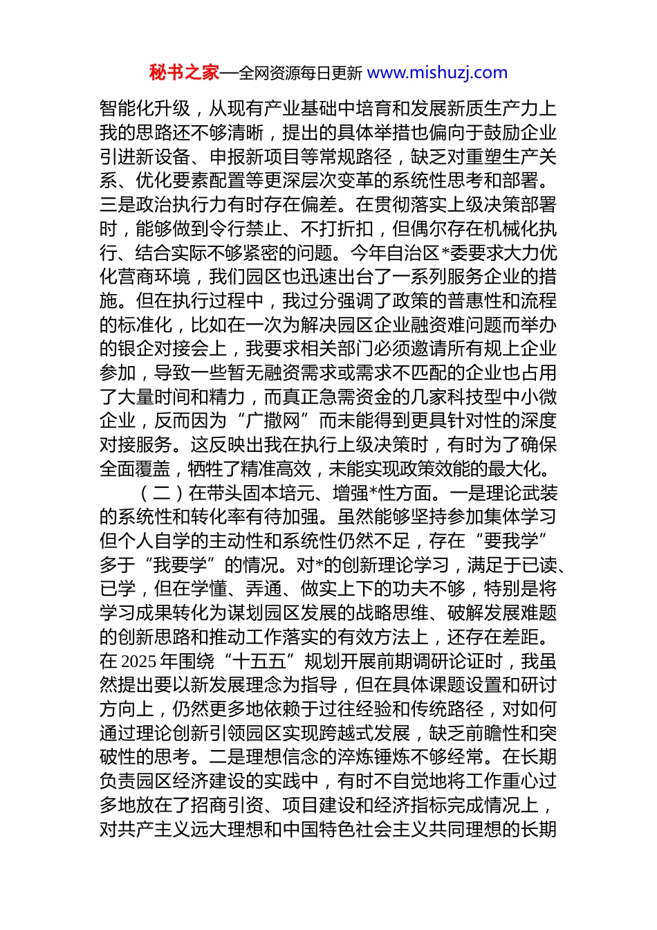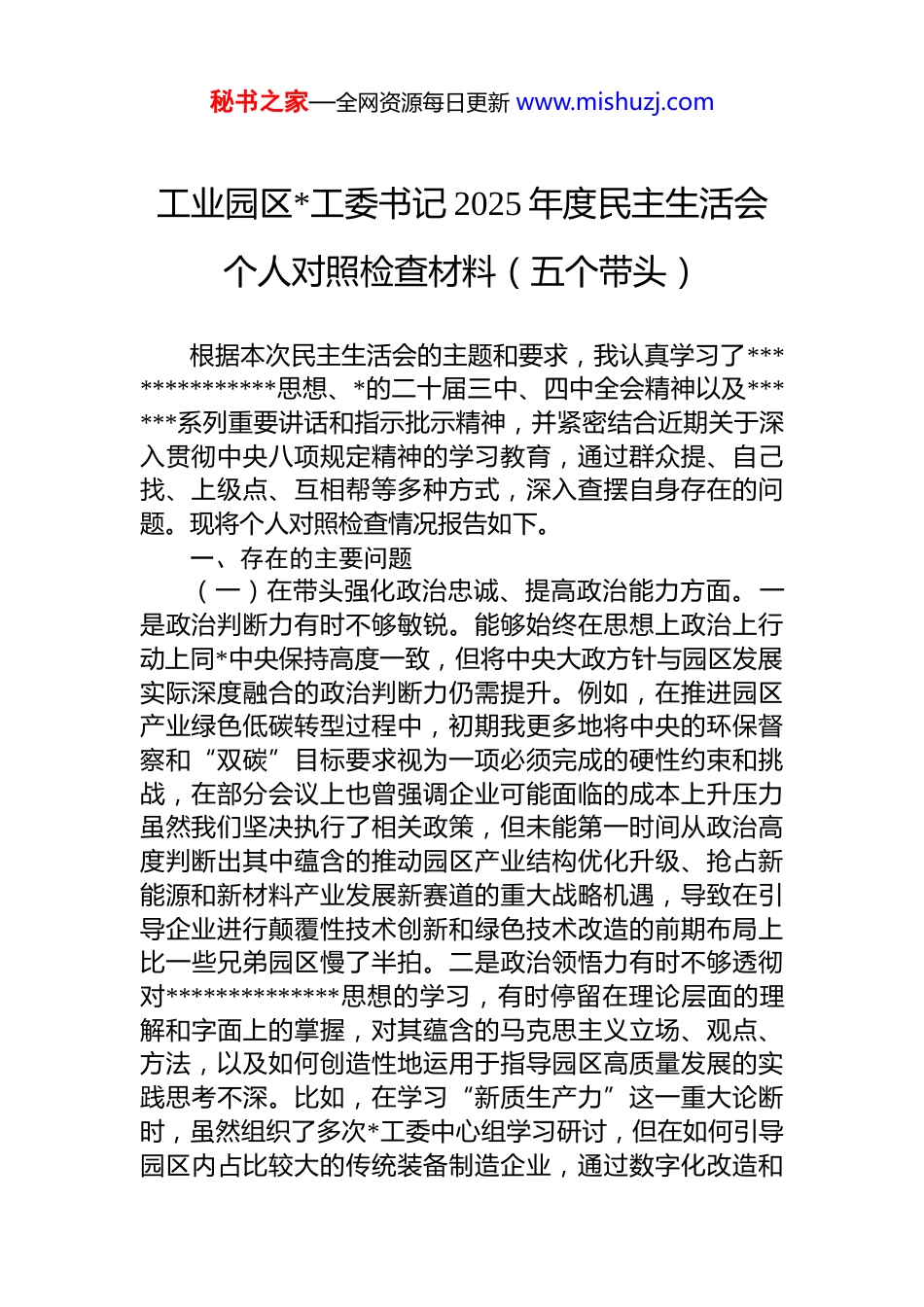 秘书之家—全网资源每日更新 www.mishuzj.com工业园区*工委书记 2025 年度民主生活会个人对照检查材料(五个带头)根据本次民主生活会的主题和要求,我认真学习了**************思想、*的二十届三中、四中全会精神以及******系列重要讲话和指示批示精神,并紧密结合近期关于深入贯彻中央八项规定精神的学习教育,通过群众提、自己找、上级点、互相帮等多种方式,深入查摆自身存在的问题。现将个人对照检查情况报告如下。一、存在的主要问题(一)在带头强化政治忠诚、提高政治能力方面。一是政治判断力有时不够敏锐。能够始终在思想上政治上行动上同*中央保持高度一致,但将中央大政方针与园区发展实际深度融合的政治判断力仍需提升。例如,在推进园区产业绿色低碳转型过程中,初期我更多地将中央的环保督察和“双碳”目标要求视为一项必须完成的硬性约束和挑战,在部分会议上也曾强调企业可能面临的成本上升压力虽然我们坚决执行了相关政策,但未能第一时间从政治高度判断出其中蕴含的推动园区产业结构优化升级、抢占新能源和新材料产业发展新赛道的重大战略机遇,导致在引导企业进行颠覆性技术创新和绿色技术改造的前期布局上比一些兄弟园区慢了半拍。二是政治领悟力有时不够透彻对**************思想的学习,有时停留在理论层面的理解和字面上的掌握,对其蕴含的马克思主义立场、观点、方法,以及如何创造性地运用于指导园区高质量发展的实践思考不深。比如,在学习“新质生产力”这一重大论断时,虽然组织了多次*工委中心组学习研讨,但在如何引导园区内占比较大的传统装备制造企业,通过数字化改造和秘书之家—全网资源每日更新 www.mishuzj.com智能化升级,从现有产业基础中培育和发展新质生产力上我的思路还不够清晰,提出的具体举措也偏向于鼓励企业引进新设备、申报新项目等常规路径,缺乏对重塑生产关系、优化要素配置等更深层次变革的系统性思考和部署。三是政治执行力有时存在偏差。在贯彻落实上级决策部署时,能够做到令行禁止、不打折扣,但偶尔存在机械化执行、结合实际不够紧密的问题。今年自治区*委要求大力优化营商环境,我们园区也迅速出台了一系列服务企业的措施。但在执行过程中,我过分强调了政策的普惠性和流程的标准化,比如在一次为解决园区企业融资难问题而举办的银企对接会上,我要求相关部门必须邀请所有规上企业参加,导致一些暂无融资需求或需求不匹配的企业也占用了大量时间和精力,而真正急需资金的几家科技型中小微企业,反而因为“广撒网”而未能得到更具针对性的深度对接服务。这反映出我在执行上级决策时,有时为了确保全面覆盖,牺牲了精准高效,未能实现政策效能的最大化。(二)在带头固本培元、增强*性方面。一是理论武装的系统性和转化率有待加强。虽然能够坚持参加集体学习但个人自学的主动性和系统性仍然不足,存在“要我学”多于“我要学”的情况。对*的创新理论学习,满足于已读、已学,但在学懂、弄通、做实上下的功夫不够,特别是将学习成果转化为谋划园区发展的战略思维、破解发展难题的创新思路和推动工作落实的有效方法上,还存在差距。在 2025 年围绕“十五五”规划开展前期调研论证时,我虽然提出要以新发展理念为指导,但在具体课题设置和研讨方向上,仍然更多地依赖于过往经验和传统路径,对如何通过理论创新引领园区实现跨越式发展,缺乏前瞻性和突破性的思考。二是理想信念的淬炼锤炼不够经常。在长期负责园区经济建设的实践中,有时不自觉地将工作重心过多地放在了招商引资、项目建设和经济指标完成情况上,对共产主义远大理想和中国特色社会主义共同理想的长期秘书之家—全网资源每日更新 www.mishuzj.com性、艰巨性认识有所弱化。面对当前复杂严峻的国内外经济形势和园区发展遇到的瓶颈,偶尔也会产生畏难情绪和“求稳”心态,在推动一些需要长期投入、短期难见效的改革任务时,比如盘活园区闲置低效用地和“僵尸企业”虽然启动了相关工作,但在攻坚克难的决心和一抓到底的韧劲上,显得魄力不足,担心触及复杂利益关系影响当前稳定。三是*内政治生活锤炼*性的熔炉作用发挥不充分。作为“班长”,在主持*工委会...