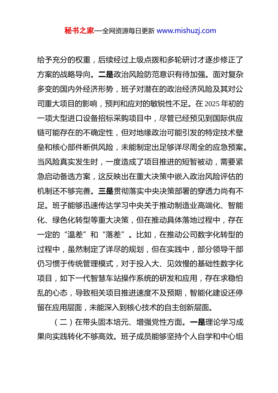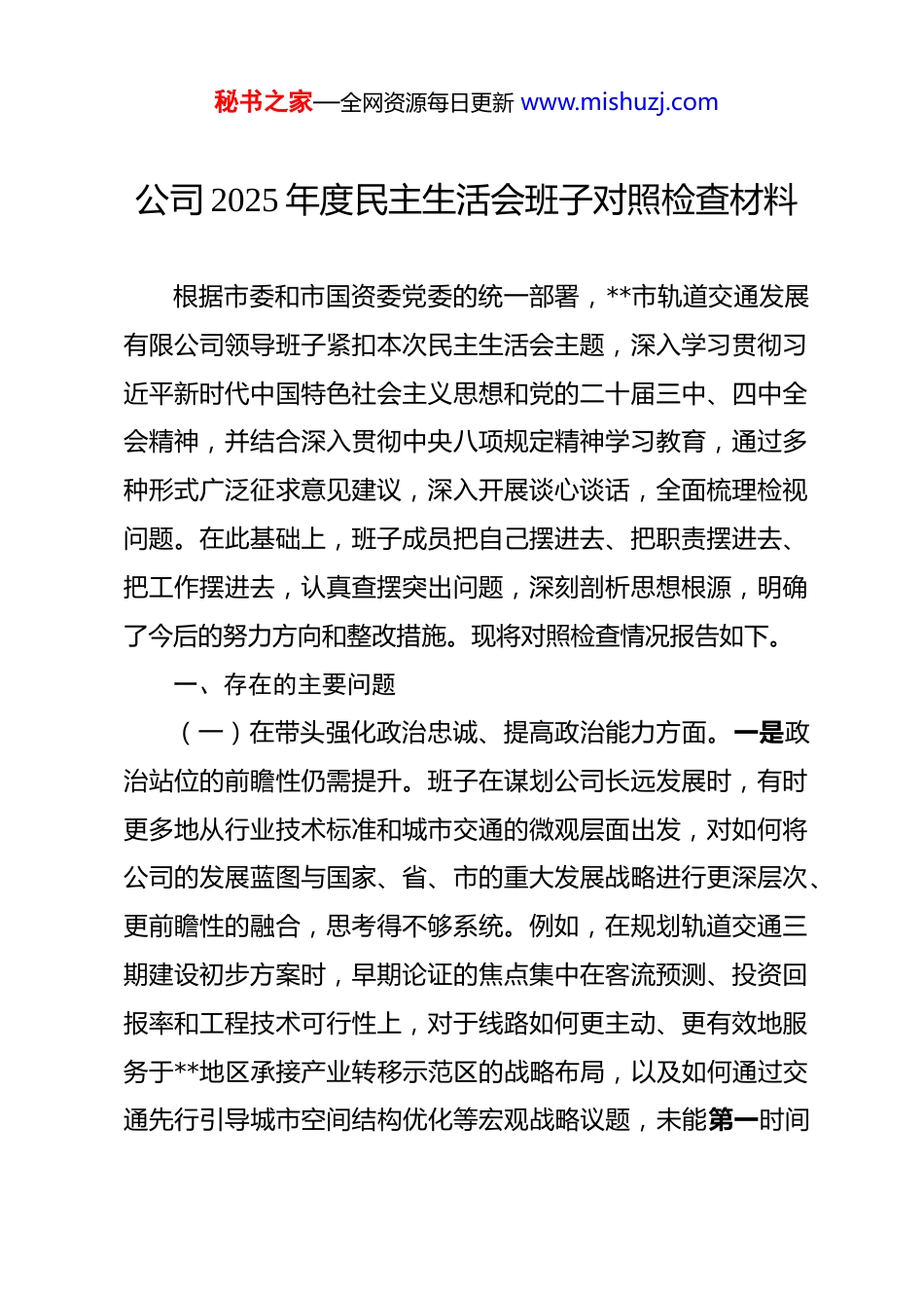 秘书之家—全网资源每日更新 www.mishuzj.com公司 2025 年度民主生活会班子对照检查材料 根据市委和市国资委党委的统一部署,**市轨道交通发展有限公司领导班子紧扣本次民主生活会主题,深入学习贯彻习近平新时代中国特色社会主义思想和党的二十届三中、四中全会精神,并结合深入贯彻中央八项规定精神学习教育,通过多种形式广泛征求意见建议,深入开展谈心谈话,全面梳理检视问题。在此基础上,班子成员把自己摆进去、把职责摆进去、把工作摆进去,认真查摆突出问题,深刻剖析思想根源,明确了今后的努力方向和整改措施。现将对照检查情况报告如下。一、存在的主要问题(一)在带头强化政治忠诚、提高政治能力方面。一是政治站位的前瞻性仍需提升。班子在谋划公司长远发展时,有时更多地从行业技术标准和城市交通的微观层面出发,对如何将公司的发展蓝图与国家、省、市的重大发展战略进行更深层次、更前瞻性的融合,思考得不够系统。例如,在规划轨道交通三期建设初步方案时,早期论证的焦点集中在客流预测、投资回报率和工程技术可行性上,对于线路如何更主动、更有效地服务于**地区承接产业转移示范区的战略布局,以及如何通过交通先行引导城市空间结构优化等宏观战略议题,未能第一时间秘书之家—全网资源每日更新 www.mishuzj.com给予充分的权重,后续经过上级点拨和多轮研讨才逐步修正了方案的战略导向。二是政治风险防范意识有待加强。面对复杂多变的国内外经济形势,班子对潜在的政治经济风险及其对公司重大项目的影响,预判和应对的敏锐性不足。在 2025 年初的一项大型进口设备招标采购项目中,尽管已经预见到国际供应链可能存在的不确定性,但对地缘政治可能引发的特定技术壁垒和核心部件断供风险,未能制定出足够详尽周全的应急预案。当风险真实发生时,一度造成了项目推进的短暂被动,需要紧急启动备选方案,这反映出在重大决策中嵌入政治风险评估的机制还不够完善。三是贯彻落实中央决策部署的穿透力尚有不足。班子能够迅速传达学习中央关于推动制造业高端化、智能化、绿色化转型等重大决策,但在推动具体落地过程中,存在一定的“温差”和“落差”。比如,在推动公司数字化转型的过程中,虽然制定了详尽的规划,但在实践中,部分领导干部仍习惯于传统管理模式,对于投入大、见效慢的基础性数字化项目,如下一代智慧车站操作系统的研发和应用,存在求稳怕乱的心态,导致相关项目推进速度不及预期,智能化建设还停留在应用层面,未能深入到核心技术的自主创新层面。(二)在带头固本培元、增强党性方面。一是理论学习成果向实践转化不够高效。班子成员能够坚持个人自学和中心组秘书之家—全网资源每日更新 www.mishuzj.com集体学习,但有时存在“为了学习而学习”的现象,将理论武装与解决公司改革发展的实际难题结合得不够紧密。例如,在多次学习习近平总书记关于新质生产力的重要论述后,班子成员在务虚会上都能谈出深刻的认识和体会,但在具体决策中,面对一个关于引入新型节能技术但初期投资较高的车辆增购方案时,还是出现了长时间的犹豫和争论,最终因为担心短期内财务报表不好看而选择了相对保守的方案,这表明理论认同尚未完全转化为推动创新发展的坚定行动和实践勇气。二是党内政治生活的“辣味”不足。在开展批评和自我批评时,有时还存在“你好我好大家好”的思想,对一些非原则性的问题,习惯于点到为止,讲客观原因多、剖析主观根源少。在 2025 年度的一次项目复盘专题组织生活会上,针对某项目因前期勘探不充分导致工期延误的问题,与会同志的发言多集中在天气、地质条件复杂等外部因素上,对于项目团队主观上的麻痹思想、对困难估计不足等深层次问题,未能展开深入尖锐的批评,影响了党内政治生活的政治性、时代性、原则性和战斗性。三是党性锤炼的自觉性仍需持续强化。个别班子成员在处理日常工作时,偶尔会不自觉地将个人经验和专业判断置于组织原则之上。在一次关于优化调整线网运营方案的讨论中,一位长期分管运营的同志,基于其丰富的经验,对自己提出的方案非常坚秘书之家—全网资源每日更新 www.mishuzj.com持,在集体讨论中听取不同...