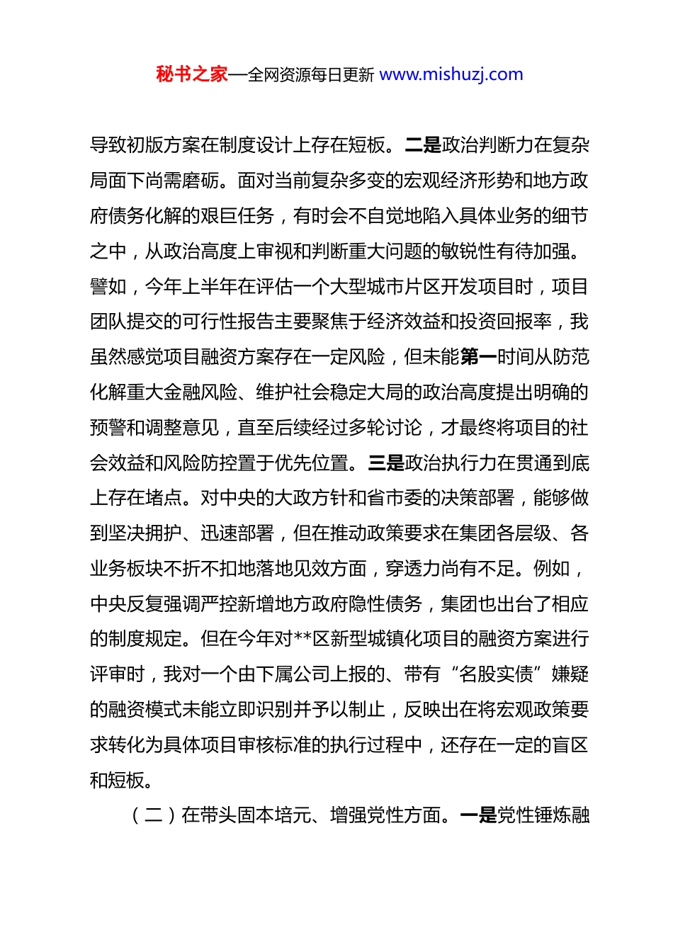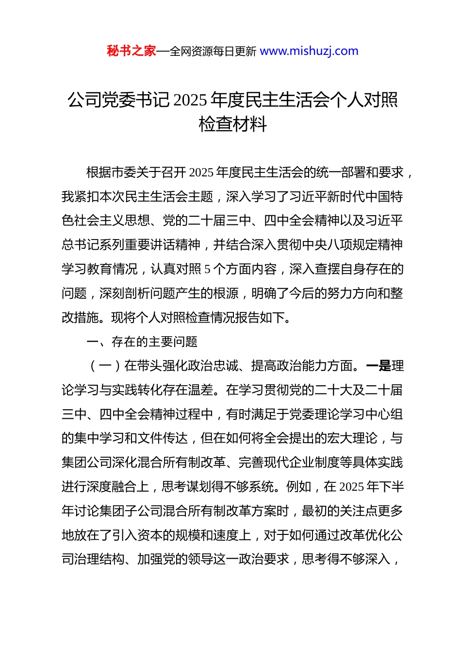 秘书之家—全网资源每日更新 www.mishuzj.com公司党委书记 2025 年度民主生活会个人对照检查材料根据市委关于召开 2025 年度民主生活会的统一部署和要求,我紧扣本次民主生活会主题,深入学习了习近平新时代中国特色社会主义思想、党的二十届三中、四中全会精神以及习近平总书记系列重要讲话精神,并结合深入贯彻中央八项规定精神学习教育情况,认真对照 5 个方面内容,深入查摆自身存在的问题,深刻剖析问题产生的根源,明确了今后的努力方向和整改措施。现将个人对照检查情况报告如下。一、存在的主要问题(一)在带头强化政治忠诚、提高政治能力方面。一是理论学习与实践转化存在温差。在学习贯彻党的二十大及二十届三中、四中全会精神过程中,有时满足于党委理论学习中心组的集中学习和文件传达,但在如何将全会提出的宏大理论,与集团公司深化混合所有制改革、完善现代企业制度等具体实践进行深度融合上,思考谋划得不够系统。例如,在 2025 年下半年讨论集团子公司混合所有制改革方案时,最初的关注点更多地放在了引入资本的规模和速度上,对于如何通过改革优化公司治理结构、加强党的领导这一政治要求,思考得不够深入,秘书之家—全网资源每日更新 www.mishuzj.com导致初版方案在制度设计上存在短板。二是政治判断力在复杂局面下尚需磨砺。面对当前复杂多变的宏观经济形势和地方政府债务化解的艰巨任务,有时会不自觉地陷入具体业务的细节之中,从政治高度上审视和判断重大问题的敏锐性有待加强。譬如,今年上半年在评估一个大型城市片区开发项目时,项目团队提交的可行性报告主要聚焦于经济效益和投资回报率,我虽然感觉项目融资方案存在一定风险,但未能第一时间从防范化解重大金融风险、维护社会稳定大局的政治高度提出明确的预警和调整意见,直至后续经过多轮讨论,才最终将项目的社会效益和风险防控置于优先位置。三是政治执行力在贯通到底上存在堵点。对中央的大政方针和省市委的决策部署,能够做到坚决拥护、迅速部署,但在推动政策要求在集团各层级、各业务板块不折不扣地落地见效方面,穿透力尚有不足。例如,中央反复强调严控新增地方政府隐性债务,集团也出台了相应的制度规定。但在今年对**区新型城镇化项目的融资方案进行评审时,我对一个由下属公司上报的、带有“名股实债”嫌疑的融资模式未能立即识别并予以制止,反映出在将宏观政策要求转化为具体项目审核标准的执行过程中,还存在一定的盲区和短板。(二)在带头固本培元、增强党性方面。一是党性锤炼融秘书之家—全网资源每日更新 www.mishuzj.com入日常工作不够紧密。能够充分认识到加强党性修养的重要性,并积极参加各类党性教育活动。但在日常工作中,特别是在业务繁忙、任务繁重的时候,有时会不自觉地出现“重业务、轻党建”的倾向。在今年 7 月 1 日集团召开的全面从严治党暨警示教育大会上,我要求全体党员干部要锤炼党性,但会后为赶三季度项目进度,连续多次将原定的党支部主题党日活动时间用于召开项目调度会,无形中传递了业务工作可以冲击党建工作的信号,未能做到“两手抓、两手硬”。二是批评与自我批评的武器运用不够经常。在党内政治生活中,能够坦诚地对班子成员提出批评意见,但有时考虑到维护班子团结,批评的“辣味”还不够足,多是提出工作建议,较少触及思想根源。在自我批评方面,也存在认识不够深刻、剖析不够彻底的问题。比如,在准备本次民主生活会材料的初期,我对自身问题的查摆多是一些普遍性、浅层次的现象,对于背后深层次的思想动因挖掘不够,缺乏“向我开炮”的勇气和刀刃向内的决心。三是理想信念与岗位职责结合不够深入。作为一名受党教育多年的干部,对党的忠诚和对共产主义的信仰是坚定不移的。但在如何将这种坚定的理想信念,具体地、生动地体现在作为国有企业负责人的岗位职责上,还存在差距。在推进**片区土地资源盘活这项工作中,我多次强调要盘活存量资产、提升资产效秘书之家—全网资源每日更新 www.mishuzj.com益,但在与涉及搬迁的群众代表沟通时,谈集团发展的大道理多,对群众最关心的安置细节、长远生计等问题倾听和回应得不够充分,...