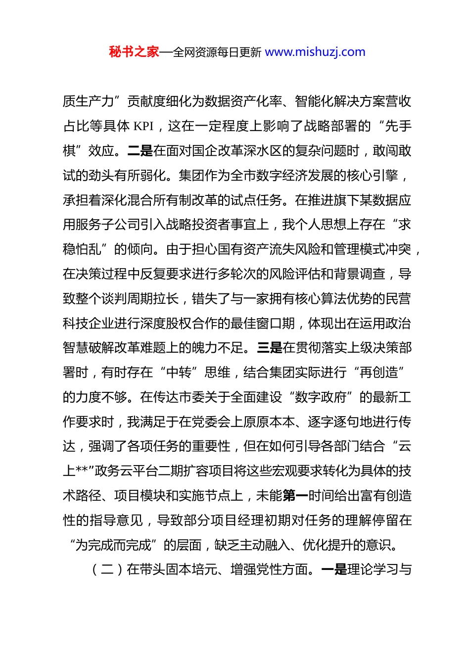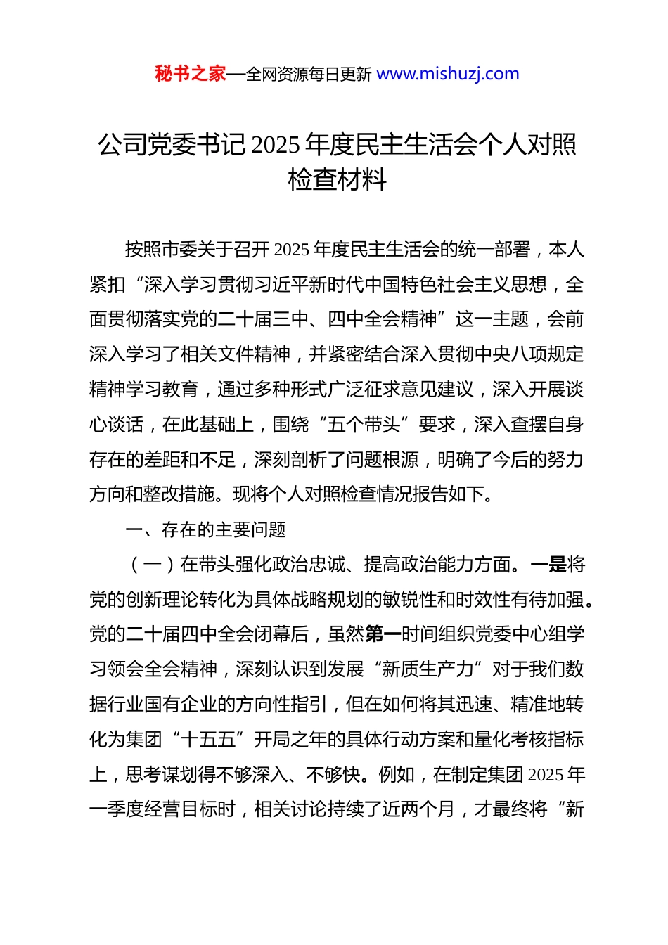 秘书之家—全网资源每日更新 www.mishuzj.com公司党委书记 2025 年度民主生活会个人对照检查材料 按照市委关于召开 2025 年度民主生活会的统一部署,本人紧扣“深入学习贯彻习近平新时代中国特色社会主义思想,全面贯彻落实党的二十届三中、四中全会精神”这一主题,会前深入学习了相关文件精神,并紧密结合深入贯彻中央八项规定精神学习教育,通过多种形式广泛征求意见建议,深入开展谈心谈话,在此基础上,围绕“五个带头”要求,深入查摆自身存在的差距和不足,深刻剖析了问题根源,明确了今后的努力方向和整改措施。现将个人对照检查情况报告如下。一、存在的主要问题(一)在带头强化政治忠诚、提高政治能力方面。一是将党的创新理论转化为具体战略规划的敏锐性和时效性有待加强。党的二十届四中全会闭幕后,虽然第一时间组织党委中心组学习领会全会精神,深刻认识到发展“新质生产力”对于我们数据行业国有企业的方向性指引,但在如何将其迅速、精准地转化为集团“十五五”开局之年的具体行动方案和量化考核指标上,思考谋划得不够深入、不够快。例如,在制定集团 2025 年一季度经营目标时,相关讨论持续了近两个月,才最终将“新秘书之家—全网资源每日更新 www.mishuzj.com质生产力”贡献度细化为数据资产化率、智能化解决方案营收占比等具体 KPI,这在一定程度上影响了战略部署的“先手棋”效应。二是在面对国企改革深水区的复杂问题时,敢闯敢试的劲头有所弱化。集团作为全市数字经济发展的核心引擎,承担着深化混合所有制改革的试点任务。在推进旗下某数据应用服务子公司引入战略投资者事宜上,我个人思想上存在“求稳怕乱”的倾向。由于担心国有资产流失风险和管理模式冲突,在决策过程中反复要求进行多轮次的风险评估和背景调查,导致整个谈判周期拉长,错失了与一家拥有核心算法优势的民营科技企业进行深度股权合作的最佳窗口期,体现出在运用政治智慧破解改革难题上的魄力不足。三是在贯彻落实上级决策部署时,有时存在“中转”思维,结合集团实际进行“再创造”的力度不够。在传达市委关于全面建设“数字政府”的最新工作要求时,我满足于在党委会上原原本本、逐字逐句地进行传达,强调了各项任务的重要性,但在如何引导各部门结合“云上**”政务云平台二期扩容项目将这些宏观要求转化为具体的技术路径、项目模块和实施节点上,未能第一时间给出富有创造性的指导意见,导致部分项目经理初期对任务的理解停留在“为完成而完成”的层面,缺乏主动融入、优化提升的意识。(二)在带头固本培元、增强党性方面。一是理论学习与秘书之家—全网资源每日更新 www.mishuzj.com解决实际问题的结合不够紧密,存在“两张皮”现象。尽管能够坚持参加党委理论学习中心组的各项学习活动,但有时学习思考的深度不够,未能完全做到知其然、知其所以然,更知其所以用。例如,在学习习近平总书记关于网络强国的重要论述时,虽然对核心要义和精神实质有了基本把握,但在如何运用这些思想指导解决集团当前面临的数据孤岛、数据确权等现实难题上,未能组织团队展开“解剖麻雀”式的专题研讨,导致理论学习的成果没能最大限度地转化为破解业务瓶颈的“金钥匙”。二是在日常管理工作中,有时过于依赖行政手段和业绩考核,通过思想政治工作激发干部职工内生动力的精细度不足。2025 年上半年,为确保市级数据中台项目按期上线,面对繁重的开发测试任务,我主要通过倒排工期、责任到人、绩效挂钩等方式来推进工作。虽然项目最终成功交付但后来反思,在这个过程中,我较少深入项目一线,与团队成员深入交流,未能及时将项目建设的重大意义——即为全市数字化治理提供坚实底座——讲清讲透,以使命感、荣誉感激发大家的奋斗热情,这种“重任务、轻思想”的倾向,影响了团队凝聚力和战斗力的深度培育。三是党性锤炼的自觉性和持续性有待提升,艰苦奋斗精神有所弱化。随着集团业务步入正轨,经营状况持续向好,潜意识里艰苦创业的劲头有所松懈。在谋划集团新的办公秘书之家—全网资源每日更新 www.mishuzj.com大楼智慧化升级方案时,面对预算方案,虽然履行了审批程序,但对于一些非...