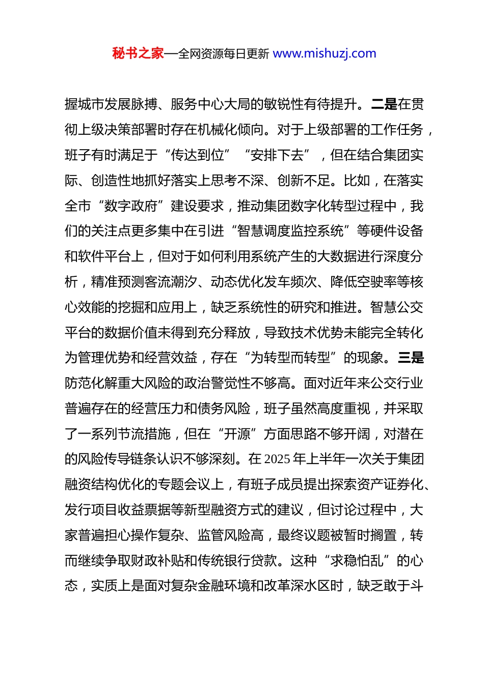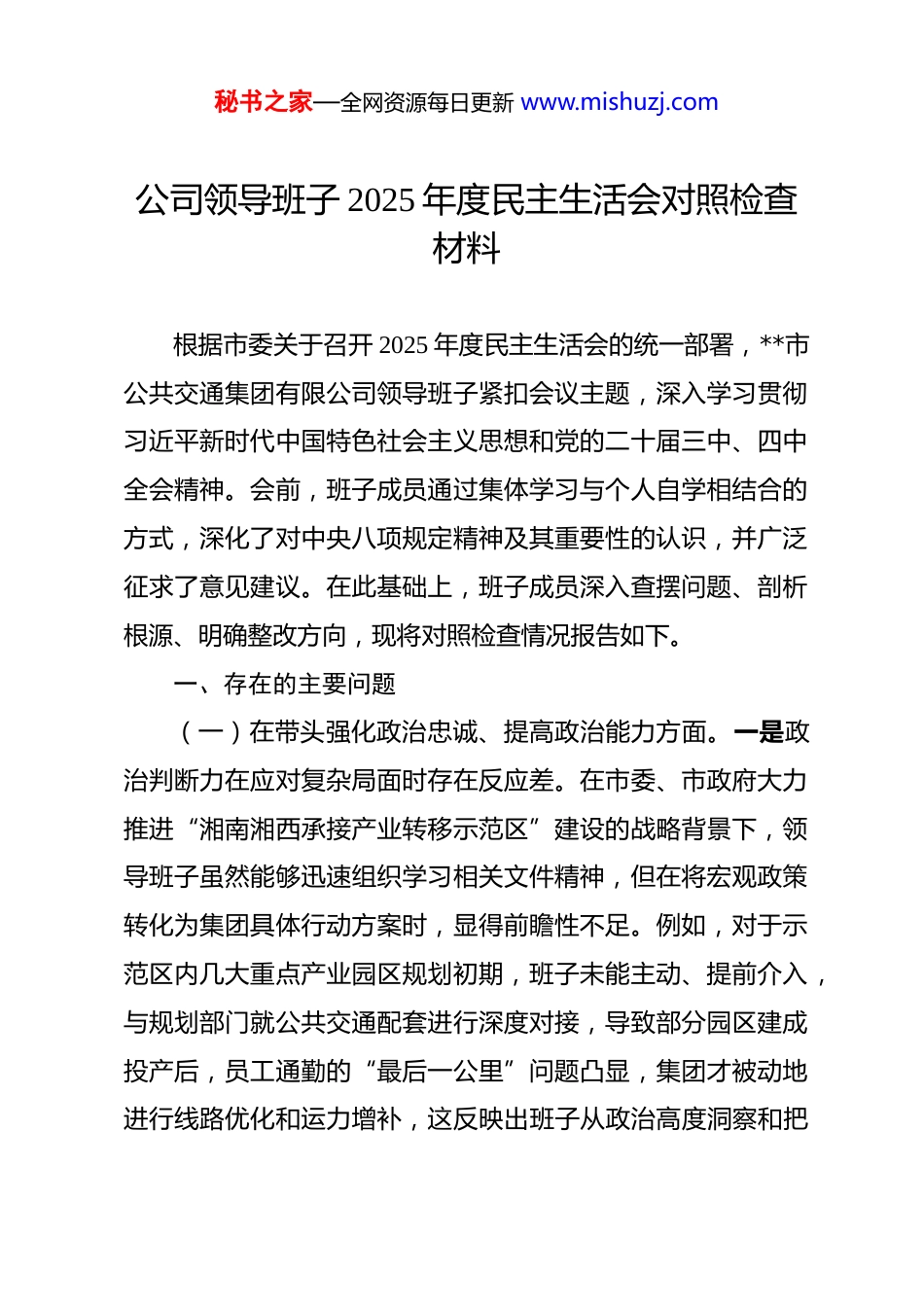 秘书之家—全网资源每日更新 www.mishuzj.com公司领导班子 2025 年度民主生活会对照检查材料 根据市委关于召开 2025 年度民主生活会的统一部署,**市公共交通集团有限公司领导班子紧扣会议主题,深入学习贯彻习近平新时代中国特色社会主义思想和党的二十届三中、四中全会精神。会前,班子成员通过集体学习与个人自学相结合的方式,深化了对中央八项规定精神及其重要性的认识,并广泛征求了意见建议。在此基础上,班子成员深入查摆问题、剖析根源、明确整改方向,现将对照检查情况报告如下。一、存在的主要问题(一)在带头强化政治忠诚、提高政治能力方面。一是政治判断力在应对复杂局面时存在反应差。在市委、市政府大力推进“湘南湘西承接产业转移示范区”建设的战略背景下,领导班子虽然能够迅速组织学习相关文件精神,但在将宏观政策转化为集团具体行动方案时,显得前瞻性不足。例如,对于示范区内几大重点产业园区规划初期,班子未能主动、提前介入,与规划部门就公共交通配套进行深度对接,导致部分园区建成投产后,员工通勤的“最后一公里”问题凸显,集团才被动地进行线路优化和运力增补,这反映出班子从政治高度洞察和把秘书之家—全网资源每日更新 www.mishuzj.com握城市发展脉搏、服务中心大局的敏锐性有待提升。二是在贯彻上级决策部署时存在机械化倾向。对于上级部署的工作任务,班子有时满足于“传达到位”“安排下去”,但在结合集团实际、创造性地抓好落实上思考不深、创新不足。比如,在落实全市“数字政府”建设要求,推动集团数字化转型过程中,我们的关注点更多集中在引进“智慧调度监控系统”等硬件设备和软件平台上,但对于如何利用系统产生的大数据进行深度分析,精准预测客流潮汐、动态优化发车频次、降低空驶率等核心效能的挖掘和应用上,缺乏系统性的研究和推进。智慧公交平台的数据价值未得到充分释放,导致技术优势未能完全转化为管理优势和经营效益,存在“为转型而转型”的现象。三是防范化解重大风险的政治警觉性不够高。面对近年来公交行业普遍存在的经营压力和债务风险,班子虽然高度重视,并采取了一系列节流措施,但在“开源”方面思路不够开阔,对潜在的风险传导链条认识不够深刻。在 2025 年上半年一次关于集团融资结构优化的专题会议上,有班子成员提出探索资产证券化、发行项目收益票据等新型融资方式的建议,但讨论过程中,大家普遍担心操作复杂、监管风险高,最终议题被暂时搁置,转而继续争取财政补贴和传统银行贷款。这种“求稳怕乱”的心态,实质上是面对复杂金融环境和改革深水区时,缺乏敢于斗秘书之家—全网资源每日更新 www.mishuzj.com争、善于斗争的政治担当和专业能力,未能从维护国有资产安全和城市公共服务可持续性的政治高度,去谋划更具韧性的风险应对策略。(二)在带头固本培元、增强党性方面。一是理论学习与实践结合不够紧密。班子能够坚持党委理论学习中心组学习制度,但有时学习存在“为学习而学习”的现象,把学习成果转化为推动工作的实际成效不足。在学习习近平总书记关于发展新质生产力的重要论述后,班子成员在研讨中都能谈出一些认识,但如何将新质生产力理念应用于传统公交行业,例如通过技术创新和服务升级,培育公交广告、场站商业开发、定制客运等新的增长点,却缺乏深入、具体的行动方案和项目抓手。学习和实践“两张皮”的问题依然存在,未能真正做到学思用贯通、知信行统一。二是党性锤炼在日常工作中有所弱化。在顺境和常规工作中,班子成员的党性观念和宗旨意识是坚定的。但在面对急难险重任务和复杂矛盾时,有时会不自觉地暴露出思想上的松懈。例如,在处理 2025 年夏季因城市内涝导致部分公交线路长时间停运的突发事件中,尽管我们启动了应急预案,但个别班子成员在指挥调度时,更多是坐在办公室通过电话了解情况,深入一线、靠前指挥不够,对滞留乘客的安抚和转运工作细节考虑不周。这反映出在关键时刻,将坚定的党性原则秘书之家—全网资源每日更新 www.mishuzj.com转化为“时时放心不下”的责任感和行动自觉方面,仍有差距。三是批评与自我批评的武器运用不够充分。在民主生活会或...