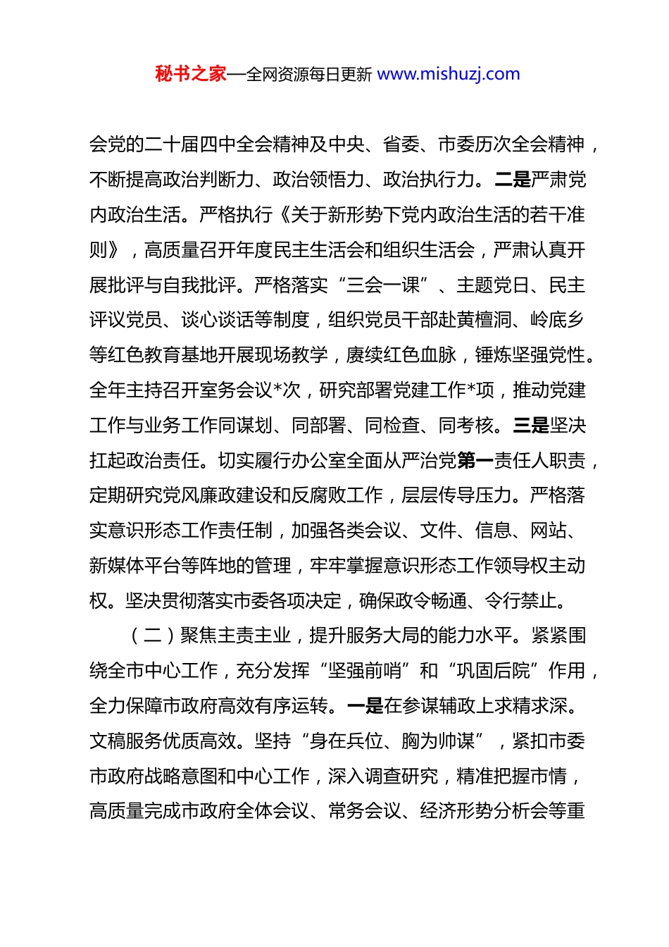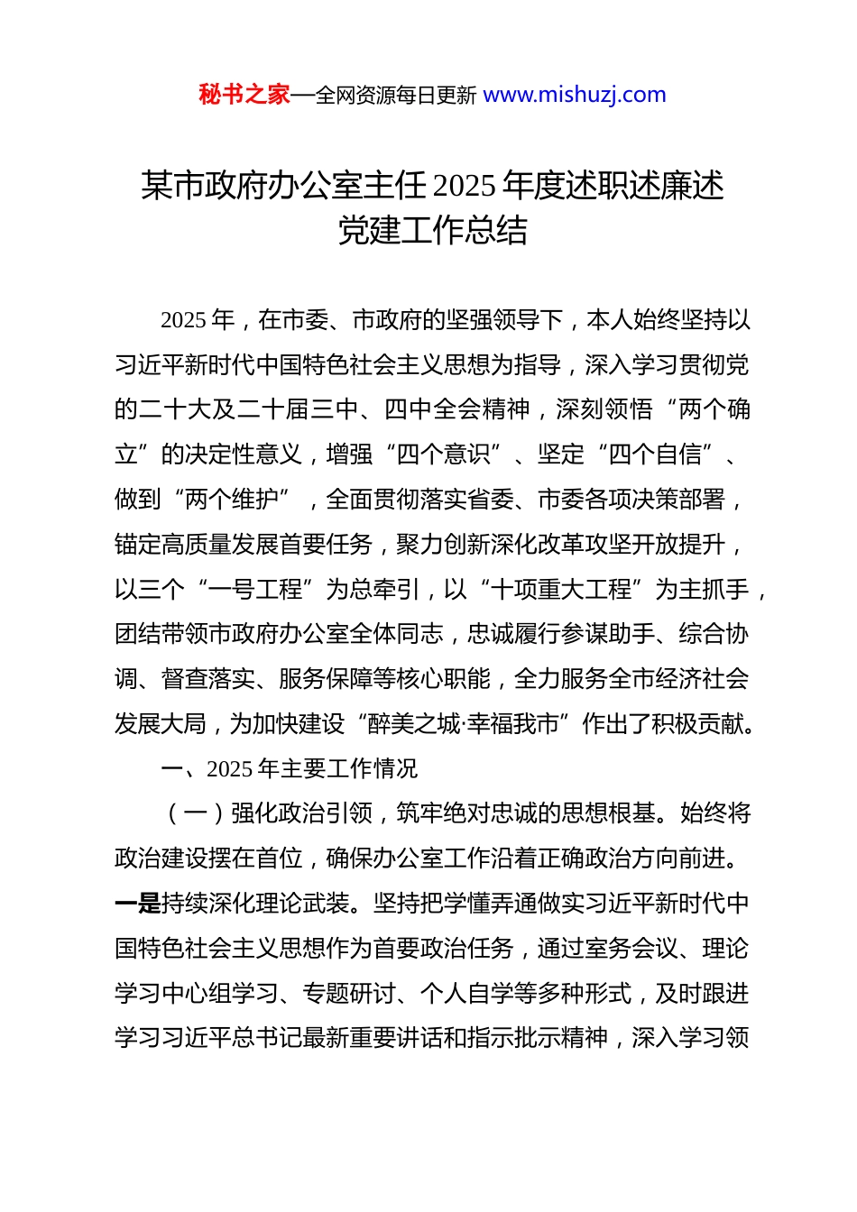 秘书之家—全网资源每日更新 www.mishuzj.com某市政府办公室主任 2025 年度述职述廉述党建工作总结 2025 年,在市委、市政府的坚强领导下,本人始终坚持以习近平新时代中国特色社会主义思想为指导,深入学习贯彻党的二十大及二十届三中、四中全会精神,深刻领悟“两个确立”的决定性意义,增强“四个意识”、坚定“四个自信”、做到“两个维护”,全面贯彻落实省委、市委各项决策部署,锚定高质量发展首要任务,聚力创新深化改革攻坚开放提升,以三个“一号工程”为总牵引,以“十项重大工程”为主抓手,团结带领市政府办公室全体同志,忠诚履行参谋助手、综合协调、督查落实、服务保障等核心职能,全力服务全市经济社会发展大局,为加快建设“醉美之城·幸福我市”作出了积极贡献。一、2025 年主要工作情况(一)强化政治引领,筑牢绝对忠诚的思想根基。始终将政治建设摆在首位,确保办公室工作沿着正确政治方向前进。一是持续深化理论武装。坚持把学懂弄通做实习近平新时代中国特色社会主义思想作为首要政治任务,通过室务会议、理论学习中心组学习、专题研讨、个人自学等多种形式,及时跟进学习习近平总书记最新重要讲话和指示批示精神,深入学习领秘书之家—全网资源每日更新 www.mishuzj.com会党的二十届四中全会精神及中央、省委、市委历次全会精神,不断提高政治判断力、政治领悟力、政治执行力。二是严肃党内政治生活。严格执行《关于新形势下党内政治生活的若干准则》,高质量召开年度民主生活会和组织生活会,严肃认真开展批评与自我批评。严格落实“三会一课”、主题党日、民主评议党员、谈心谈话等制度,组织党员干部赴黄檀洞、岭底乡等红色教育基地开展现场教学,赓续红色血脉,锤炼坚强党性。全年主持召开室务会议*次,研究部署党建工作*项,推动党建工作与业务工作同谋划、同部署、同检查、同考核。三是坚决扛起政治责任。切实履行办公室全面从严治党第一责任人职责,定期研究党风廉政建设和反腐败工作,层层传导压力。严格落实意识形态工作责任制,加强各类会议、文件、信息、网站、新媒体平台等阵地的管理,牢牢掌握意识形态工作领导权主动权。坚决贯彻落实市委各项决定,确保政令畅通、令行禁止。(二)聚焦主责主业,提升服务大局的能力水平。紧紧围绕全市中心工作,充分发挥“坚强前哨”和“巩固后院”作用,全力保障市政府高效有序运转。一是在参谋辅政上求精求深。文稿服务优质高效。坚持“身在兵位、胸为帅谋”,紧扣市委市政府战略意图和中心工作,深入调查研究,精准把握市情,高质量完成市政府全体会议、常务会议、经济形势分析会等重秘书之家—全网资源每日更新 www.mishuzj.com要会议的领导讲话、工作报告、汇报材料等综合性文稿起草工作。全年共组织起草、审核各类重要文稿*余篇,其中市政府主要领导讲话、报告*余篇,力求文稿体现政治高度、思想深度和实践力度,有效发挥了以文辅政作用。信息报送精准及时。畅通信息渠道,健全信息网络,围绕经济社会发展中的重点、热点、难点问题,以及基层创造的新鲜经验,及时编报政务信息。全年编发《政务信息》*期,其中专报、要情等得到省市领导批示肯定*次。密切跟踪上级政策动态,编发政策汇编、参阅材料*期,为领导决策提供了有价值参考。政务信息工作考核位列全省前列。调查研究务实深入。积极响应党中央关于大兴调查研究的号召,围绕三个“一号工程”、“十项重大工程”、“六新六力”等重点工作,聚焦产业升级、城市发展、共同富裕、基层治理等领域,牵头或参与开展专题调研*次,形成了一批有情况、有分析、有建议的调研报告,部分成果已转化为市政府的具体政策和措施。二是在统筹协调上求畅求顺。办文办会规范有序。严格执行公文处理条例,优化流转程序,严把政治关、政策关、文字关、格式关,确保公文处理准确、规范、高效。全年接收办理各类文件*件,制发文件*件。着力改进会风,统筹会议活动安排,大力推行合并开会、套开会议,切实压减会议数量、时间和规模。精心组织承办市政府全体会议、常务会秘书之家—全网资源每日更新 www.mishuzj.com议、专题会议等各类会议*余场次,高效保障了全...