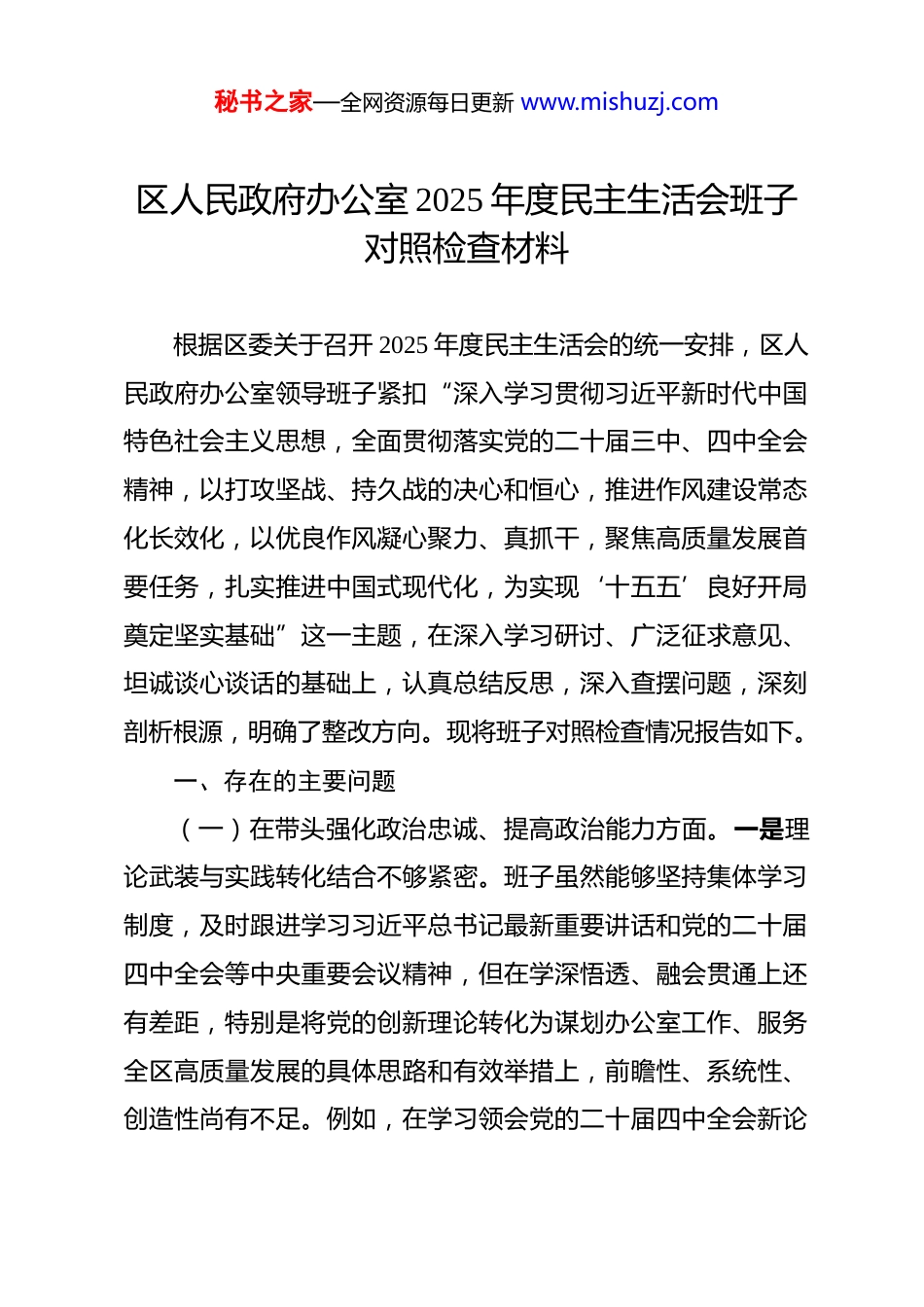 秘书之家—全网资源每日更新 www.mishuzj.com区人民政府办公室 2025 年度民主生活会班子对照检查材料 根据区委关于召开 2025 年度民主生活会的统一安排,区人民政府办公室领导班子紧扣“深入学习贯彻习近平新时代中国特色社会主义思想,全面贯彻落实党的二十届三中、四中全会精神,以打攻坚战、持久战的决心和恒心,推进作风建设常态化长效化,以优良作风凝心聚力、真抓干,聚焦高质量发展首要任务,扎实推进中国式现代化,为实现‘十五五’良好开局奠定坚实基础”这一主题,在深入学习研讨、广泛征求意见、坦诚谈心谈话的基础上,认真总结反思,深入查摆问题,深刻剖析根源,明确了整改方向。现将班子对照检查情况报告如下。一、存在的主要问题(一)在带头强化政治忠诚、提高政治能力方面。一是理论武装与实践转化结合不够紧密。班子虽然能够坚持集体学习制度,及时跟进学习习近平总书记最新重要讲话和党的二十届四中全会等中央重要会议精神,但在学深悟透、融会贯通上还有差距,特别是将党的创新理论转化为谋划办公室工作、服务全区高质量发展的具体思路和有效举措上,前瞻性、系统性、创造性尚有不足。例如,在学习领会党的二十届四中全会新论秘书之家—全网资源每日更新 www.mishuzj.com述新要求后,如何将其与我区“十五五”规划开局之年的具体实践相结合,指导办公室在优化政务流程、提升协同效率、强化数字赋能等方面拿出更具突破性的改革方案,班子在集体研讨中虽然有所涉及,但提出的思路举措仍显宏观,缺乏可量化、可操作的路线图,导致理论学习成果未能最大程度地转化为推动工作的强大动力。二是政治判断力、政治领悟力、政治执行力仍需持续增强。班子成员在处理日常工作时,能够自觉站位全区发展大局,但在面对一些复杂敏感问题和突发情况时,从政治高度观察、分析和处理问题的敏锐性还不够强。比如,在协调推进一项涉及多个部门的重点产业项目落地过程中,办公室在初期主要扮演了“收发室”和“会议室”的角色,满足于传递信息、组织会议,对于各部门之间因本位主义思想而产生的协调壁垒和潜在风险,未能第一时间从保障区委区政府重大决策部署落地落实的政治高度进行预判和介入,导致项目前期工作出现了一定的延误,暴露出在复杂局面中运用政治眼光把握航向、防范风险的能力有待提升。三是贯彻落实上级决策部署有时存在“中转”现象。在执行中央、省、市和区委的决策部署时,办公室班子能够做到令行禁止、不打折扣,但在具体落实过程中,有时满足于“发通知、转文件、提要求”,在结合我区实际、进行深度“二次加工”、制定更具针对性和操作秘书之家—全网资源每日更新 www.mishuzj.com性的实施细则方面用心用力不足。去年在推动一项优化营商环境的政策时,办公室虽然及时将上级文件转发至各相关单位,但未能牵头组织力量,针对我区企业反映强烈的一些堵点难点问题,深入研究制定符合 XX 实际的配套措施,导致政策的“最后一公里”未能完全打通,部分企业对政策的获得感不强。(二)在带头固本培元、增强党性方面。一是党性锤炼融入日常工作不够深入。班子成员能够自觉加强党性修养,但在纷繁复杂的日常事务中,有时存在“重业务、轻党建”的倾向,未能时刻将党性锻炼贯穿于处理每一项工作、解决每一个问题的全过程。在面对急难险重任务时,虽然能够迎难而上,但偶尔也会滋生畏难发愁、急躁焦虑的情绪。例如,在去年汛期应对突发强降雨过程中,办公室承担着大量的统筹协调和信息报送工作,面对巨大的工作压力和紧迫的时间要求,个别班子成员在与基层单位沟通时语气较为生硬,虽然是出于工作急切的公心,但也反映出在极限考验下,运用党性原则修身律己、保持平和心态的修为尚有不足。二是党内政治生活“辣味”尚显不足。虽然能够严格执行“三会一课”、民主生活会、组织生活会等制度,但在开展批评与自我批评时,有时还存在“你好我好大家好”的思想,对一些非原则性问题,习惯于点到为止、蜻蜓点水。在最近一次的班子民主生活会上,相互批评环节更秘书之家—全网资源每日更新 www.mishuzj.com多地是提出工作建议,或是点出一些显而易见的共性问题,对于班...