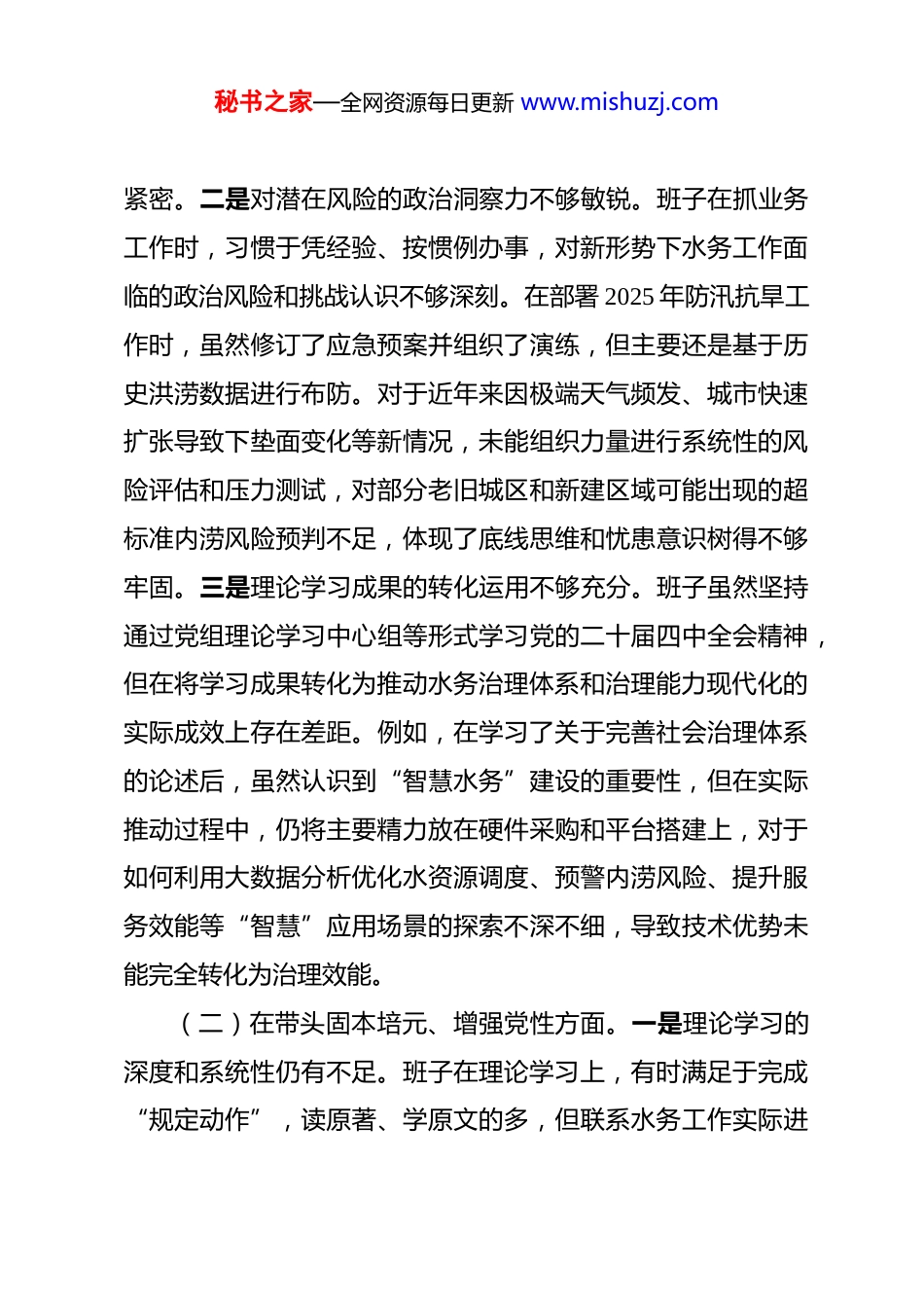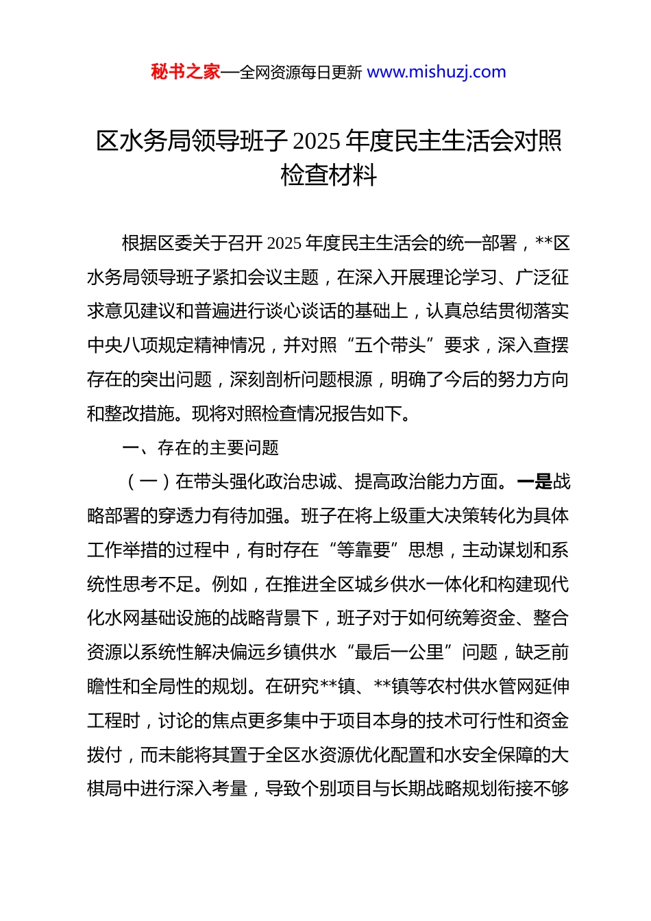 秘书之家—全网资源每日更新 www.mishuzj.com区水务局领导班子 2025 年度民主生活会对照检查材料 根据区委关于召开 2025 年度民主生活会的统一部署,**区水务局领导班子紧扣会议主题,在深入开展理论学习、广泛征求意见建议和普遍进行谈心谈话的基础上,认真总结贯彻落实中央八项规定精神情况,并对照“五个带头”要求,深入查摆存在的突出问题,深刻剖析问题根源,明确了今后的努力方向和整改措施。现将对照检查情况报告如下。一、存在的主要问题(一)在带头强化政治忠诚、提高政治能力方面。一是战略部署的穿透力有待加强。班子在将上级重大决策转化为具体工作举措的过程中,有时存在“等靠要”思想,主动谋划和系统性思考不足。例如,在推进全区城乡供水一体化和构建现代化水网基础设施的战略背景下,班子对于如何统筹资金、整合资源以系统性解决偏远乡镇供水“最后一公里”问题,缺乏前瞻性和全局性的规划。在研究**镇、**镇等农村供水管网延伸工程时,讨论的焦点更多集中于项目本身的技术可行性和资金拨付,而未能将其置于全区水资源优化配置和水安全保障的大棋局中进行深入考量,导致个别项目与长期战略规划衔接不够秘书之家—全网资源每日更新 www.mishuzj.com紧密。二是对潜在风险的政治洞察力不够敏锐。班子在抓业务工作时,习惯于凭经验、按惯例办事,对新形势下水务工作面临的政治风险和挑战认识不够深刻。在部署 2025 年防汛抗旱工作时,虽然修订了应急预案并组织了演练,但主要还是基于历史洪涝数据进行布防。对于近年来因极端天气频发、城市快速扩张导致下垫面变化等新情况,未能组织力量进行系统性的风险评估和压力测试,对部分老旧城区和新建区域可能出现的超标准内涝风险预判不足,体现了底线思维和忧患意识树得不够牢固。三是理论学习成果的转化运用不够充分。班子虽然坚持通过党组理论学习中心组等形式学习党的二十届四中全会精神,但在将学习成果转化为推动水务治理体系和治理能力现代化的实际成效上存在差距。例如,在学习了关于完善社会治理体系的论述后,虽然认识到“智慧水务”建设的重要性,但在实际推动过程中,仍将主要精力放在硬件采购和平台搭建上,对于如何利用大数据分析优化水资源调度、预警内涝风险、提升服务效能等“智慧”应用场景的探索不深不细,导致技术优势未能完全转化为治理效能。(二)在带头固本培元、增强党性方面。一是理论学习的深度和系统性仍有不足。班子在理论学习上,有时满足于完成“规定动作”,读原著、学原文的多,但联系水务工作实际进秘书之家—全网资源每日更新 www.mishuzj.com行深入研讨、辨析症结的少。在党组理论学习中心组学习研讨过程中,有时存在以工作交流代替党性分析的现象,围绕如何运用习近平总书记关于治水的重要论述破解当前水资源管理难题的讨论不够深入,未能真正做到学思用贯通、知信行统一,导致在面对复杂问题时,理论指导实践的功力尚有欠缺。二是攻坚克难的党性锤炼尚有差距。面对水务改革发展中的一些“硬骨头”,班子有时存在畏难情绪和求稳心态。在谋划“十五五”水利发展规划时,针对农村水环境治理投入大、见效慢、维护难的特点,特别是像金鼎山镇等地总投资达 8000 万元的农村水环境治理工程,班子在初步讨论时,一度对资金筹措和后续管护的可持续性感到压力巨大,存在着降低目标、缩减规模的想法,这反映出在重大挑战面前,以坚强党性迎难而上、开拓创新的劲头还不够足。三是理想信念的现实检验不够严格。在日常工作中,共产党人对精神追求的坚守未能时时处处体现。比如,在干部选拔任用和日常管理中,班子更注重考察干部的业务能力和工作实绩,但在政治素质、廉洁自律和为民情怀等方面的常态化、近距离考察机制尚不完善。有时对一些干部出现的苗头性、倾向性问题,满足于常规的谈话提醒,未能从锤炼党性的高度进行严肃的批评教育,导致严管厚爱的氛围不够浓厚。秘书之家—全网资源每日更新 www.mishuzj.com(三)在带头敬畏人民、敬畏组织、敬畏法纪方面。一是服务群众的“最后一公里”仍有堵点。班子在践行新时代党的群众路线上,还存在服务意识和工作效率的问题。虽然建立...