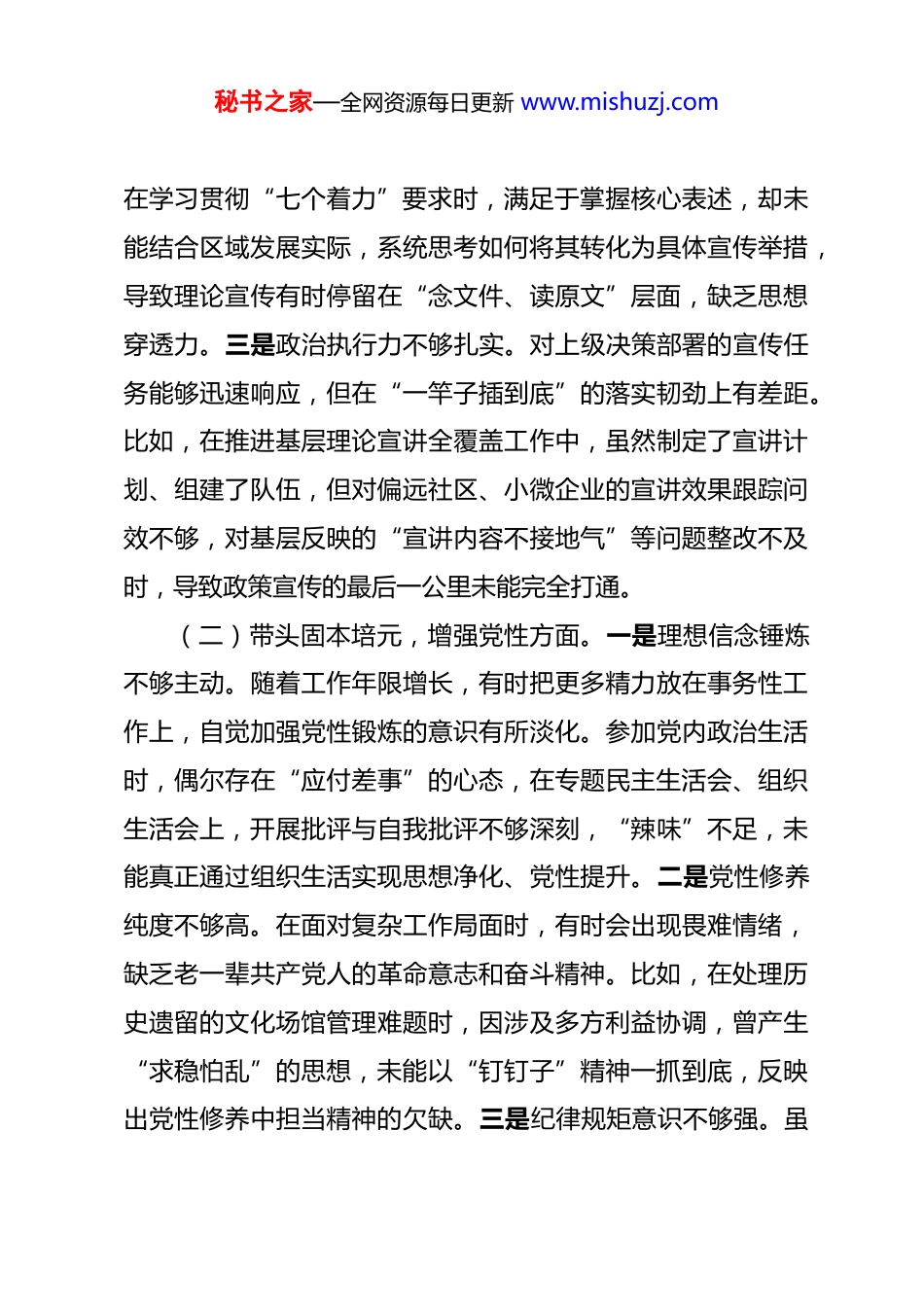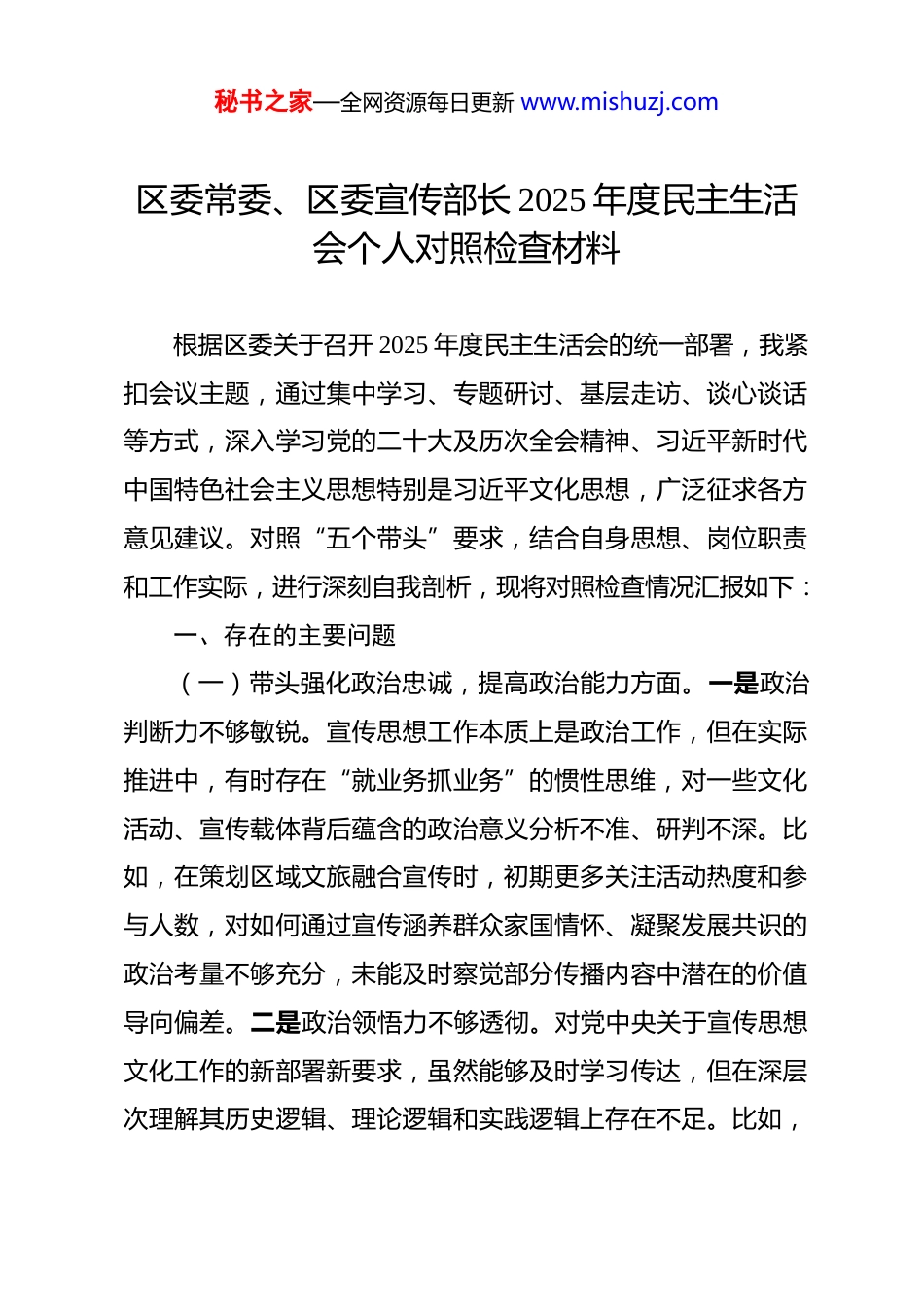 秘书之家—全网资源每日更新 www.mishuzj.com区委常委、区委宣传部长 2025 年度民主生活会个人对照检查材料 根据区委关于召开 2025 年度民主生活会的统一部署,我紧扣会议主题,通过集中学习、专题研讨、基层走访、谈心谈话等方式,深入学习党的二十大及历次全会精神、习近平新时代中国特色社会主义思想特别是习近平文化思想,广泛征求各方意见建议。对照“五个带头”要求,结合自身思想、岗位职责和工作实际,进行深刻自我剖析,现将对照检查情况汇报如下:一、存在的主要问题(一)带头强化政治忠诚,提高政治能力方面。一是政治判断力不够敏锐。宣传思想工作本质上是政治工作,但在实际推进中,有时存在“就业务抓业务”的惯性思维,对一些文化活动、宣传载体背后蕴含的政治意义分析不准、研判不深。比如,在策划区域文旅融合宣传时,初期更多关注活动热度和参与人数,对如何通过宣传涵养群众家国情怀、凝聚发展共识的政治考量不够充分,未能及时察觉部分传播内容中潜在的价值导向偏差。二是政治领悟力不够透彻。对党中央关于宣传思想文化工作的新部署新要求,虽然能够及时学习传达,但在深层次理解其历史逻辑、理论逻辑和实践逻辑上存在不足。比如,秘书之家—全网资源每日更新 www.mishuzj.com在学习贯彻“七个着力”要求时,满足于掌握核心表述,却未能结合区域发展实际,系统思考如何将其转化为具体宣传举措,导致理论宣传有时停留在“念文件、读原文”层面,缺乏思想穿透力。三是政治执行力不够扎实。对上级决策部署的宣传任务能够迅速响应,但在“一竿子插到底”的落实韧劲上有差距。比如,在推进基层理论宣讲全覆盖工作中,虽然制定了宣讲计划、组建了队伍,但对偏远社区、小微企业的宣讲效果跟踪问效不够,对基层反映的“宣讲内容不接地气”等问题整改不及时,导致政策宣传的最后一公里未能完全打通。(二)带头固本培元,增强党性方面。一是理想信念锤炼不够主动。随着工作年限增长,有时把更多精力放在事务性工作上,自觉加强党性锻炼的意识有所淡化。参加党内政治生活时,偶尔存在“应付差事”的心态,在专题民主生活会、组织生活会上,开展批评与自我批评不够深刻,“辣味”不足,未能真正通过组织生活实现思想净化、党性提升。二是党性修养纯度不够高。在面对复杂工作局面时,有时会出现畏难情绪,缺乏老一辈共产党人的革命意志和奋斗精神。比如,在处理历史遗留的文化场馆管理难题时,因涉及多方利益协调,曾产生“求稳怕乱”的思想,未能以“钉钉子”精神一抓到底,反映出党性修养中担当精神的欠缺。三是纪律规矩意识不够强。虽秘书之家—全网资源每日更新 www.mishuzj.com然能够遵守党的各项纪律,但在细节把控上不够严格。比如,在统筹推进宣传工作时,有时为了赶进度,对部分宣传稿件的政治把关不够细致,存在“重形式轻内容”的倾向;在部务会决策中,偶尔因时间紧张,对不同意见的听取不够充分,未能完全做到民主集中制要求。(三)带头敬畏人民、敬畏组织、敬畏法纪方面。一是宗旨意识践行不够深入。始终强调“以人民为中心”的宣传导向,但深入基层了解群众真实需求不够扎实。下基层调研多是“定点走访”,与群众面对面、心贴心交流不多,对群众反映强烈的“文化供给不均衡”“老旧小区宣传设施不足”等问题,回应不够及时。比如,在推进“文化惠民工程”中,因前期调研不充分,部分新建的文化活动点与群众实际需求脱节,使用率不高。二是组织观念树立不够牢固。对组织安排的工作能够认真落实,但主动向组织汇报思想、工作进展的意识不够强。在涉及跨部门协作的宣传任务中,有时更多考虑本部门工作便利,对区委整体工作部署的衔接不够紧密。比如,在配合全区重大项目宣传时,未能主动与项目牵头部门对接,导致宣传节奏与项目推进不同步,影响了整体工作成效。三是法治思维运用不够熟练。对宣传领域相关法律法规学习不够系统,在工作中运用法治方式解决问题的能力不足。比秘书之家—全网资源每日更新 www.mishuzj.com如,在规范自媒体传播秩序、处理网络谣言等工作中,有时习惯于行政协调手段,对如何运用《网络信息内容生态治理规定》等法律法规...