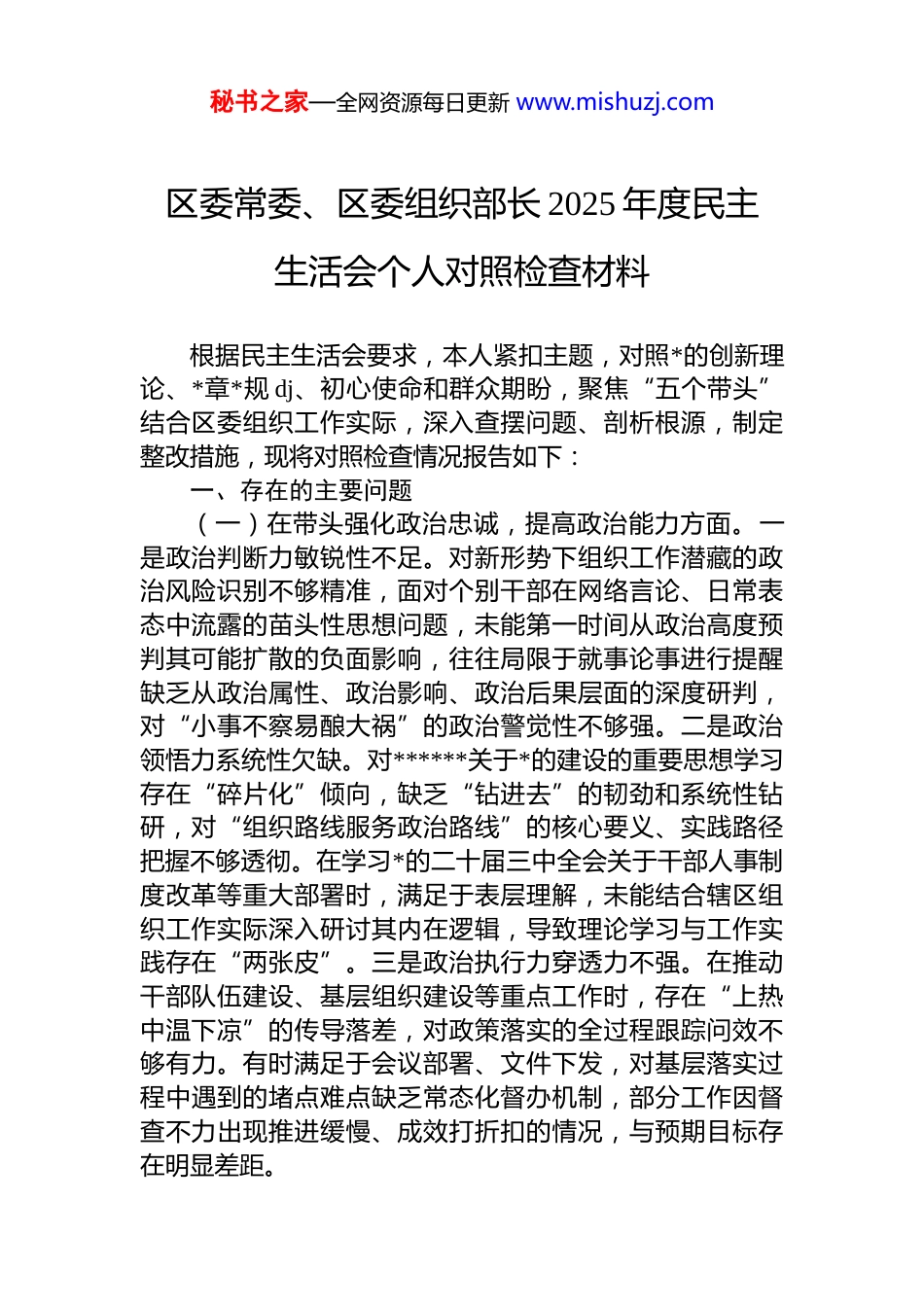 秘书之家—全网资源每日更新 www.mishuzj.com区委常委、区委组织部长 2025 年度民主生活会个人对照检查材料根据民主生活会要求,本人紧扣主题,对照*的创新理论、*章*规 dj、初心使命和群众期盼,聚焦“五个带头”结合区委组织工作实际,深入查摆问题、剖析根源,制定整改措施,现将对照检查情况报告如下:一、存在的主要问题(一)在带头强化政治忠诚,提高政治能力方面。一是政治判断力敏锐性不足。对新形势下组织工作潜藏的政治风险识别不够精准,面对个别干部在网络言论、日常表态中流露的苗头性思想问题,未能第一时间从政治高度预判其可能扩散的负面影响,往往局限于就事论事进行提醒缺乏从政治属性、政治影响、政治后果层面的深度研判,对“小事不察易酿大祸”的政治警觉性不够强。二是政治领悟力系统性欠缺。对******关于*的建设的重要思想学习存在“碎片化”倾向,缺乏“钻进去”的韧劲和系统性钻研,对“组织路线服务政治路线”的核心要义、实践路径把握不够透彻。在学习*的二十届三中全会关于干部人事制度改革等重大部署时,满足于表层理解,未能结合辖区组织工作实际深入研讨其内在逻辑,导致理论学习与工作实践存在“两张皮”。三是政治执行力穿透力不强。在推动干部队伍建设、基层组织建设等重点工作时,存在“上热中温下凉”的传导落差,对政策落实的全过程跟踪问效不够有力。有时满足于会议部署、文件下发,对基层落实过程中遇到的堵点难点缺乏常态化督办机制,部分工作因督查不力出现推进缓慢、成效打折扣的情况,与预期目标存在明显差距。秘书之家—全网资源每日更新 www.mishuzj.com(二)在带头固本培元,增强*性方面。一是理想信念根基不够牢固。虽然常态化参加各类学习教育,但有时存在“学用脱节”现象,对“为*育人、为国育才”的使命担当感悟不够深刻。在面对组织工作中的复杂矛盾和繁重任务时,偶尔出现思想松懈、动力不足的情况,缺乏“时时放心不下”的责任感,在重大任务考验面前,理想信念对工作的引领支撑作用未能充分发挥。二是*性修养提纯不够彻底。随着工作年限增长和岗位变化,自我革命精神有所弱化,对*性修养的终身性认识不足。在民主生活会和组织生活会上,批评与自我批评武器运用不够有力,存在避重就轻、以工作建议代替思想交锋的问题,不敢直面自身思想深处的短板和不足,未能真正做到“红脸出汗、排毒治病”,导致一些思想层面的小问题逐渐积累。三是宗旨意识践行不够到位。在*性锻炼中未能始终以“公与私”为根本尺子,偶尔存在重业务轻*性、重形式轻实效的倾向。有时把个人分管工作成绩看得过重,在谋划工作时更多考虑业务指标完成情况,对*性修养的日常锤炼有所忽视,把参加组织生活、开展*性教育当作“任务来完成”,缺乏主动践行宗旨意识的内在自觉。(三)在带头敬畏人民、敬畏组织、敬畏法纪方面。一是敬畏人民的宗旨意识内化不深。践行“四下基层”要求不够扎实,下基层调研存在“路径依赖”,提前安排路线、听取基层干部汇报多,“四不两直”随机走访、蹲点调研少。对基层*员群众在干部选拔、人才服务、*组织作用发挥等方面的急难愁盼问题摸排不够精准,往往满足于“收到诉求”,但在跟踪解决、闭环落实上做得不够,未能真正把群众满意度作为衡量工作的根本标准。二是敬畏组织的规矩意识执行不严。在落实民主集中制时,有时存在“事前酝酿不充分、事中发言不主动”的情况。在研究干部任免、项目安排等重大事项时,对自己分管领域的工作思考较多,发表意见较为积极,但对非分管领域的工作秘书之家—全网资源每日更新 www.mishuzj.com参与讨论不够深入,缺乏主动建言献策的责任担当,没有完全做到自觉维护组织决策的科学性和严肃性。三是敬畏法纪的法治思维树立不牢。对组织工作相关法律法规、dj*规学习不够系统,存在“急用才学、不学也用”的被动倾向。在干部监督管理、组织程序执行等工作中,有时存在重程序合规、轻实质公正的倾向,认为只要流程到位就是合规,对程序背后的法治精神理解不够透彻,运用法治方式破解干部管理、基层治理难题的能力有待提升。(四)在带头干事创业,担当作为方面。一是斗争精神不够强烈。...