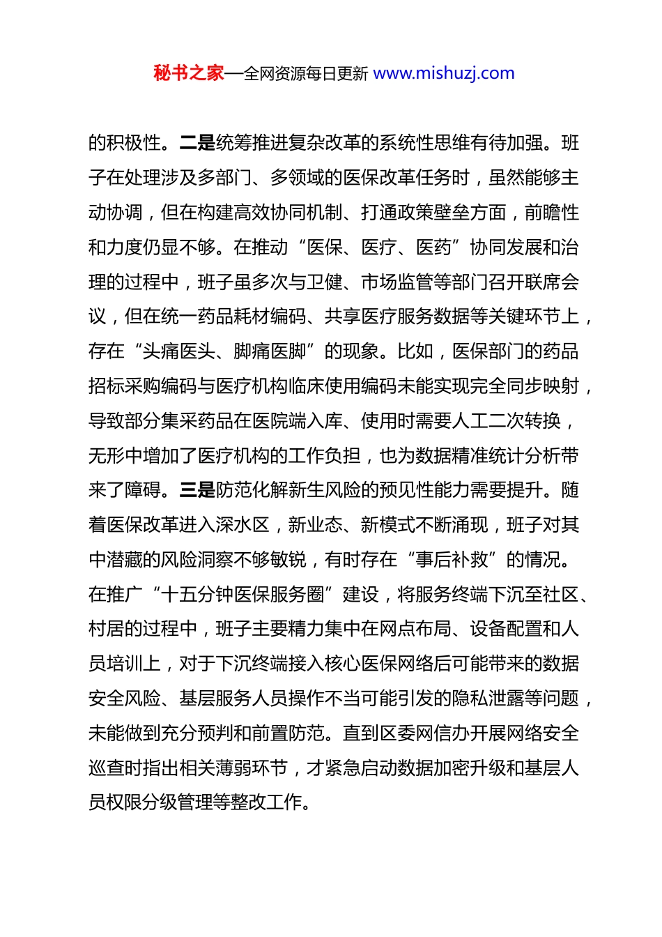 秘书之家—全网资源每日更新 www.mishuzj.com区医疗保障局领导班子 2025 年度民主生活会对照检查材料 根据区委关于召开 2025 年度民主生活会的统一部署,XX区医疗保障局领导班子紧扣会议主题,深入学习贯彻习近平新时代中国特色社会主义思想、党的二十届三中及四中全会精神,广泛征求意见建议,深入开展谈心谈话,全面梳理检视问题,深刻剖析问题根源,明确了今后努力方向和整改措施。现将班子对照检查情况报告如下。一、存在的主要问题(一)在带头强化政治忠诚、提高政治能力方面。一是将顶层设计转化为地方实践的穿透力尚有不足。班子在执行国家和省、市关于医疗保障工作的重大决策部署时,政治立场坚定,行动迅速,但在政策落地的精细化、差异化方面思考不够深。例如,在全面推进 DRG 支付方式改革进程中,班子初期更多地是传达上级文件精神和技术规范要求,对于如何结合本区医疗机构收治病种复杂性、群众就医习惯等实际情况,建立更具本地适应性的权重和费率动态调整建议机制,研究得不够透彻。这导致部分医疗机构在改革初期反映,个别病组的分值设定未能完全体现本地高发病种的资源消耗强度,影响了其参与改革秘书之家—全网资源每日更新 www.mishuzj.com的积极性。二是统筹推进复杂改革的系统性思维有待加强。班子在处理涉及多部门、多领域的医保改革任务时,虽然能够主动协调,但在构建高效协同机制、打通政策壁垒方面,前瞻性和力度仍显不够。在推动“医保、医疗、医药”协同发展和治理的过程中,班子虽多次与卫健、市场监管等部门召开联席会议,但在统一药品耗材编码、共享医疗服务数据等关键环节上,存在“头痛医头、脚痛医脚”的现象。比如,医保部门的药品招标采购编码与医疗机构临床使用编码未能实现完全同步映射,导致部分集采药品在医院端入库、使用时需要人工二次转换,无形中增加了医疗机构的工作负担,也为数据精准统计分析带来了障碍。三是防范化解新生风险的预见性能力需要提升。随着医保改革进入深水区,新业态、新模式不断涌现,班子对其中潜藏的风险洞察不够敏锐,有时存在“事后补救”的情况。在推广“十五分钟医保服务圈”建设,将服务终端下沉至社区、村居的过程中,班子主要精力集中在网点布局、设备配置和人员培训上,对于下沉终端接入核心医保网络后可能带来的数据安全风险、基层服务人员操作不当可能引发的隐私泄露等问题,未能做到充分预判和前置防范。直到区委网信办开展网络安全巡查时指出相关薄弱环节,才紧急启动数据加密升级和基层人员权限分级管理等整改工作。秘书之家—全网资源每日更新 www.mishuzj.com(二)在带头固本培元、增强党性方面。一是理论学习与医保业务深度融合的转化效果不佳。班子坚持党组理论学习中心组学习制度,能够及时跟进学习党的二十届四中全会精神等最新理论成果,但在“学思用贯通、知信行统一”上还存在差距。例如,在学习领会“发展新质生产力”这一重大论述时,党组中心组的研讨多停留在理解概念、把握要求层面,对于如何运用其核心要义,推动医保基金监管方式从传统的人力核查向大数据、人工智能驱动的预测式、智能化监管转型升级,探索建立“AI 稽核医生”等创新应用,缺乏系统性的思考和具体的行动方案,导致理论学习与推动医保事业高质量发展的实际结合不够紧密。二是党性修养内化为工作作风的自觉性有待提高。班子成员能够自觉遵守党章党规党纪,但在将坚定的党性原则时时处处体现到具体工作中,还存在薄弱环节。尽管在各种会议上反复强调要站稳人民立场,优化经办服务,但在审视内部工作流程时,有时仍不自觉地带有“管理本位”思想。比如,在制定异地就医直接结算备案流程时,为确保基金安全,设置的审核环节较为繁琐,要求参保群众上传多种证明材料。虽然符合规定,但未能充分站在办事群众的角度,通过部门间信息共享等方式简化手续,导致部分有实际困难的群众感到“备案难”,这与共产党人为民服务的根本宗旨存在一定温差。秘书之家—全网资源每日更新 www.mishuzj.com三是开展批评与自我批评的“辣味”尚显不足。在民主生活会和组织生活会上,班子成员之间能够坦诚相见,但有时批评意见...