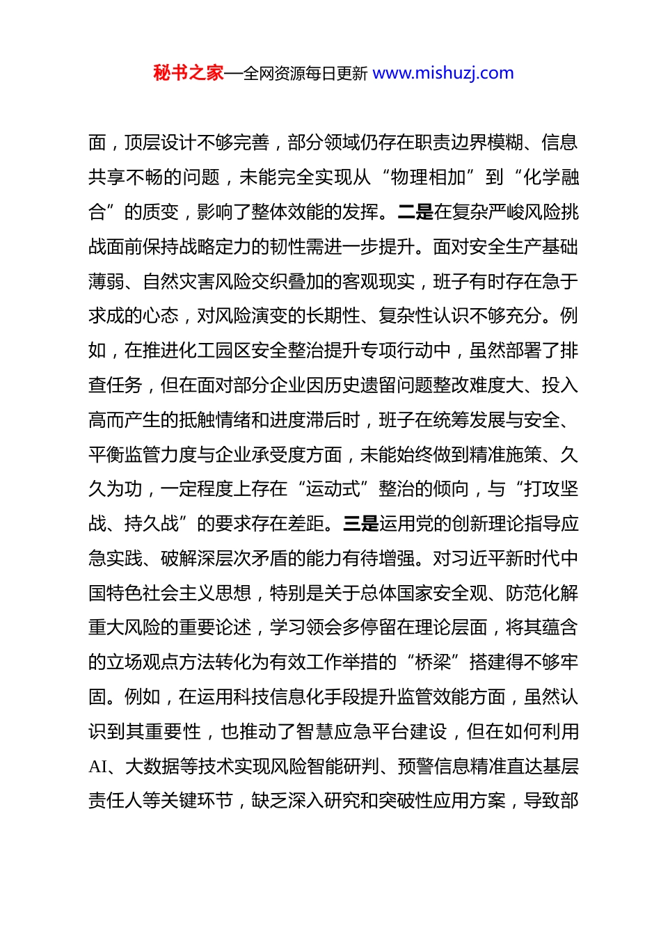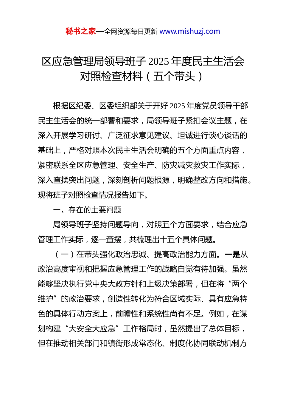 秘书之家—全网资源每日更新 www.mishuzj.com区应急管理局领导班子 2025 年度民主生活会对照检查材料(五个带头)根据区纪委、区委组织部关于开好 2025 年度党员领导干部民主生活会的统一部署和要求,局领导班子紧扣会议主题,在深入开展学习研讨、广泛征求意见建议、坦诚进行谈心谈话的基础上,严格对照本次民主生活会明确的五个方面重点内容,紧密联系全区应急管理、安全生产、防灾减灾救灾工作实际,深入查摆突出问题,深刻剖析问题根源,明确整改方向和措施。现将班子对照检查情况报告如下。一、存在的主要问题局领导班子坚持问题导向,对照五个方面要求,结合应急管理工作实际,逐一查摆,共梳理出十五个具体问题。(一)在带头强化政治忠诚、提高政治能力方面。一是从政治高度审视和把握应急管理工作的战略自觉有待加强。虽然能够坚决执行党中央大政方针和上级决策部署,但在将“两个维护”的政治要求,创造性转化为符合区域实际、具有应急特色的具体行动方案上,前瞻性和系统性尚有不足。例如,在谋划构建“大安全大应急”工作格局时,虽然提出了总体目标,但在推动相关部门和镇街形成常态化、制度化协同联动机制方秘书之家—全网资源每日更新 www.mishuzj.com面,顶层设计不够完善,部分领域仍存在职责边界模糊、信息共享不畅的问题,未能完全实现从“物理相加”到“化学融合”的质变,影响了整体效能的发挥。二是在复杂严峻风险挑战面前保持战略定力的韧性需进一步提升。面对安全生产基础薄弱、自然灾害风险交织叠加的客观现实,班子有时存在急于求成的心态,对风险演变的长期性、复杂性认识不够充分。例如,在推进化工园区安全整治提升专项行动中,虽然部署了排查任务,但在面对部分企业因历史遗留问题整改难度大、投入高而产生的抵触情绪和进度滞后时,班子在统筹发展与安全、平衡监管力度与企业承受度方面,未能始终做到精准施策、久久为功,一定程度上存在“运动式”整治的倾向,与“打攻坚战、持久战”的要求存在差距。三是运用党的创新理论指导应急实践、破解深层次矛盾的能力有待增强。对习近平新时代中国特色社会主义思想,特别是关于总体国家安全观、防范化解重大风险的重要论述,学习领会多停留在理论层面,将其蕴含的立场观点方法转化为有效工作举措的“桥梁”搭建得不够牢固。例如,在运用科技信息化手段提升监管效能方面,虽然认识到其重要性,也推动了智慧应急平台建设,但在如何利用AI、大数据等技术实现风险智能研判、预警信息精准直达基层责任人等关键环节,缺乏深入研究和突破性应用方案,导致部秘书之家—全网资源每日更新 www.mishuzj.com分工作仍依赖于传统人海战术,前瞻性风险防控能力不足。(二)在带头固本培元、增强党性方面。一是理论武装的深度与转化效率有待提高。班子集体学习能够按时开展,但在读原著、学原文、悟原理上下的功夫还不够深,满足于“已学习”,在“真领会”、“善运用”上存在短板。学习内容与应急管理主责主业结合不够紧密,未能完全将学习成果系统性地转化为提升党性修养、指导工作实践的强大动力。例如,在组织学习党的二十届四中全会精神时,更多关注了宏观部署,对于如何将其精神实质具体化为完善我区应急管理体系、提升依法应急能力的可操作路径,研讨不够深入,形成的指导性意见较为原则。二是党性锻炼的主动性和常态化机制有待健全。班子成员能够以普通党员身份参加组织生活,但在运用批评和自我批评武器打扫思想灰尘、增强政治免疫力方面,有时存在“好人主义”思想,辣味不足。班子成员之间工作交流多,思想交锋少;谈具体业务多,触及灵魂深处的党性分析少。例如,在年度述职或专题组织生活会上,自我批评往往谈工作问题多、谈思想根源少,相互批评也多以工作建议代替思想帮助,未能真正达到红脸出汗、排毒治病的效果,影响了党性修养的持续锤炼。三是在弘扬共产党人精神追求、筑牢信仰之基上示范引领作用有待强化。班子能够坚守廉洁底线,但在以自身过硬党秘书之家—全网资源每日更新 www.mishuzj.com性引领全局党员干部筑牢世界观、人生观、价值观“总开关”方面,载体和抓手不够丰富。应急管理工作压...
