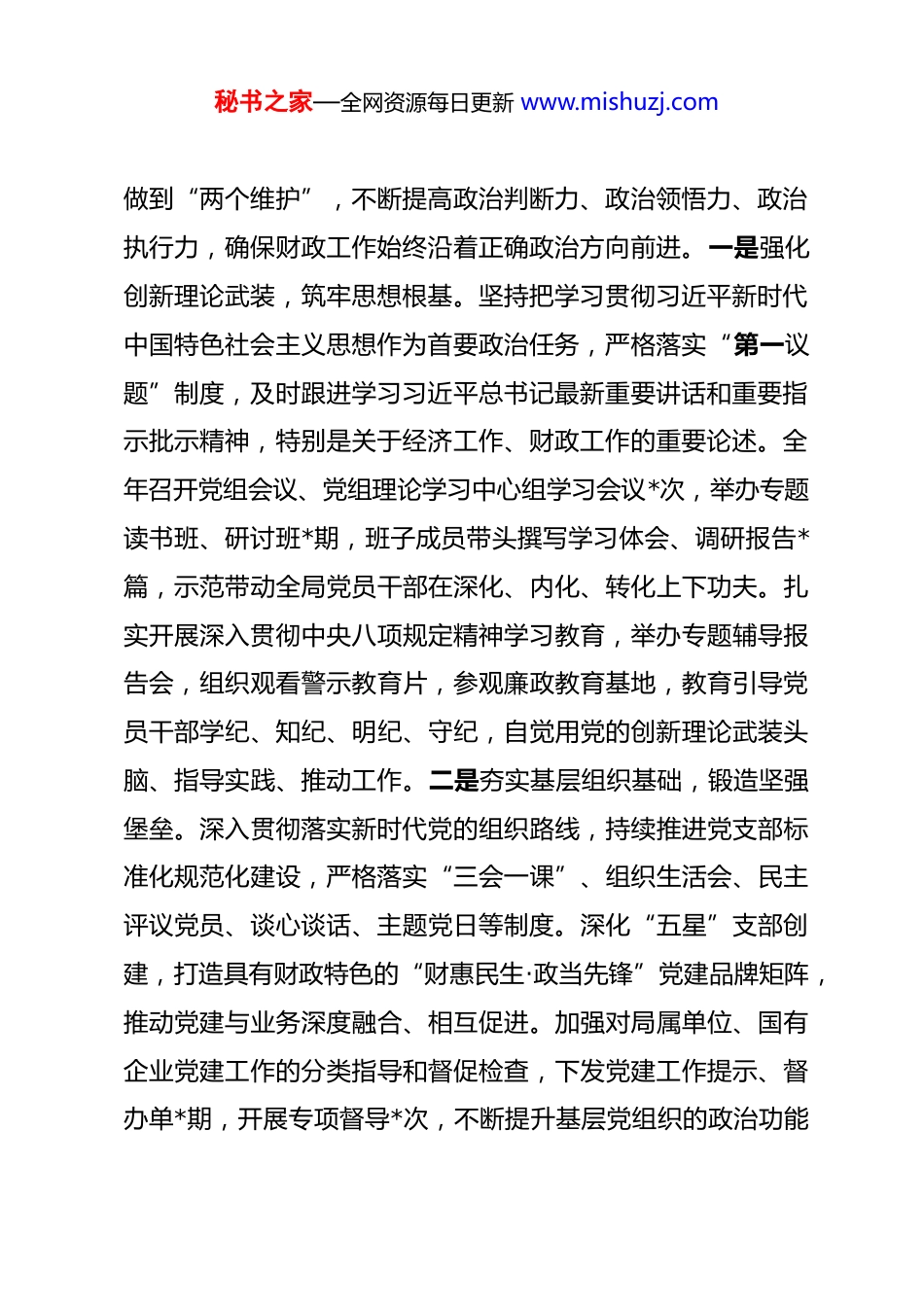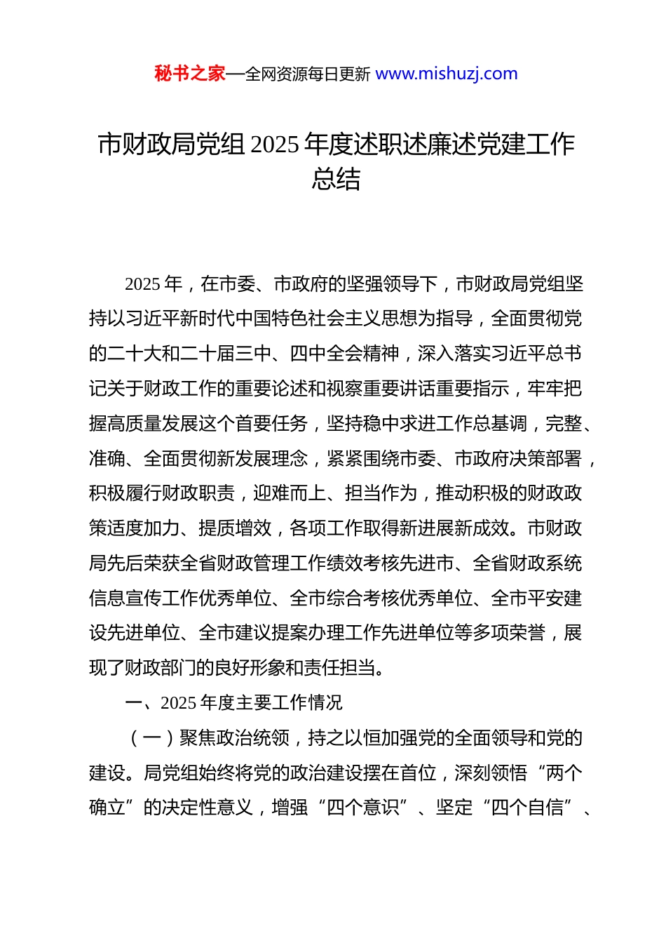 秘书之家—全网资源每日更新 www.mishuzj.com市财政局党组 2025 年度述职述廉述党建工作总结 2025 年,在市委、市政府的坚强领导下,市财政局党组坚持以习近平新时代中国特色社会主义思想为指导,全面贯彻党的二十大和二十届三中、四中全会精神,深入落实习近平总书记关于财政工作的重要论述和视察重要讲话重要指示,牢牢把握高质量发展这个首要任务,坚持稳中求进工作总基调,完整、准确、全面贯彻新发展理念,紧紧围绕市委、市政府决策部署,积极履行财政职责,迎难而上、担当作为,推动积极的财政政策适度加力、提质增效,各项工作取得新进展新成效。市财政局先后荣获全省财政管理工作绩效考核先进市、全省财政系统信息宣传工作优秀单位、全市综合考核优秀单位、全市平安建设先进单位、全市建议提案办理工作先进单位等多项荣誉,展现了财政部门的良好形象和责任担当。一、2025 年度主要工作情况(一)聚焦政治统领,持之以恒加强党的全面领导和党的建设。局党组始终将党的政治建设摆在首位,深刻领悟“两个确立”的决定性意义,增强“四个意识”、坚定“四个自信”、秘书之家—全网资源每日更新 www.mishuzj.com做到“两个维护”,不断提高政治判断力、政治领悟力、政治执行力,确保财政工作始终沿着正确政治方向前进。一是强化创新理论武装,筑牢思想根基。坚持把学习贯彻习近平新时代中国特色社会主义思想作为首要政治任务,严格落实“第一议题”制度,及时跟进学习习近平总书记最新重要讲话和重要指示批示精神,特别是关于经济工作、财政工作的重要论述。全年召开党组会议、党组理论学习中心组学习会议*次,举办专题读书班、研讨班*期,班子成员带头撰写学习体会、调研报告*篇,示范带动全局党员干部在深化、内化、转化上下功夫。扎实开展深入贯彻中央八项规定精神学习教育,举办专题辅导报告会,组织观看警示教育片,参观廉政教育基地,教育引导党员干部学纪、知纪、明纪、守纪,自觉用党的创新理论武装头脑、指导实践、推动工作。二是夯实基层组织基础,锻造坚强堡垒。深入贯彻落实新时代党的组织路线,持续推进党支部标准化规范化建设,严格落实“三会一课”、组织生活会、民主评议党员、谈心谈话、主题党日等制度。深化“五星”支部创建,打造具有财政特色的“财惠民生·政当先锋”党建品牌矩阵,推动党建与业务深度融合、相互促进。加强对局属单位、国有企业党建工作的分类指导和督促检查,下发党建工作提示、督办单*期,开展专项督导*次,不断提升基层党组织的政治功能秘书之家—全网资源每日更新 www.mishuzj.com和组织功能。注重在财政改革发展一线考察识别干部,激励干部新时代新担当新作为。三是纵深推进全面从严治党,涵养清风正气。坚决扛起全面从严治党主体责任,党组书记认真履行第一责任人职责,班子成员严格落实“一岗双责”,年初召开全市财政系统党风廉政建设工作会议,层层签订责任书。聚焦预算管理、资金分配、政府采购、国资监管、政府投资评审等重点领域和关键环节,深入开展廉政风险排查防控,健全完善内控制度体系。锲而不舍落实中央八项规定及其实施细则精神和我市实施办法,紧盯“四风”隐形变异新动向,加强重要时间节点的廉政提醒和监督检查。全力支持配合市纪委监委派驻纪检监察组履行职责,自觉接受监督。全年开展各类廉政谈话、提醒谈话*人次,严肃查处违纪违规问题,持续巩固风清气正的良好政治生态。四是牢牢掌握意识形态领导权,守好主阵地。严格落实意识形态工作责任制,定期分析研判财政领域意识形态风险。加强局门户网站、“财政”微信公众号等宣传思想阵地建设和管理,围绕财政中心工作,讲好财政故事,传播财政好声音。加强财政文化建设,弘扬忠诚、干净、担当的职业精神。健全网络舆情监测、研判、处置机制,积极回应社会关切,全年妥善处置涉财舆情*起,有效维护了财政部门的公信力和社会形象。秘书之家—全网资源每日更新 www.mishuzj.com(二)聚焦主责主业,科学精准施策保障财政平稳健康运行。面对复杂严峻的经济形势和艰巨的财政收支平衡压力,坚持科学研判、精准调度,努力实现财政收入量质齐升、支出保障有力有效...