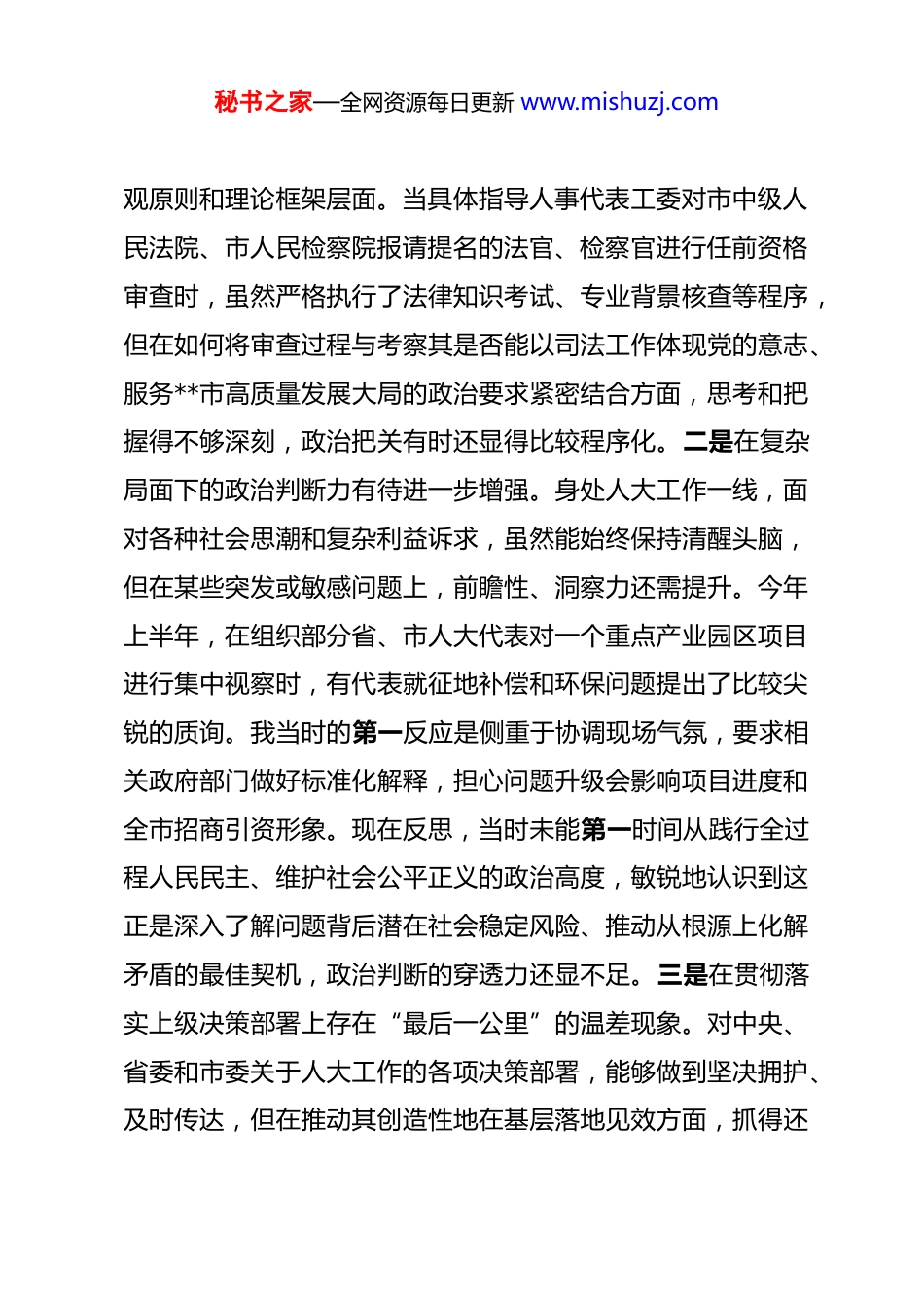 秘书之家—全网资源每日更新 www.mishuzj.com市人大常委会副主任 2025 年度民主生活会个人对照检查材料 根据市委关于召开 2025 年度民主生活会的统一部署和要求,我紧扣本次民主生活会主题,在深入学习党的二十届三中、四中全会精神和习近平总书记重要讲话、重要指示批示精神,特别是关于作风建设重要论述的基础上,通过群众提、自己找、上级点、互相帮等多种方式,广泛征求意见建议,并与班子成员、分管部门同志深入开展谈心谈话。在此基础上,我围绕“五个带头”要求,紧密联系个人思想、学习和工作实际,深入查摆了自身存在的突出问题,深刻剖析了问题产生的根源,并明确了今后的努力方向和整改措施。现将个人对照检查情况报告如下。一、存在的主要问题(一)在带头强化政治忠诚、提高政治能力方面。一是在理论学习与履职实践的结合上存在差距。对习近平新时代中国特色社会主义思想,特别是关于坚持和完善人民代表大会制度的重要思想,能够做到常学常新,但在“知行合一、学以致用”上还不够深入。例如,在学习党的二十届四中全会关于完善中国特色社会主义法律体系的精神时,更多地停留在领会宏秘书之家—全网资源每日更新 www.mishuzj.com观原则和理论框架层面。当具体指导人事代表工委对市中级人民法院、市人民检察院报请提名的法官、检察官进行任前资格审查时,虽然严格执行了法律知识考试、专业背景核查等程序,但在如何将审查过程与考察其是否能以司法工作体现党的意志、服务**市高质量发展大局的政治要求紧密结合方面,思考和把握得不够深刻,政治把关有时还显得比较程序化。二是在复杂局面下的政治判断力有待进一步增强。身处人大工作一线,面对各种社会思潮和复杂利益诉求,虽然能始终保持清醒头脑,但在某些突发或敏感问题上,前瞻性、洞察力还需提升。今年上半年,在组织部分省、市人大代表对一个重点产业园区项目进行集中视察时,有代表就征地补偿和环保问题提出了比较尖锐的质询。我当时的第一反应是侧重于协调现场气氛,要求相关政府部门做好标准化解释,担心问题升级会影响项目进度和全市招商引资形象。现在反思,当时未能第一时间从践行全过程人民民主、维护社会公平正义的政治高度,敏锐地认识到这正是深入了解问题背后潜在社会稳定风险、推动从根源上化解矛盾的最佳契机,政治判断的穿透力还显不足。三是在贯彻落实上级决策部署上存在“最后一公里”的温差现象。对中央、省委和市委关于人大工作的各项决策部署,能够做到坚决拥护、及时传达,但在推动其创造性地在基层落地见效方面,抓得还秘书之家—全网资源每日更新 www.mishuzj.com不够实、不够细。例如,上级反复强调要充分发挥人大代表在基层治理中的主体作用,我虽然牵头组织了多次代表履职能力提升专题培训班,也大力推动了代表联络站的标准化建设,但工作有时止步于“建好平台”“搞好活动”的层面。在对某县代表联络站工作的一次调研中发现,部分联络站的活动仍存在流程化、形式化倾向,群众意见“上得来”但转化为治理效能“下得去”的闭环机制尚不顺畅。我的督促指导更多地关注了活动次数、台账记录等显性指标,对解决问题的实际成效追得不紧,导致上级要求与基层实践之间存在一定的温差。(二)在带头固本培元、增强党性方面。一是主动投身党性锤炼的“熔炉”意识有所弱化。随着工作阅历和党龄的增长,有时会不自觉地产生一种“经验主义”思想,认为自己受党教育多年,党性观念是稳固的。因此,在参加所在党支部的组织生活时,有时抱着“完成任务”的心态,把自己等同于一名普通党员去严格要求、主动淬炼的意识有所淡化。例如,在一次以“新时代如何传承弘扬长征精神和**会议精神”为主题的党日活动中,我的发言更多的是对既有材料的梳理和阐述,对照革命先辈的崇高精神,深刻反思自身在思想境界、担当精神上的差距,深入剖析如何将伟大精神转化为做好人事代表工作的具体行动方面,触及灵魂的深度不够。二是在理想信念教育的秘书之家—全网资源每日更新 www.mishuzj.com内化于心上做得还不够。坚守共产党人的精神追求,解决好世界观、人生观、价值观这个“总开关”问题,需要持之以恒的自...