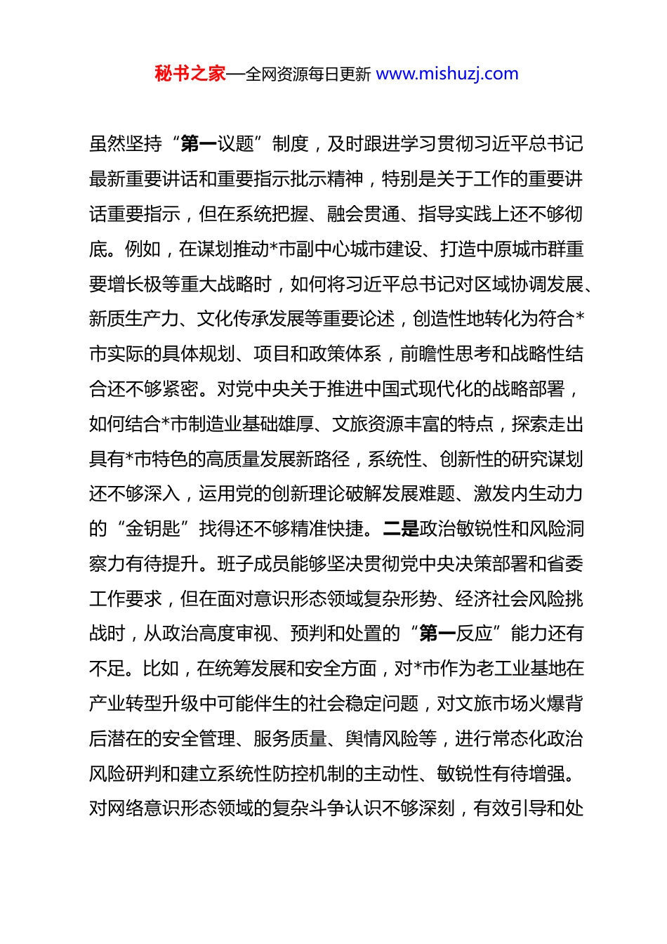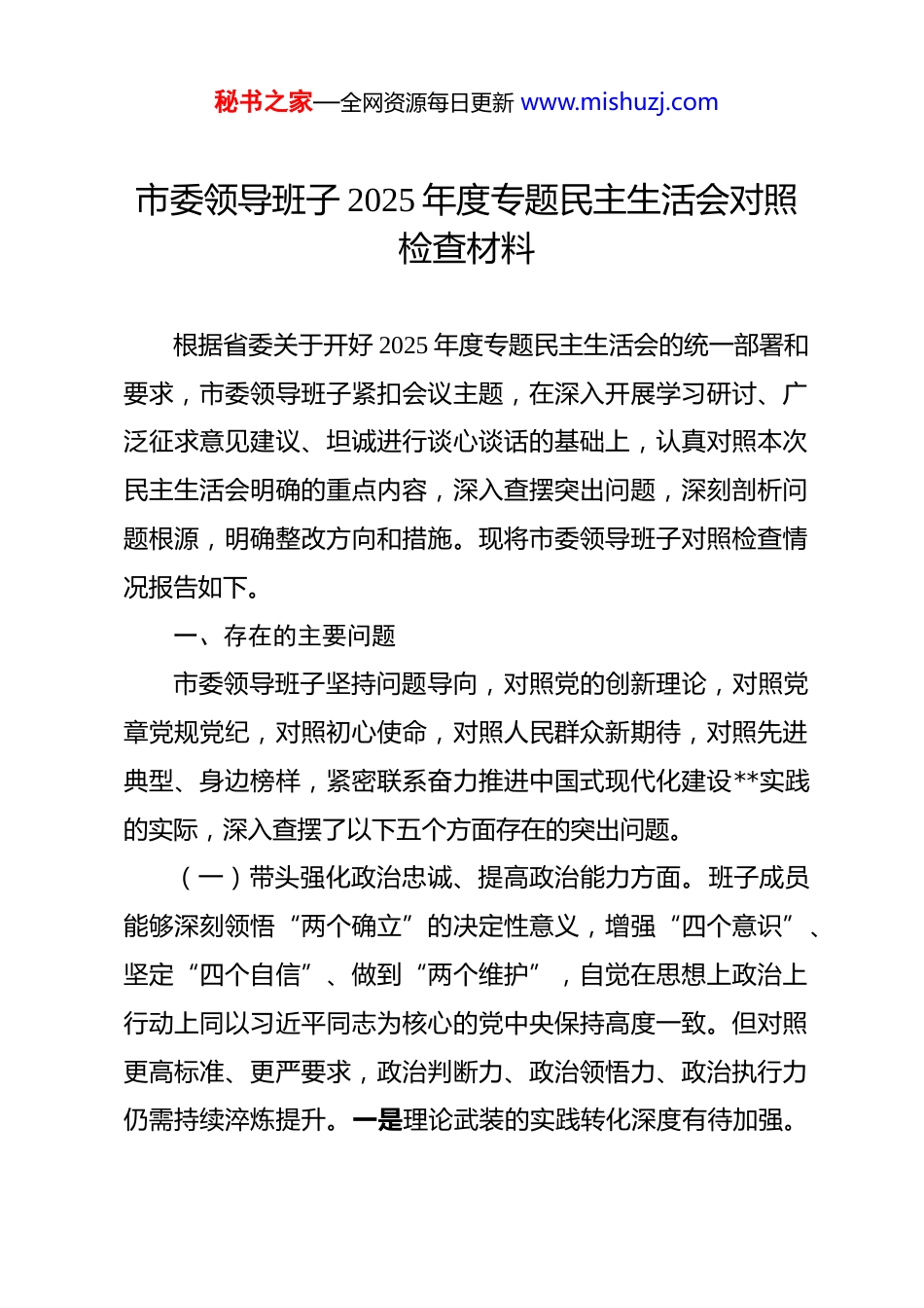 秘书之家—全网资源每日更新 www.mishuzj.com市委领导班子 2025 年度专题民主生活会对照检查材料 根据省委关于开好 2025 年度专题民主生活会的统一部署和要求,市委领导班子紧扣会议主题,在深入开展学习研讨、广泛征求意见建议、坦诚进行谈心谈话的基础上,认真对照本次民主生活会明确的重点内容,深入查摆突出问题,深刻剖析问题根源,明确整改方向和措施。现将市委领导班子对照检查情况报告如下。一、存在的主要问题市委领导班子坚持问题导向,对照党的创新理论,对照党章党规党纪,对照初心使命,对照人民群众新期待,对照先进典型、身边榜样,紧密联系奋力推进中国式现代化建设**实践的实际,深入查摆了以下五个方面存在的突出问题。(一)带头强化政治忠诚、提高政治能力方面。班子成员能够深刻领悟“两个确立”的决定性意义,增强“四个意识”、坚定“四个自信”、做到“两个维护”,自觉在思想上政治上行动上同以习近平同志为核心的党中央保持高度一致。但对照更高标准、更严要求,政治判断力、政治领悟力、政治执行力仍需持续淬炼提升。一是理论武装的实践转化深度有待加强。秘书之家—全网资源每日更新 www.mishuzj.com虽然坚持“第一议题”制度,及时跟进学习贯彻习近平总书记最新重要讲话和重要指示批示精神,特别是关于工作的重要讲话重要指示,但在系统把握、融会贯通、指导实践上还不够彻底。例如,在谋划推动*市副中心城市建设、打造中原城市群重要增长极等重大战略时,如何将习近平总书记对区域协调发展、新质生产力、文化传承发展等重要论述,创造性地转化为符合*市实际的具体规划、项目和政策体系,前瞻性思考和战略性结合还不够紧密。对党中央关于推进中国式现代化的战略部署,如何结合*市制造业基础雄厚、文旅资源丰富的特点,探索走出具有*市特色的高质量发展新路径,系统性、创新性的研究谋划还不够深入,运用党的创新理论破解发展难题、激发内生动力的“金钥匙”找得还不够精准快捷。二是政治敏锐性和风险洞察力有待提升。班子成员能够坚决贯彻党中央决策部署和省委工作要求,但在面对意识形态领域复杂形势、经济社会风险挑战时,从政治高度审视、预判和处置的“第一反应”能力还有不足。比如,在统筹发展和安全方面,对*市作为老工业基地在产业转型升级中可能伴生的社会稳定问题,对文旅市场火爆背后潜在的安全管理、服务质量、舆情风险等,进行常态化政治风险研判和建立系统性防控机制的主动性、敏锐性有待增强。对网络意识形态领域的复杂斗争认识不够深刻,有效引导和处秘书之家—全网资源每日更新 www.mishuzj.com置涉洛负面舆情、弘扬网上正能量的能力需进一步提高,政治“望远镜”和“显微镜”的焦距需时常校准。三是贯彻执行决策部署的力度均衡性有待优化。对于党中央和省委明确的“硬指标”“硬任务”,如黄河流域生态保护和高质量发展、南水北调后续工程高质量发展、耕地保护、安全生产等,能够不折不扣推进落实。但对于一些需要久久为功、绵绵用力的“软任务”,有时存在压力传导逐级递减、工作标准逐层放松的现象。例如,在落实“双碳”目标、推动发展方式绿色转型方面,虽然制定了相关规划,但在推动传统产业绿色化改造、培育绿色新兴产业、倡导全社会绿色生活方式等方面,缺乏更具刚性约束和激励作用的细化措施,一抓到底的狠劲和韧劲有待加强。在推动乡村全面振兴中,对如何将巩固拓展脱贫攻坚成果同乡村振兴有效衔接的政治要求,转化为每个村庄可持续的发展蓝图和农民可感知的实惠,精准滴灌、末端见效的功夫下得还不够深,存在政策落地“最后一公里”不够通畅的问题。(二)带头固本培元、增强党性方面。班子成员能够不断加强党性锻炼,努力提升党性修养,但在理想信念的持续筑牢、党性原则的严格坚守、道德品行的高标准践行上,仍有提升空间。一是理想信念的根基在复杂实践中偶有松动。面对*市改革发展稳定的繁重任务和深层次矛盾挑战,有时班子成员不自觉秘书之家—全网资源每日更新 www.mishuzj.com地陷入具体事务,静下心来从马克思主义立场观点方法、从共产党人初心使命的高度进行反思和内省不够经常。比如,在处理一些历史...