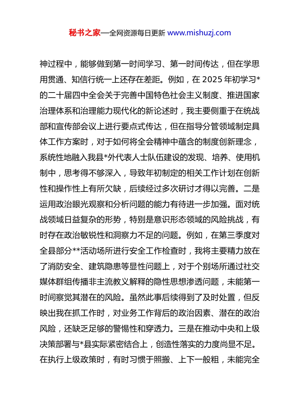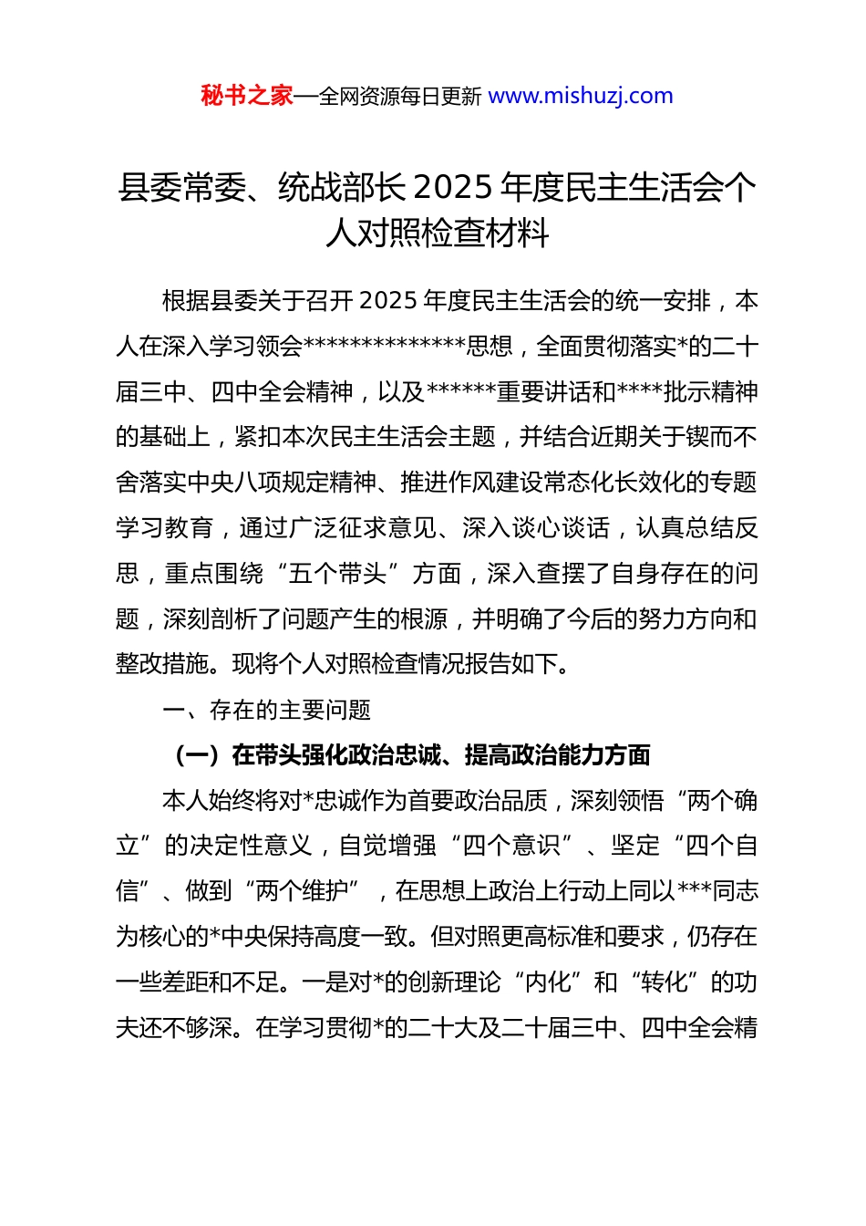秘书之家—全网资源每日更新 www.mishuzj.com县委常委、统战部长 2025 年度民主生活会个人对照检查材料根据县委关于召开 2025 年度民主生活会的统一安排,本人在深入学习领会**************思想,全面贯彻落实*的二十届三中、四中全会精神,以及******重要讲话和****批示精神的基础上,紧扣本次民主生活会主题,并结合近期关于锲而不舍落实中央八项规定精神、推进作风建设常态化长效化的专题学习教育,通过广泛征求意见、深入谈心谈话,认真总结反思,重点围绕“五个带头”方面,深入查摆了自身存在的问题,深刻剖析了问题产生的根源,并明确了今后的努力方向和整改措施。现将个人对照检查情况报告如下。一、存在的主要问题(一)在带头强化政治忠诚、提高政治能力方面本人始终将对*忠诚作为首要政治品质,深刻领悟“两个确立”的决定性意义,自觉增强“四个意识”、坚定“四个自信”、做到“两个维护”,在思想上政治上行动上同以***同志为核心的*中央保持高度一致。但对照更高标准和要求,仍存在一些差距和不足。一是对*的创新理论“内化”和“转化”的功夫还不够深。在学习贯彻*的二十大及二十届三中、四中全会精秘书之家—全网资源每日更新 www.mishuzj.com神过程中,能够做到第一时间学习、第一时间传达,但在学思用贯通、知信行统一上还存在差距。例如,在 2025 年初学习*的二十届四中全会关于完善中国特色社会主义制度、推进国家治理体系和治理能力现代化的新论述时,我主要侧重于在统战部和宣传部会议上进行要点式传达,但在指导分管领域制定具体工作方案时,对于如何将全会精神中蕴含的制度创新理念,系统性地融入我县*外代表人士队伍建设的发现、培养、使用机制中,思考得不够深入,导致年初制定的相关工作计划在创新性和操作性上有所欠缺,后续经过多次研讨才得以完善。二是运用政治眼光观察和分析问题的能力有待进一步加强。面对统战领域日益复杂的形势,特别是意识形态领域的风险挑战,有时存在政治敏锐性和洞察力不足的问题。例如,在第三季度对全县部分**活动场所进行安全工作检查时,我将主要精力放在了消防安全、建筑隐患等显性问题上,对于个别场所通过社交媒体群组传播非主流教义解释的隐性思想渗透问题,未能第一时间察觉其潜在的风险。虽然此事后续得到了及时处置,但反映出我在抓工作时,对业务工作背后的政治因素、潜在的政治风险,还缺乏足够的警惕性和穿透力。三是在推动中央和上级决策部署与*县实际紧密结合上,创造性落实的力度尚显不足。在执行上级政策时,有时习惯于照搬、上下一般粗,未能完全秘书之家—全网资源每日更新 www.mishuzj.com做到因地制宜、精准施策。例如,在落实省委关于建设“新的社会阶层人士统战工作实践创新基地”以助力乡村振兴的要求时,我一度倾向于在全县各乡镇推行一套标准化的建设模式。这种模式在电商产业基础较好的*镇取得了良好效果,但在以传统农业为主的**镇,则出现了基地“空转”、难以吸引目标人群、服务乡村振兴效果不彰的问题。这说明我在推动工作时,深入研究不同地域、不同群体的差异化需求不够,导致政策执行效果打了折扣。(二)在带头固本培元、增强*性方面本人始终坚持将加强*性修养作为终身课题,自觉用**************思想武装头脑,坚守共产*人的精神家园。但深刻反思,在*性锻炼的经常性、主动性上做得还不够。一是参加双重组织生活的标准有时不高。作为县委常委,因工作繁忙、会议活动多,有时会影响到以普通*员身份参加所在*支部的活动。今年 5 月份,*支部组织了一次主题*日活动,我因临时参加一个紧急的全县舆情处置会议而请了假。事后虽然自学了相关材料,但没有主动向支部书记汇报思想、进行补学交流,这在一定程度上反映出自己对严格执行双重组织生活制度的敬畏之心有所弱化,把自己等同于普通*员的意识还不够牢固。二是在开展批评与自我批评时“辣味”不足。在一些工作会议和组织生秘书之家—全网资源每日更新 www.mishuzj.com活会上,有时存在“老好人”思想,顾及情面,怕影响团结。在年中召开的部务会上,分管民族**工作的副部长汇报某项民族团结进步创建活动进展缓慢时,我更多...