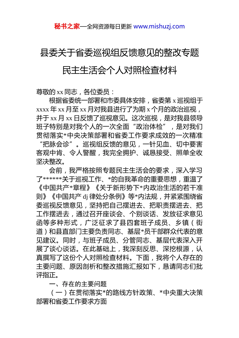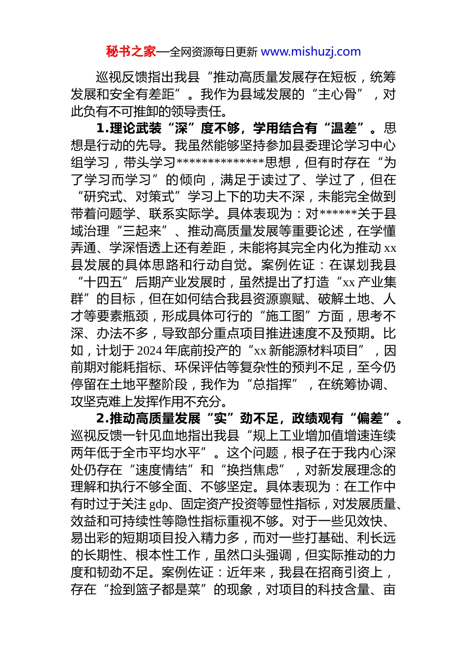 秘书之家—全网资源每日更新 www.mishuzj.com县委关于省委巡视组反馈意见的整改专题民主生活会个人对照检查材料尊敬的 xx 同志,各位委员:根据省委统一部署和市委具体安排,省委第 x 巡视组于xxxx 年 xx 月至 xx 月对我县进行了为期 x 个月的政治巡视,并于 xx 月 xx 日反馈了巡视意见。这次巡视,是对我县领导班子特别是对我个人的一次全面“政治体检”,是对我们贯彻落实*中央决策部署和省委工作要求成效的一次精准“把脉会诊”。巡视组反馈的意见,一针见血、切中要害客观中肯、令人警醒,我完全拥护、诚恳接受、照单全收坚决整改。会前,我严格按照专题民主生活会的要求,深入学习了******关于巡视工作、*的自我革命的重要思想,重温了《中国共产*章程》《关于新形势下*内政治生活的若干准则》《中国共产 dj 律处分条例》等*内法规,并紧紧围绕省委巡视反馈意见,坚持把自己摆进去、把职责摆进去、把工作摆进去,通过召开座谈会、个别谈话、发放征求意见函等多种形式,广泛征求了县四套班子成员、乡镇(街道)和县直部门主要负责同志、基层*员干部群众代表的意见建议。同时,与班子成员、分管同志、基层代表深入开展了谈心谈话。在此基础上,我深刻反思、深挖根源,认真撰写了这份个人对照检查材料。下面,我将个人存在的主要问题、原因剖析和整改措施汇报如下,恳请同志们批评指正。一、存在的主要问题(一)在贯彻落实*的路线方针政策、*中央重大决策部署和省委工作要求方面秘书之家—全网资源每日更新 www.mishuzj.com巡视反馈指出我县“推动高质量发展存在短板,统筹发展和安全有差距”。我作为县域发展的“主心骨”,对此负有不可推卸的领导责任。1.理论武装“深”度不够,学用结合有“温差”。思想是行动的先导。我虽然能够坚持参加县委理论学习中心组学习,带头学习**************思想,但有时存在“为了学习而学习”的倾向,满足于读过了、学过了,但在“研究式、对策式”学习上下的功夫不深,未能完全做到带着问题学、联系实际学。具体表现为:对******关于县域治理“三起来”、推动高质量发展等重要论述,在学懂弄通、学深悟透上还有差距,未能将其完全内化为推动 xx县发展的具体思路和行动自觉。案例佐证:在谋划我县“十四五”后期产业发展时,虽然提出了打造“xx 产业集群”的目标,但在如何结合我县资源禀赋、破解土地、人才等要素瓶颈,形成具体可行的“施工图”方面,思考不深、办法不多,导致部分重点项目推进速度不及预期。比如,计划于 2024 年底前投产的“xx 新能源材料项目”,因前期对能耗指标、环保评估等复杂性的预判不足,至今仍停留在土地平整阶段,我作为“总指挥”,在统筹协调、攻坚克难上发挥作用不充分。2.推动高质量发展“实”劲不足,政绩观有“偏差”。巡视反馈一针见血地指出我县“规上工业增加值增速连续两年低于全市平均水平”。这个问题,根子在于我内心深处仍存在“速度情结”和“换挡焦虑”,对新发展理念的理解和执行不够全面、不够坚定。具体表现为:在工作中有时过于关注 gdp、固定资产投资等显性指标,对发展质量、效益和可持续性等隐性指标重视不够。对于一些见效快、易出彩的短期项目投入精力多,而对一些打基础、利长远的长期性、根本性工作,虽然口头强调,但实际推动的力度和韧劲不足。案例佐证:近年来,我县在招商引资上,存在“捡到篮子都是菜”的现象,对项目的科技含量、亩秘书之家—全网资源每日更新 www.mishuzj.com均效益、环境影响等把关不严。2023 年引进的某化工项目,虽然当年为我县贡献了近 x 万元的税收,但其高耗能、高污染的特性已对我县节能减排目标构成严重压力,并引发了周边群众的多次投诉。这暴露出我在项目决策上,未能完全站稳“绿水青山就是金山银山”的立场,政绩观存在偏差。3.统筹发展和安全“严”度不够,风险意识有“短板”。未能完全做到“时时放心不下”,对一些重点领域的风险隐患,敏锐性、预见性不强,统筹抓、系统抓的力度不够。具体表现为:在抓经济发展的同时,对安全生产金融风险、社会稳定等领域的潜在风险,有时存在麻痹思想和侥幸心理,压力传导层...