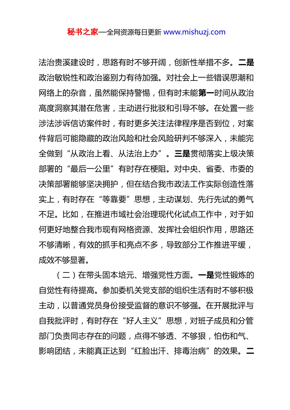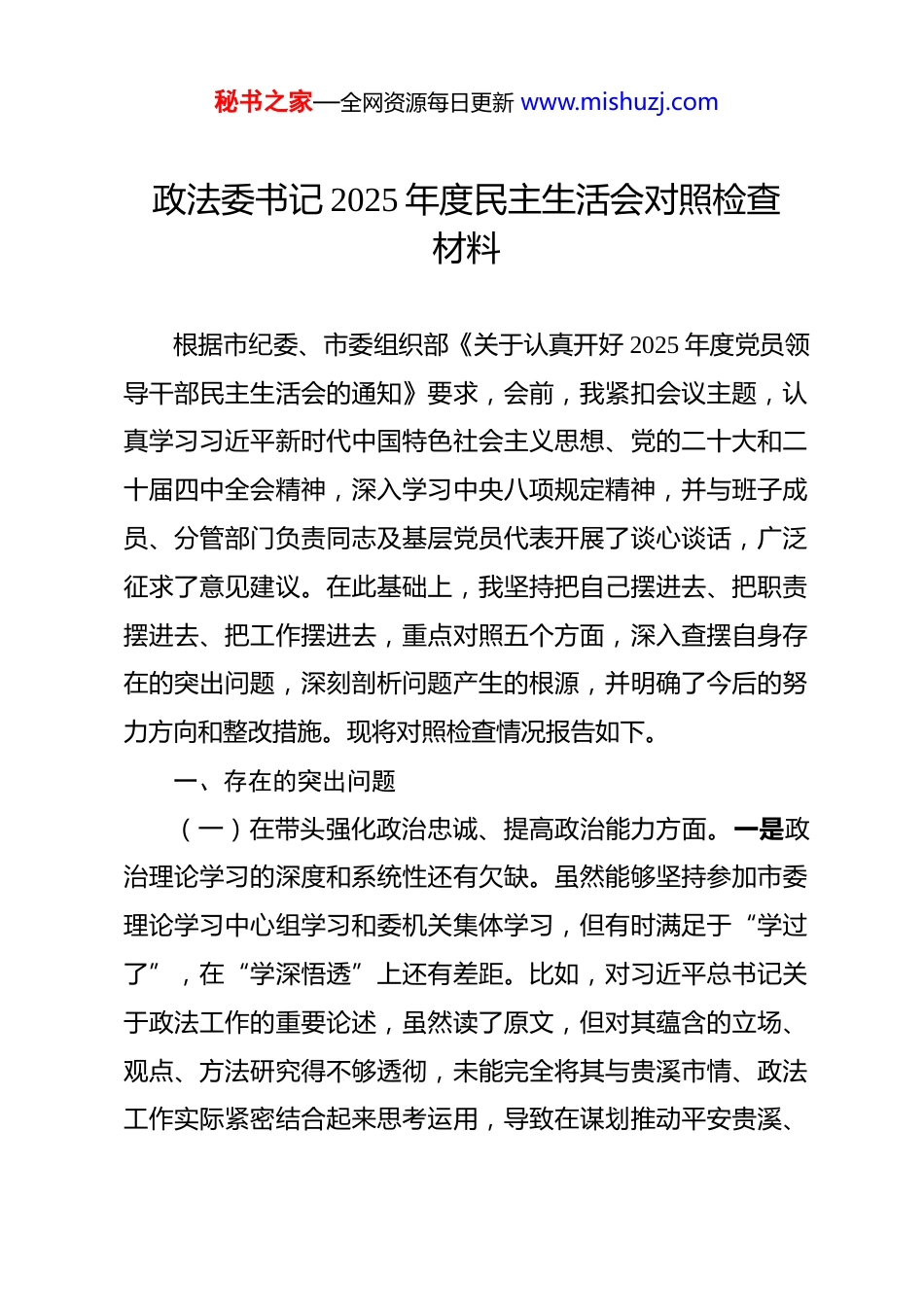秘书之家—全网资源每日更新 www.mishuzj.com政法委书记 2025 年度民主生活会对照检查材料 根据市纪委、市委组织部《关于认真开好 2025 年度党员领导干部民主生活会的通知》要求,会前,我紧扣会议主题,认真学习习近平新时代中国特色社会主义思想、党的二十大和二十届四中全会精神,深入学习中央八项规定精神,并与班子成员、分管部门负责同志及基层党员代表开展了谈心谈话,广泛征求了意见建议。在此基础上,我坚持把自己摆进去、把职责摆进去、把工作摆进去,重点对照五个方面,深入查摆自身存在的突出问题,深刻剖析问题产生的根源,并明确了今后的努力方向和整改措施。现将对照检查情况报告如下。一、存在的突出问题(一)在带头强化政治忠诚、提高政治能力方面。一是政治理论学习的深度和系统性还有欠缺。虽然能够坚持参加市委理论学习中心组学习和委机关集体学习,但有时满足于“学过了”,在“学深悟透”上还有差距。比如,对习近平总书记关于政法工作的重要论述,虽然读了原文,但对其蕴含的立场、观点、方法研究得不够透彻,未能完全将其与贵溪市情、政法工作实际紧密结合起来思考运用,导致在谋划推动平安贵溪、秘书之家—全网资源每日更新 www.mishuzj.com法治贵溪建设时,思路有时不够开阔,创新性举措不多。二是政治敏锐性和政治鉴别力有待加强。对社会上一些错误思潮和网络上的杂音,虽然能保持警惕,但有时未能第一时间从政治高度洞察其潜在危害,主动进行批驳和引导不够。在处置一些涉法涉诉信访案件时,有时更多关注法律程序是否到位,对案件背后可能隐藏的政治风险和社会风险研判不够深入,未能完全做到“从政治上看、从法治上办”。三是贯彻落实上级决策部署的“最后一公里”有时存在梗阻。对中央、省委、市委的决策部署能够坚决拥护,但在结合我市政法工作实际创造性落实上,有时存在“等靠要”思想,主动谋划、先行先试的勇气不足。比如,在推进市域社会治理现代化试点工作中,对于如何更好地整合我市现有网格资源、发挥社会组织作用,思路还不够清晰,有效的抓手和亮点不多,导致部分工作推进平缓,成效不够显著。(二)在带头固本培元、增强党性方面。一是党性锻炼的自觉性有待提高。参加委机关党支部的组织生活有时不够积极主动,以普通党员身份接受监督的意识不够强。在开展批评与自我批评时,有时存在“好人主义”思想,对班子成员和分管部门负责同志存在的问题,点得不够透、不够狠,怕伤和气、影响团结,未能真正达到“红脸出汗、排毒治病”的效果。二秘书之家—全网资源每日更新 www.mishuzj.com是理想信念的根基需要持续夯实。随着职务提升和工作繁忙,有时不自觉地放松了对主观世界的改造,对共产主义远大理想和中国特色社会主义共同理想的内涵理解不够深入,艰苦奋斗的精神有所弱化。比如,在面对政法工作中的一些顽瘴痼疾时,有时会产生畏难情绪,缺乏“啃硬骨头”的韧劲和“功成不必在我”的境界。三是宗旨意识树得不够牢固。虽然经常下基层调研,但有时“走马观花”多,“解剖麻雀”少。比如,到乡镇(街道)调研平安建设,多是听汇报、看亮点,与基层政法干警、网格员和普通群众面对面深入交流的时间不多,对他们真正的所思所盼掌握得不够全面、不够精准,导致一些工作部署与基层实际结合不够紧密,群众获得感不强。(三)在带头敬畏人民、敬畏组织、敬畏法纪方面。一是敬畏之心需要时时擦亮。对“人民是真正的英雄”理解不够透彻,有时坐在办公室听汇报多,真正扑下身子走进群众、拜群众为师不够。在推动解决群众反映强烈的“执行难”“诉讼难”等问题上,虽然部署了工作,但跟踪问效、一抓到底的力度还不够大,距离群众完全满意还有差距。对组织的培养和信任,有时觉得是理所应当,感恩回报、积极作为的意识需要进一步强化。在执行党的纪律规矩方面,虽然能守住底线,但在一些“小事小节”上要求不够严格,比如有时参加一些非公务秘书之家—全网资源每日更新 www.mishuzj.com的聚餐,虽然能把握原则,但对场合、人员的把关意识有待加强。二是组织观念需要进一步增强。在执行民主集中制方面,有时在政法委书记办公会上,对自己分管...