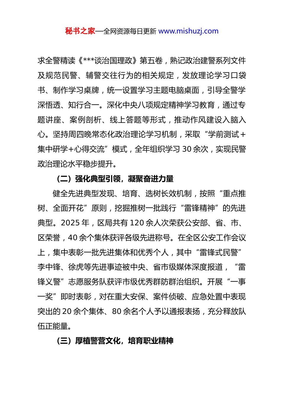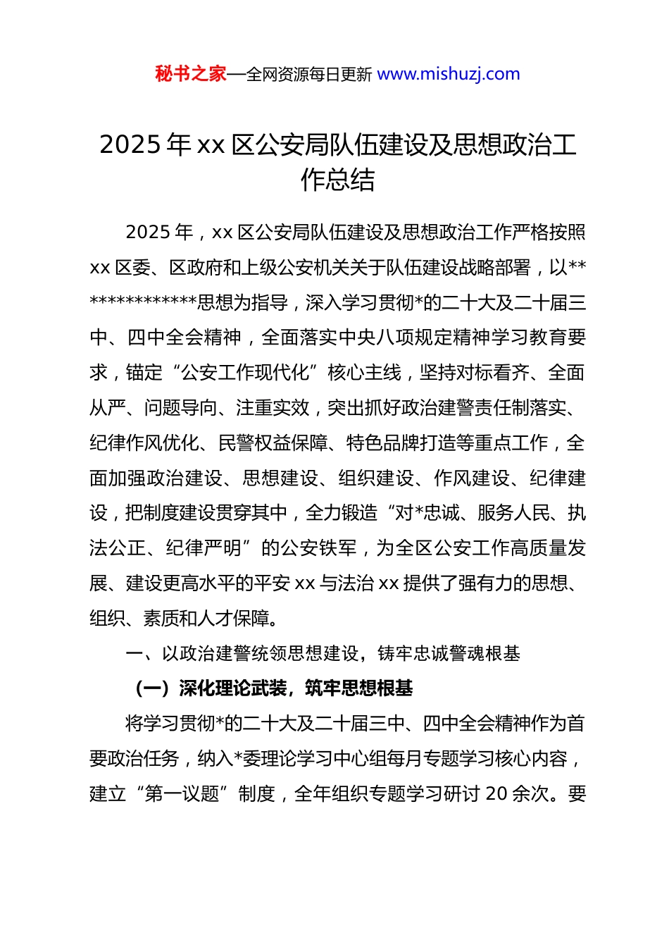 秘书之家—全网资源每日更新 www.mishuzj.com2025 年 xx 区公安局队伍建设及思想政治工作总结2025 年,xx 区公安局队伍建设及思想政治工作严格按照xx 区委、区政府和上级公安机关关于队伍建设战略部署,以**************思想为指导,深入学习贯彻*的二十大及二十届三中、四中全会精神,全面落实中央八项规定精神学习教育要求,锚定“公安工作现代化”核心主线,坚持对标看齐、全面从严、问题导向、注重实效,突出抓好政治建警责任制落实、纪律作风优化、民警权益保障、特色品牌打造等重点工作,全面加强政治建设、思想建设、组织建设、作风建设、纪律建设,把制度建设贯穿其中,全力锻造“对*忠诚、服务人民、执法公正、纪律严明”的公安铁军,为全区公安工作高质量发展、建设更高水平的平安 xx 与法治 xx 提供了强有力的思想、组织、素质和人才保障。一、以政治建警统领思想建设,铸牢忠诚警魂根基(一)深化理论武装,筑牢思想根基将学习贯彻*的二十大及二十届三中、四中全会精神作为首要政治任务,纳入*委理论学习中心组每月专题学习核心内容,建立“第一议题”制度,全年组织专题学习研讨 20 余次。要秘书之家—全网资源每日更新 www.mishuzj.com求全警精读《***谈治国理政》第五卷,熟记政治建警系列文件及规范民警、辅警交往行为的相关规定,发放理论学习口袋书、制作学习桌牌,统一设置学习主题电脑桌面,引导全警学深悟透、知行合一。深化中央八项规定精神学习教育,通过专题讲座、案例剖析、线上答题等形式,推动作风建设入脑入心。坚持周四晚常态化政治理论学习机制,采取“学前测试+集中研学+心得交流”模式,全年组织学习 30 余次,实现民警政治理论水平稳步提升。(二)强化典型引领,凝聚奋进力量健全先进典型发现、培育、选树长效机制,按照“重点推树、全面开花”原则,挖掘推树一批践行“雷锋精神”的先进典型。2025 年,区局共有 120 余人次荣获公安部、省、市、区荣誉,40 余个集体获评各级先进称号。在全区公安工作会议上,集中表彰一批先进集体和优秀个人,其中“雷锋式民警”李中锋、徐虎等先进事迹被中央、省市级媒体深度报道,“雷锋义警”志愿服务队获评市级优秀群防群治组织。开展“一事一奖”即时表彰,对在重大安保、案件侦破、应急处置中表现突出的 20 余个集体、80 余名个人予以通报表扬,充分释放队伍正能量。(三)厚植警营文化,培育职业精神秘书之家—全网资源每日更新 www.mishuzj.com隆重举行入警、警衔晋升、退休等荣誉仪式,组织“不忘初心、牢记使命,红心向*”十佳雷锋式民警评选活动,持续深化“做雷锋标兵,创红心警队”主题实践。结合政治轮训要求,组织民警赴雷锋纪念馆、湖南*史陈列馆开展主题*日活动,瞻仰革命先烈、重温红色历史。编撰更新《xx 公安志》,传承公安优良传统,增强全警集体荣誉感。组织全局乒乓球赛、“金盾杯”篮球赛及与高警局足球友谊赛,在区机关事业单位羽毛球邀请赛中蝉联团体冠军,丰富警营文化生活,凝聚队伍向心力。二、以政治建警统领组织建设,夯实发展保障(一)强化 dj 引领,压实政治责任坚持 dj“龙头”地位,严格落实《准则》《条例》,规范*内政治生活,常态化开展“三会一课”、*委(支部)书记述职评议工作。深化“*性体检”和 360 度测评机制,引导*员民警对照*章*规、先进典型检视自身,形成“dj 带队建、队建促工作”的良好格局。严格*员发展和管理,严把“入口关”,优化*员队伍结构,提升基层*组织战斗力。(二)深化支部“五化”建设,筑牢战斗堡垒全面推进*支部“五化”(支部设置标准化、组织生活正常化、管理服务精细化、工作制度体系化、阵地建设规范化)建秘书之家—全网资源每日更新 www.mishuzj.com设,提质改造 10 余个所队 dj 活动室,丁字派出所*支部、人境大队*支部持续保持 xx 区“五化”建设示范点称号,丁字派出所*支部获评市级“先进基层*组织”。常态化组织“红星云”在线学习和*员教育培训,全年开展书记讲*课 40 余堂,专题组织生活会 12 场,不断增强基层*组织创造力、凝聚力。(三)规范人事管理,激发队伍活力稳步推进警...