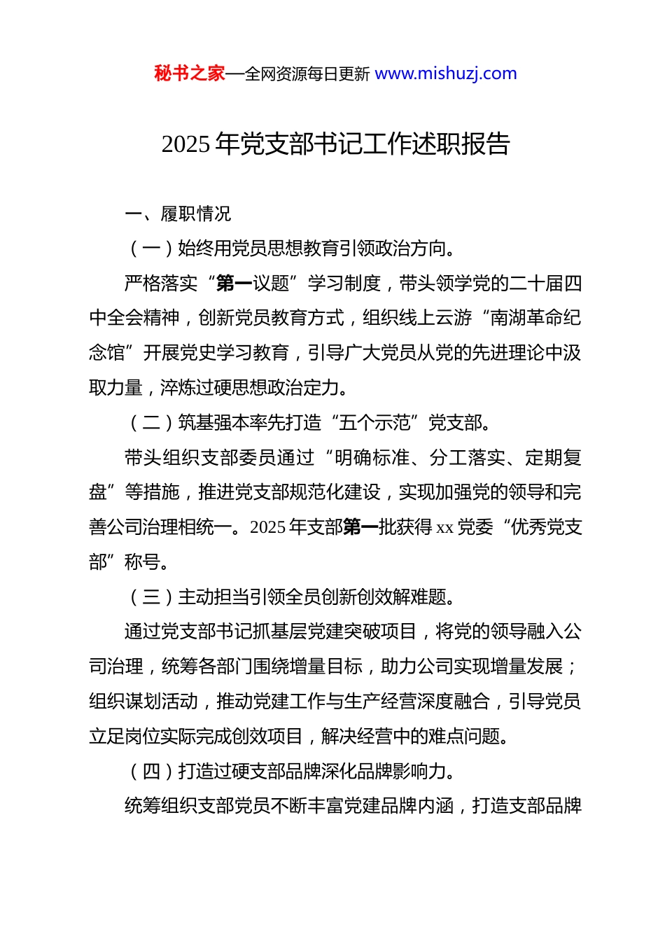 秘书之家—全网资源每日更新 www.mishuzj.com2025 年党支部书记工作述职报告 一、履职情况(一)始终用党员思想教育引领政治方向。严格落实“第一议题”学习制度,带头领学党的二十届四中全会精神,创新党员教育方式,组织线上云游“南湖革命纪念馆”开展党史学习教育,引导广大党员从党的先进理论中汲取力量,淬炼过硬思想政治定力。(二)筑基强本率先打造“五个示范”党支部。带头组织支部委员通过“明确标准、分工落实、定期复盘”等措施,推进党支部规范化建设,实现加强党的领导和完善公司治理相统一。2025 年支部第一批获得 xx 党委“优秀党支部”称号。(三)主动担当引领全员创新创效解难题。通过党支部书记抓基层党建突破项目,将党的领导融入公司治理,统筹各部门围绕增量目标,助力公司实现增量发展;组织谋划活动,推动党建工作与生产经营深度融合,引导党员立足岗位实际完成创效项目,解决经营中的难点问题。(四)打造过硬支部品牌深化品牌影响力。统筹组织支部党员不断丰富党建品牌内涵,打造支部品牌秘书之家—全网资源每日更新 www.mishuzj.com引领各部门齐发力、创实效。同时个人主导撰写的支部党建引领企业高质量发展的事迹材料,在《国企》杂志登载,支部品牌建设的经验先后在 xx 新闻和公众号被宣传推广。(五)突出问题导向确保问题整改落实好。针对上年度述职评议反馈的“学习教育形式不够丰富,缺乏创新性和影响力”的问题,创新党员教育形式,带领党员线上云游“南湖革命纪念馆”;针对“宣传工作缺少特色、亮点总结提炼”的问题,引导党员总结宣传支部工作亮点,全年共投稿 71 篇。二、存在问题及原因(一)思想教育影响不深,导致支部工作获得支持力度不足。在组织开展支部工作过程中,会遇到获得资源支持不足的情况,部分部门或设计室存在“做好业务,一俊遮百丑”的误区,导致在实际工作中对支部工作的支持力度不足。在日常主导组织的培训教育多以党员为主体,对职工群众的思想教育少,将党的领导融入公司治理不深,引导职工群众参与党建工作、活动的频率低,只组织了群众共同参与的活动,导致部分职工对党建工作认识不足,未能充分认识到党对企业领导的重要性,工作时容易产生抵触或消极态度,影响支部工作的完成效率。秘书之家—全网资源每日更新 www.mishuzj.com(二)对党员的考核、监管缺乏有效手段,影响工作积极性。在引导支部党员在生产经营中发挥先锋模范作用的过程中缺乏科学、有效的评估体系,无法全面衡量党员的日常表现和工作成效。特别是因为换届等因素导致党员评先树优活动未充分的落实。在调动党员积极性方面缺乏创新性的工作思路和方法,无法充分激发党员参与度和工作热情,导致在推动各项工作时缺乏动力和效率。(三)对外共建交流少,提炼经验、挖掘亮点工作思路不足。工作中,在提炼自身工作经验和挖掘工作亮点方面缺乏思路,在识别问题主要“矛盾点”并解决问题时缺乏高效的判断力。主要原因在于,引导支部与上下游企业等单位的交流共建少,全年只有一次与客户的党建交流,存在“闭门造车”现象。限制了自身从更广阔的视角审视和解决问题的能力,工作中难以提出具有创新性和前瞻性的解决方案,影响了支部的工作效率和质量。三、下一步工作措施(一)赋能提升协同合作,扩大支部影响力。一是扩大培训教育覆盖面,让更多职工群众尤其是部门负秘书之家—全网资源每日更新 www.mishuzj.com责人参与到党课等党支部活动中,强化职工对党的理论、政策的理解,从思想上做好引领工作;二是搭建重大项目协同项目管理体系,以产品线为主导,做好合同执行全链条的动态管控。推动党建与管理、技术、生产、质量业务的深度融合,打通内循环,让职工更多地参与到党支部工作中,以实际行动强化支部影响力。(二)四同步发挥引领作用,促进业务协同。不断提高党建与业务“一盘棋”的政治站位,确保党的领导深度融入公司治理。主导构建党建与业务“四同步”机制—即同步“规划、实施、考核、评估”,形成闭环管理体系,尤其是在年度、季度、月度规划及阶段性重点任务部署阶段,通过党建引领,协同各部门共同参与,在明确业务工作任务...
