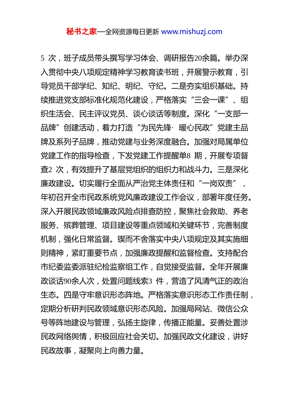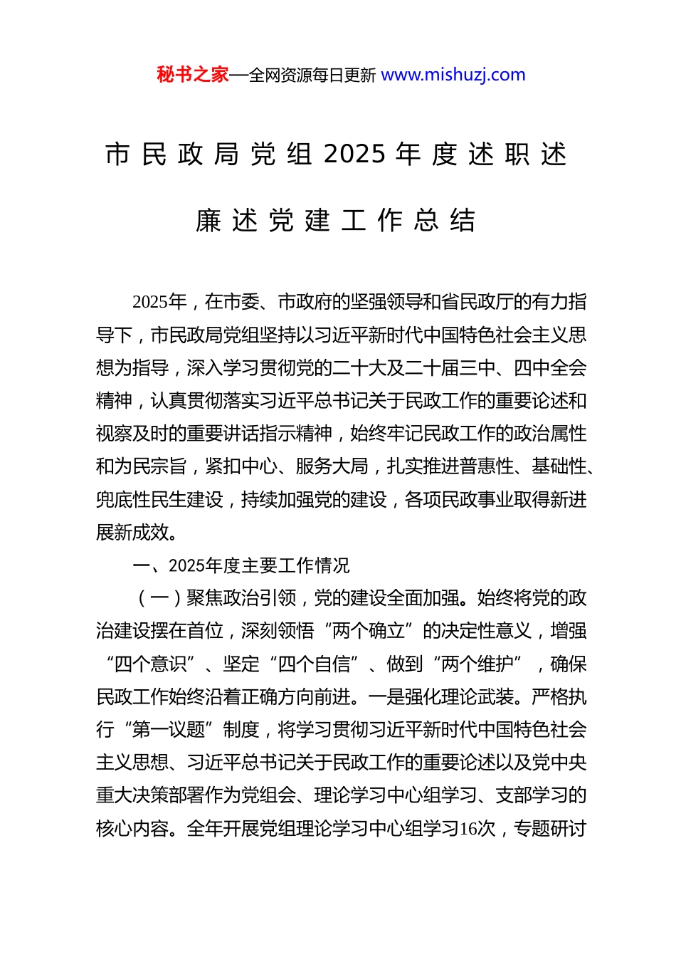 秘书之家—全网资源每日更新 www.mishuzj.com市 民 政 局 党 组 2025 年 度 述 职 述廉 述 党 建 工 作 总 结2025年,在市委、市政府的坚强领导和省民政厅的有力指导下,市民政局党组坚持以习近平新时代中国特色社会主义思想为指导,深入学习贯彻党的二十大及二十届三中、四中全会精神,认真贯彻落实习近平总书记关于民政工作的重要论述和视察及时的重要讲话指示精神,始终牢记民政工作的政治属性和为民宗旨,紧扣中心、服务大局,扎实推进普惠性、基础性、兜底性民生建设,持续加强党的建设,各项民政事业取得新进展新成效。一、2025年度主要工作情况(一)聚焦政治引领,党的建设全面加强。始终将党的政治建设摆在首位,深刻领悟“两个确立”的决定性意义,增强“四个意识”、坚定“四个自信”、做到“两个维护”,确保民政工作始终沿着正确方向前进。一是强化理论武装。严格执行“第一议题”制度,将学习贯彻习近平新时代中国特色社会主义思想、习近平总书记关于民政工作的重要论述以及党中央重大决策部署作为党组会、理论学习中心组学习、支部学习的核心内容。全年开展党组理论学习中心组学习16次,专题研讨秘书之家—全网资源每日更新 www.mishuzj.com5 次,班子成员带头撰写学习体会、调研报告20余篇。举办深入贯彻中央八项规定精神学习教育读书班,开展警示教育,引导党员干部学纪、知纪、明纪、守纪。二是夯实组织基础。持续推进党支部标准化规范化建设,严格落实“三会一课”、组织生活会、民主评议党员、谈心谈话等制度。深化“一支部一品牌”创建活动,着力打造“为民先锋· 暖心民政”党建主品牌及系列子品牌,推动党建与业务深度融合。加强对局属单位党建工作的指导检查,下发党建工作提醒单8 期,开展专项督查2 次,有效提升了基层党组织的组织力和战斗力。三是深化廉政建设。切实履行全面从严治党主体责任和“一岗双责”,年初召开全市民政系统党风廉政建设工作会议,部署年度任务。深入开展民政领域廉政风险点排查防控,聚焦社会救助、养老服务、殡葬管理、项目建设等重点领域和关键环节,完善制度机制,强化日常监督。锲而不舍落实中央八项规定及其实施细则精神,紧盯重要节点,加强廉政提醒和监督检查。支持配合市纪委监委派驻纪检监察组工作,自觉接受监督。全年开展廉政谈话90余人次,处置问题线索3 件,营造了风清气正的政治生态。四是守牢意识形态阵地。严格落实意识形态工作责任制,定期分析研判民政领域意识形态风险。加强局网站、微信公众号等阵地建设与管理,弘扬主旋律,传播正能量。妥善处置涉民政网络舆情,积极回应社会关切。加强民政文化建设,讲好民政故事,凝聚向上向善力量。秘书之家—全网资源每日更新 www.mishuzj.com(二)聚焦兜底夯基,社会救助精准高效。坚持以人民为中心的发展思想,健全分层分类的社会救助体系,坚决兜住兜准兜好基本民生底线。一是制度体系日趋完善。联合市财政局、医保局等12部门出台《市关于加强低收入人口动态监测做好分层分类社会救助工作的实施意见》,修订完善低保边缘家庭、支出型困难家庭认定办法,编印政策汇编和办事指南,政策衔接更加顺畅。推动建立市政府领导牵头的社会救助工作协调机制,首次将社会救助工作纳入部分市直部门绩效考核,齐抓共管格局进一步巩固。二是兜底保障坚实有力。截至2025年12月底,全市保障城乡低保对象8.92 万人、特困供养人员2.11 万人,认定低保边缘家庭1.85 万人、支出型困难家庭0.21 万人,全年累计发放低保、特困供养等救助资金约7.5 亿元。实施临时救助1.86 万人次,发放资金1980万元。全面落实社会救助和保障标准与物价上涨挂钩联动机制。失能、半失能特困人员集中供养率达到68%。三是服务效能显著提升。全面推行社会救助“一门受理、协同办理”和“一网通办”,优化简化流程。深化“大数据+铁脚板”主动发现机制,加强与卫健、医保、残联等部门数据共享比对,及时将符合条件的困难群众纳入救助范围,全年通过主动发现纳入监测和救助范围约4200人。积极探索“物质+服务”救助方式,通过政府购买服务为特殊困难群体提供照料护理、心理疏...