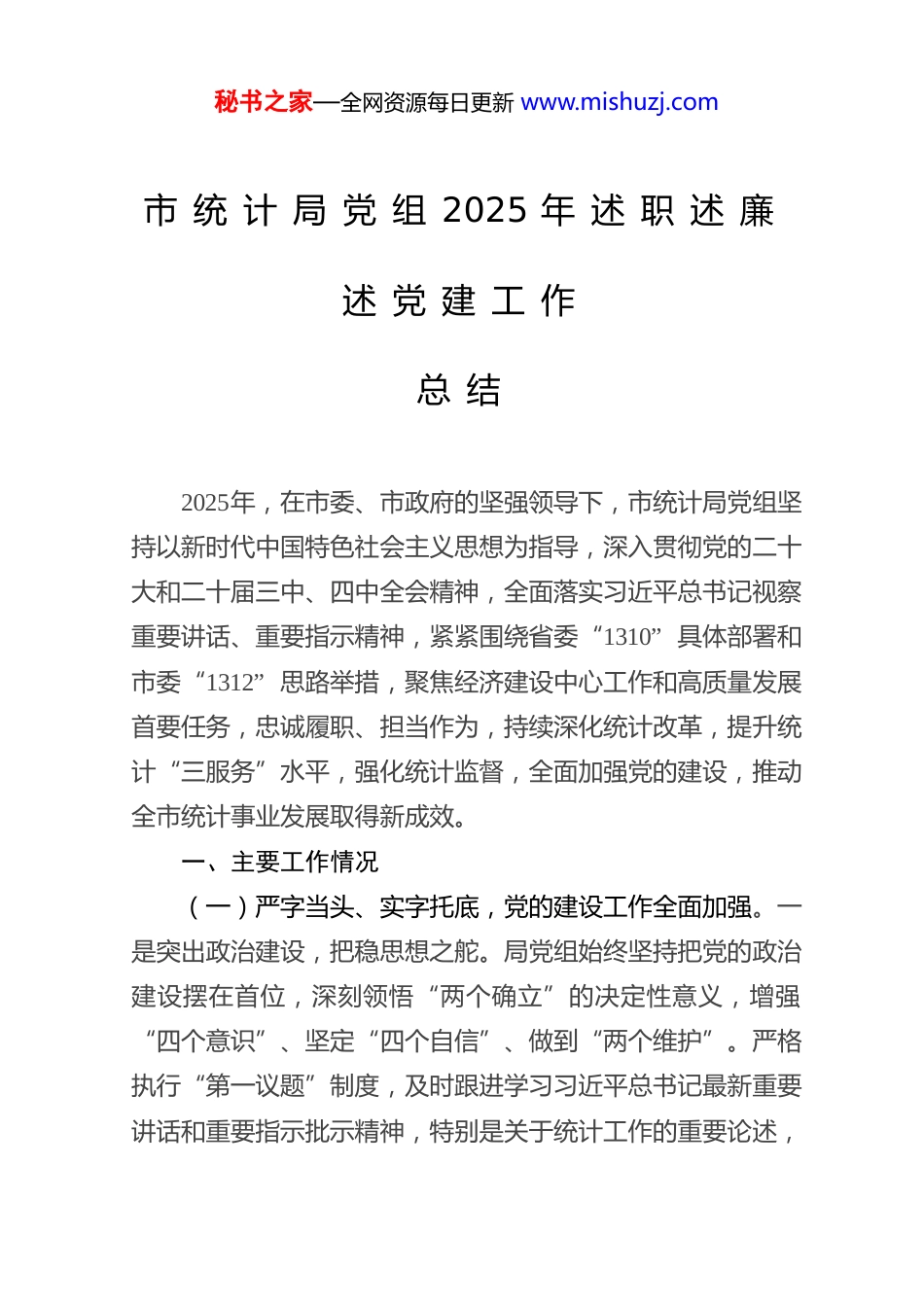 秘书之家—全网资源每日更新 www.mishuzj.com市 统 计 局 党 组 2025 年 述 职 述 廉述 党 建 工 作总 结2025年,在市委、市政府的坚强领导下,市统计局党组坚持以新时代中国特色社会主义思想为指导,深入贯彻党的二十大和二十届三中、四中全会精神,全面落实习近平总书记视察重要讲话、重要指示精神,紧紧围绕省委“1310” 具体部署和市委“1312” 思路举措,聚焦经济建设中心工作和高质量发展首要任务,忠诚履职、担当作为,持续深化统计改革,提升统计“三服务”水平,强化统计监督,全面加强党的建设,推动全市统计事业发展取得新成效。一、主要工作情况(一)严字当头、实字托底,党的建设工作全面加强。一是突出政治建设,把稳思想之舵。局党组始终坚持把党的政治建设摆在首位,深刻领悟“两个确立”的决定性意义,增强“四个意识”、坚定“四个自信”、做到“两个维护”。严格执行“第一议题”制度,及时跟进学习习近平总书记最新重要讲话和重要指示批示精神,特别是关于统计工作的重要论述,秘书之家—全网资源每日更新 www.mishuzj.com确保统计工作始终沿着正确政治方向前进。严守政治纪律和政治规矩,不折不扣贯彻落实党中央各项决策部署及省委、市委工作要求。二是强化理论武装,补足精神之钙。坚持用党的创新理论武装头脑、指导实践、推动工作。制定并落实党组理论学习中心组年度学习计划,通过专题学习、研讨交流、辅导报告等多种形式,深入学习党的二十大及历次全会精神,推动理论学习往深里走、往实里走、往心里走。三是夯实组织基础,筑强战斗堡垒。严格落实党建工作责任制,党组书记认真履行第一责任人职责,班子成员落实“一岗双责”。严格执行“三会一课”、组织生活会、民主评议党员、主题党日等制度,不断提升党支部标准化规范化建设水平。加强党员教育管理监督,发挥党员在经普一线、统计分析、改革创新等重点工作中的先锋模范作用。做好党员发展和党费收缴管理工作。四是持续正风肃纪,弘扬清廉之风。严格落实党风廉政建设责任制,党组书记负总责,班子成员分工负责。深入开展党性党风党纪教育,常态化开展警示教育,用身边事教育身边人。严格落实中央八项规定及其实施细则精神,坚决纠治形式主义、官僚主义。加强统计行风建设,弘扬求真务实、敬业奉献的职业精神。紧盯统计数据生产、执法检查、人财物管理等关键环节,排查廉政风险,完善防控措施。支持纪检监察机构履行监督责任,营造风清气正的政治生态。五是抓好队伍建设,激发干事活力。坚持党管干部原则,树立正确选人用人导向,注重在重大任务、秘书之家—全网资源每日更新 www.mishuzj.com基层一线考察识别干部。加强干部教育培训,提升专业能力和综合素质。关心关爱干部职工,积极帮助解决实际困难,增强统计队伍的凝聚力和向心力。(二)深耕细作、精准发力,统计监测分析服务水平持续提升。紧紧围绕高质量发展首要任务,不断强化经济形势监测预警和深度分析,有效发挥统计“数库”“智库”作用。一是聚焦决策需求,强化研判预警。持续完善经济运行“报前预判、报中监测、报后分析”机制,加强对宏观经济、重点行业、新兴动能、区域发展、市场主体的深度监测和前瞻性研判。2025年,市局共撰写高质量统计分析报告109 篇,其中42篇次获得市领导批示,为市委、市政府科学决策提供了扎实的统计支撑。各区统计局也紧密结合区域实际,向本级党委政府提供了大量有价值的统计分析资料。二是聚焦发展需求,深化专业服务。主动对接全市产业发展规划和区域发展战略,加强对产业竞争力、创新驱动、区域协调等方面的统计分析和评价。围绕社会关注的经济热点、重点,全年组织发布统计新闻主题55个,通过报刊、网络等媒体刊发转载超过150 篇次,有效解读经济数据,回应社会关切,引导市场预期。各区统计局立足本职,形成各类统计分析快报、报告近500 份,积极为区域经济发展献策出力。三是聚焦民生关切,拓展调查领域。践行“统计为民”理念,精心打造“万户居民调查”品牌。围绕“百千万工程”、城市治理、公共服务等民生热点,科学设计问卷,深入秘书之家—全网资源每日更新 www.mish...