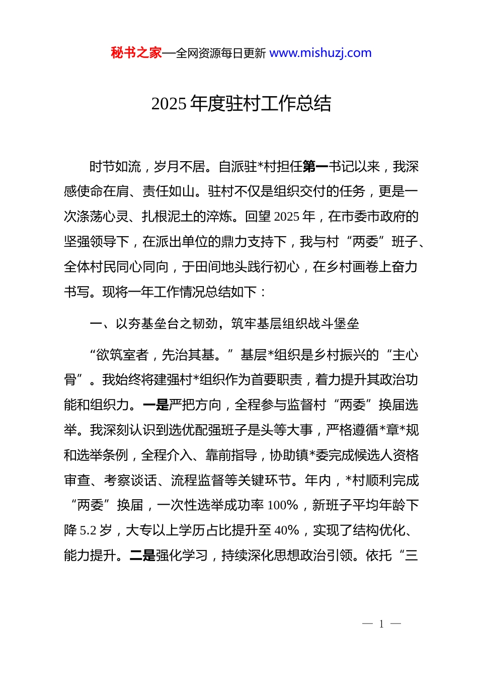 秘书之家—全网资源每日更新 www.mishuzj.com2025 年度驻村工作总结时节如流,岁月不居。自派驻*村担任第一书记以来,我深感使命在肩、责任如山。驻村不仅是组织交付的任务,更是一次涤荡心灵、扎根泥土的淬炼。回望 2025 年,在市委市政府的坚强领导下,在派出单位的鼎力支持下,我与村“两委”班子、全体村民同心同向,于田间地头践行初心,在乡村画卷上奋力书写。现将一年工作情况总结如下:一、以夯基垒台之韧劲,筑牢基层组织战斗堡垒“欲筑室者,先治其基。”基层*组织是乡村振兴的“主心骨”。我始终将建强村*组织作为首要职责,着力提升其政治功能和组织力。一是严把方向,全程参与监督村“两委”换届选举。我深刻认识到选优配强班子是头等大事,严格遵循*章*规和选举条例,全程介入、靠前指导,协助镇*委完成候选人资格审查、考察谈话、流程监督等关键环节。年内,*村顺利完成“两委”换届,一次性选举成功率 100%,新班子平均年龄下降 5.2 岁,大专以上学历占比提升至 40%,实现了结构优化、能力提升。二是强化学习,持续深化思想政治引领。依托“三— 1 —秘书之家—全网资源每日更新 www.mishuzj.com会一课”、主题*日等载体,组织*员深入学习*的创新理论及最新会议精神,全年开展专题学习 18 次,覆盖*员 460 余人次,推动*的政策主张“飞入寻常百姓家”,增强了*员干部拥护“两个确立”、做到“两个维护”的思想自觉和行动自觉。三是健全机制,着力规范村级权力运行。协助修订完善《*村村务监督委员会工作细则》等制度 7 项,推动“四议两公开”制度全面落实,确保村级事务在阳光下运行,年内公示各类事项 56件,群众满意度显著提升。二、以枝叶关情之初心,绘就民生福祉温暖画卷“但愿苍生俱饱暖,不辞辛苦出山林。”我始终将增进民生福祉作为工作的出发点和落脚点,着力解决群众急难愁盼问题。一是聚焦基础设施,大力改善人居环境。积极争取项目资金与派出单位支持,累计协调投入 120 余万元,实施道路硬化 3.2 公里,实现全村主干道“户户通”;完成安全饮水巩固提升工程,惠及村民 285 户;推进“厕所革命”后续管护,卫生厕所普及率达 98%。二是聚力公共服务,有效回应群众关切。针对留守老人儿童多的现状,推动建成村级养老互助点 1 处、儿童“四点半课堂”1 个;联系市医疗机构开展义诊活动 4 次,服务群众600 余人次;协助办理各类民生事项 83 件,化解矛盾纠纷 27 起,— 2 —秘书之家—全网资源每日更新 www.mishuzj.com群众获得感、幸福感、安全感更加充实。三是聚合多方资源,兜牢社会保障底线。动态监测“三类人群”,严格落实帮扶政策,年内为 12 户困难家庭申请临时救助、低保提标,确保不发生规模性返贫;组织开展技能培训 4 期,培训村民 165 人次,拓宽就业渠道。三、以活水开源之智策,激发产业发展内生动力“问渠那得清如许?为有源头活水来。”产业振兴是乡村振兴的重中之重。我坚持因地制宜,探索符合*村实际的产业发展之路。一是科学规划,明晰产业发展路径。深入开展调研,邀请农业专家实地把脉,确立了“稳定传统粮油、拓展特色种养、探索农旅融合”的思路。协助编制《*村特色产业发展三年规划》,为产业有序发展提供遵循。二是精准发力,培育壮大特色项目。依托本地资源优势,扶持壮大“阳光玫瑰”葡萄种植项目,面积扩增至 150 亩,年产值预计突破 300 万元;试点推广林下生态养殖,发展土鸡养殖户 8 户,户均年增收 1.5 万元;成功引进农产品初级加工企业 1 家,延长产业链条。三是拓展销路,助力农民增收致富。积极对接电商平台、商超,打通线上线下销售渠道,年内通过线上平台销售农产品价值约 85 万元;组织开展消费帮扶活动,派出单位采购及帮助销售农产品价值— 3 —秘书之家—全网资源每日更新 www.mishuzj.com约 40 万元。2025 年,预计村集体经济收入较上年增长 22%,达到 28 万元。回顾一年的工作,虽取得些许成效,但对照组织要求与群众期盼,仍清醒认识到存在不足:一是产业发展的抗风险能力有待进一步加强;二是激发村民内生动力、共建共享的长效机制需...