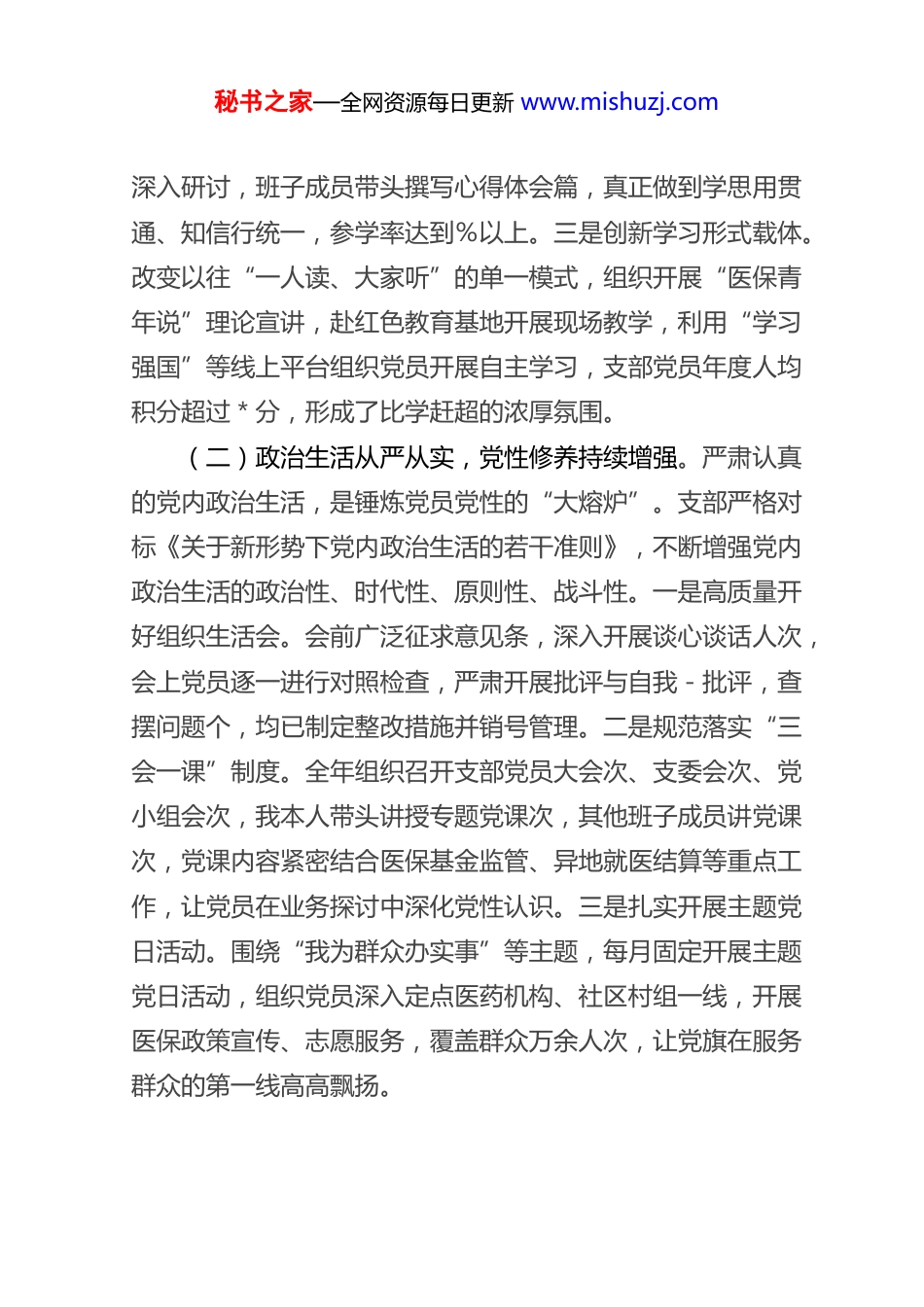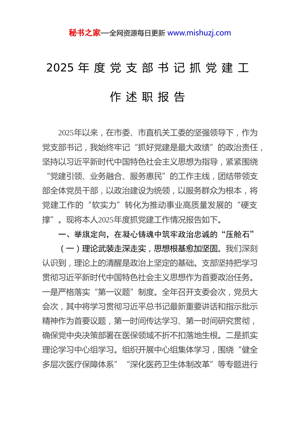 秘书之家—全网资源每日更新 www.mishuzj.com2025 年 度 党 支 部 书 记 抓 党 建 工作 述 职 报 告2025年以来,在市委、市直机关工委的坚强领导下,作为党支部书记,我始终牢记“抓好党建是最大政绩”的政治责任,坚持以习近平新时代中国特色社会主义思想为指导,紧紧围绕“党建引领、业务融合、服务惠民”的工作主线,团结带领支部全体党员干部,以政治建设为统领,以服务群众为根本,将党建工作的“软实力”转化为推动事业高质量发展的“硬支撑”。现将本人2025年度抓党建工作情况报告如下。一、举旗定向,在凝心铸魂中筑牢政治忠诚的“压舱石”(一)理论武装走深走实,思想根基愈加坚固。我们深刻认识到,理论上的清醒是政治上坚定的基础。支部坚持把学习贯彻习近平新时代中国特色社会主义思想作为首要政治任务。一是严格落实“第一议题”制度。全年召开支委会次,党员大会次,其中将学习贯彻习近平总书记最新重要讲话和指示批示精神作为首要议题,第一时间传达学习、第一时间研究贯彻,确保党中央决策部署在医保领域不折不扣落地生根。二是抓实理论学习中心组学习。组织开展中心组集体学习,围绕“健全多层次医疗保障体系”“深化医药卫生体制改革”等专题进行秘书之家—全网资源每日更新 www.mishuzj.com深入研讨,班子成员带头撰写心得体会篇,真正做到学思用贯通、知信行统一,参学率达到%以上。三是创新学习形式载体。改变以往“一人读、大家听”的单一模式,组织开展“医保青年说”理论宣讲,赴红色教育基地开展现场教学,利用“学习强国”等线上平台组织党员开展自主学习,支部党员年度人均积分超过*分,形成了比学赶超的浓厚氛围。(二)政治生活从严从实,党性修养持续增强。严肃认真的党内政治生活,是锤炼党员党性的“大熔炉”。支部严格对标《关于新形势下党内政治生活的若干准则》,不断增强党内政治生活的政治性、时代性、原则性、战斗性。一是高质量开好组织生活会。会前广泛征求意见条,深入开展谈心谈话人次,会上党员逐一进行对照检查,严肃开展批评与自我-批评,查摆问题个,均已制定整改措施并销号管理。二是规范落实“三会一课”制度。全年组织召开支部党员大会次、支委会次、党小组会次,我本人带头讲授专题党课次,其他班子成员讲党课次,党课内容紧密结合医保基金监管、异地就医结算等重点工作,让党员在业务探讨中深化党性认识。三是扎实开展主题党日活动。围绕“我为群众办实事”等主题,每月固定开展主题党日活动,组织党员深入定点医药机构、社区村组一线,开展医保政策宣传、志愿服务,覆盖群众万余人次,让党旗在服务群众的第一线高高飘扬。秘书之家—全网资源每日更新 www.mishuzj.com二、固本强基,在强基固垒中锻造干事创业的“主心骨”(一)组织体系建设持续优化。针对医保工作点多线长、专业性强的特点,我们对党小组设置进行了动态优化,将基金监管、窗口服务等关键岗位的党员骨干力量充实到支部委员会中,确保党的工作能够覆盖到医保业务的全链条。今年,按程序发展预备党员名,转正名,为支部注入了新鲜血液。同时,严格落实党费收缴、党员管理等基础工作,党员档案管理规范化水平得到显著提升。(二)党建品牌创建富有特色。为破解党建与业务“两张皮”问题,我们倾力打造“医保守护· 党旗领航”党建品牌。通过设立“党员先锋岗”个、“党员责任区”个,引导党员在医保支付方式改革、药品集中带量采购等急难险重任务中亮身份、当先锋。组织开展“医保为民· 党员先行”技能比武活动,评选出一名“医保服务标兵”,营造了“比业务、比作风、比贡献”的良好氛围,该品牌案例被市直机关工委评为“优秀党建品牌”。(三)党员队伍管理激发活力。坚持严管与厚爱相结合,加强对党员的教育、管理和监督。一方面,完善党员积分量化考核机制,将理论学习、岗位履职、服务群众等情况纳入考核,考核结果与评优评先、绩效奖励挂钩,激励党员创先争优。另一方面,深入开展谈心谈话,我与班子成员、班子成员与分管科室负责人、党支部委员与普通党员之间实现谈心谈话全覆盖,秘书之家—全网资源每日更新 www.mishuzj.com及...