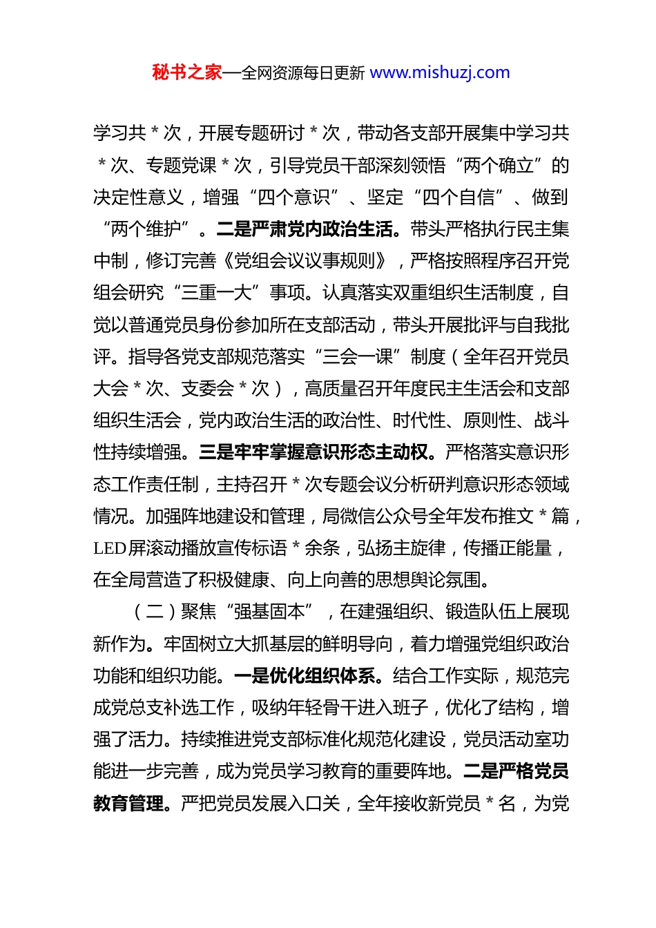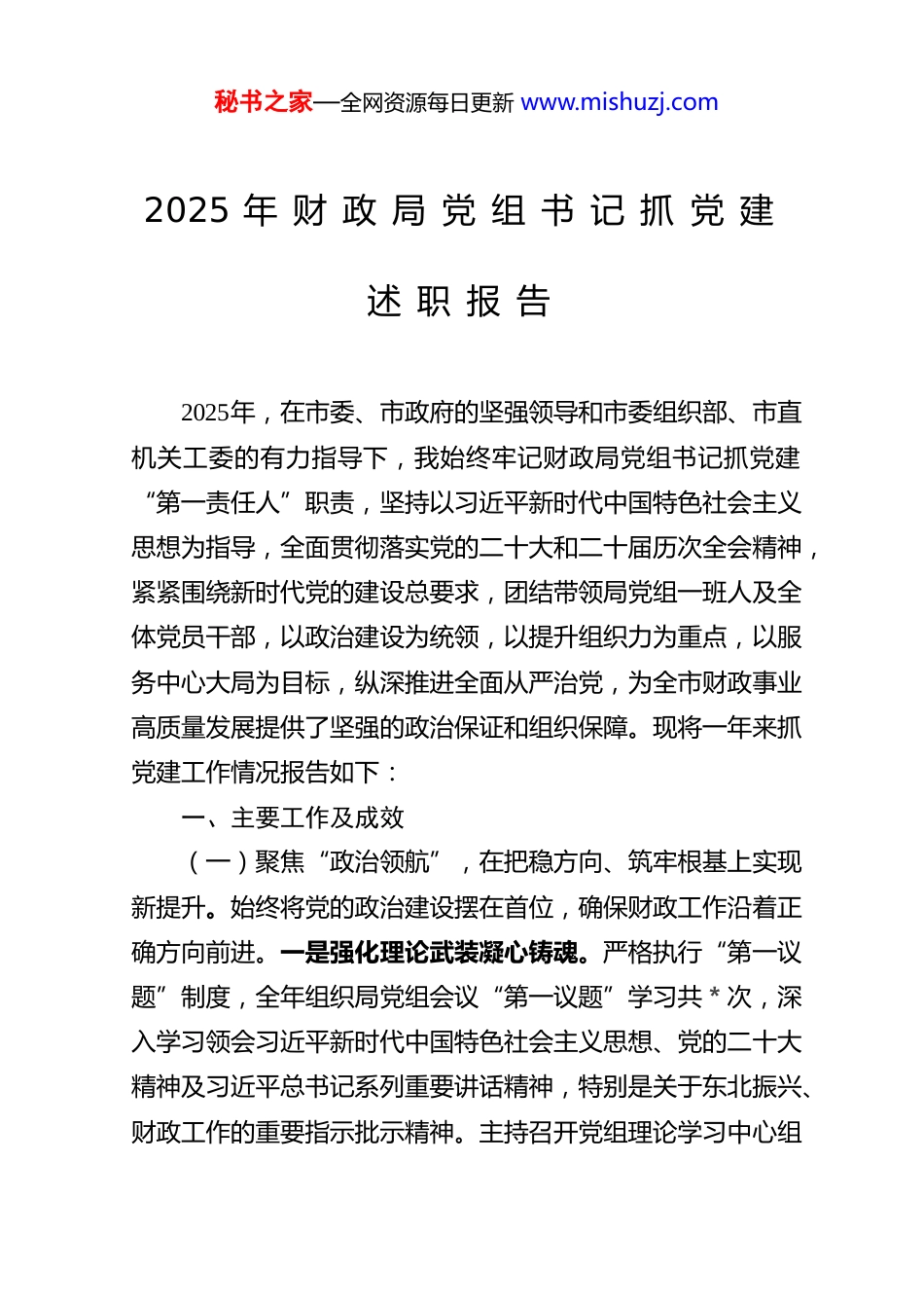 秘书之家—全网资源每日更新 www.mishuzj.com2025 年 财 政 局 党 组 书 记 抓 党 建述 职 报 告2025年,在市委、市政府的坚强领导和市委组织部、市直机关工委的有力指导下,我始终牢记财政局党组书记抓党建“第一责任人”职责,坚持以习近平新时代中国特色社会主义思想为指导,全面贯彻落实党的二十大和二十届历次全会精神,紧紧围绕新时代党的建设总要求,团结带领局党组一班人及全体党员干部,以政治建设为统领,以提升组织力为重点,以服务中心大局为目标,纵深推进全面从严治党,为全市财政事业高质量发展提供了坚强的政治保证和组织保障。现将一年来抓党建工作情况报告如下:一、主要工作及成效(一)聚焦“政治领航”,在把稳方向、筑牢根基上实现新提升。始终将党的政治建设摆在首位,确保财政工作沿着正确方向前进。一是强化理论武装凝心铸魂。严格执行“第一议题”制度,全年组织局党组会议“第一议题”学习共*次,深入学习领会习近平新时代中国特色社会主义思想、党的二十大精神及习近平总书记系列重要讲话精神,特别是关于东北振兴、财政工作的重要指示批示精神。主持召开党组理论学习中心组秘书之家—全网资源每日更新 www.mishuzj.com学习共*次,开展专题研讨*次,带动各支部开展集中学习共*次、专题党课*次,引导党员干部深刻领悟“两个确立”的决定性意义,增强“四个意识”、坚定“四个自信”、做到“两个维护”。二是严肃党内政治生活。带头严格执行民主集中制,修订完善《党组会议议事规则》,严格按照程序召开党组会研究“三重一大”事项。认真落实双重组织生活制度,自觉以普通党员身份参加所在支部活动,带头开展批评与自我批评。指导各党支部规范落实“三会一课”制度(全年召开党员大会*次、支委会*次),高质量召开年度民主生活会和支部组织生活会,党内政治生活的政治性、时代性、原则性、战斗性持续增强。三是牢牢掌握意识形态主动权。严格落实意识形态工作责任制,主持召开*次专题会议分析研判意识形态领域情况。加强阵地建设和管理,局微信公众号全年发布推文*篇,LED屏滚动播放宣传标语*余条,弘扬主旋律,传播正能量,在全局营造了积极健康、向上向善的思想舆论氛围。(二)聚焦“强基固本”,在建强组织、锻造队伍上展现新作为。牢固树立大抓基层的鲜明导向,着力增强党组织政治功能和组织功能。一是优化组织体系。结合工作实际,规范完成党总支补选工作,吸纳年轻骨干进入班子,优化了结构,增强了活力。持续推进党支部标准化规范化建设,党员活动室功能进一步完善,成为党员学习教育的重要阵地。二是严格党员教育管理。严把党员发展入口关,全年接收新党员*名,为党秘书之家—全网资源每日更新 www.mishuzj.com组织注入新鲜血液。强化党员日常教育,通过“财政业务大讲堂”(举办*期)、知识竞赛、线上学习等多种形式,提升党员综合素质。注重典型引领,结合干部现实表现,评选表彰优秀共产党员*名,激励广大党员立足岗位创先争优。三是深化党建业务融合。围绕财政中心工作,设计开展“党建领航财政路、七一奋进新征程”演讲比赛、“书香财政 智汇发展”读书分享会、财政知识“比武大练兵”等特色活动。组织党员积极参与社区共建、惠民文艺汇演、“*”爱心捐赠(捐赠衣物*余件、书籍*余本)等志愿服务活动,党员先锋模范作用在服务群众、推动发展中充分彰显。(三)聚焦“正风肃纪”,在从严治党、廉洁从政上取得新成效。坚决扛起全面从严治党主体责任,一刻不停推进党风廉政建设。一是压紧压实责任链条。全年召开全局党风廉政建设暨全面从严治党大会*次,层层签订《党风廉政建设责任书》*份,全体干部《履职承诺书》,制定党组班子及成员主体责任年度任务安排,形成明责、履责、督责闭环。二是深化纪律教育与警示教育。将党纪学习摆在突出位置,依托党组理论学习中心组、“三会一课”等,组织党员干部深入学习《中国共产党纪律处分条例》。全年开展各类警示教育*次,组织观看警示教育片*次,覆盖党员干部*人次。加强廉洁文化建设,组织干部家属参观廉韵清风主题公园,发放家庭助廉信,筑牢拒腐防变家庭...