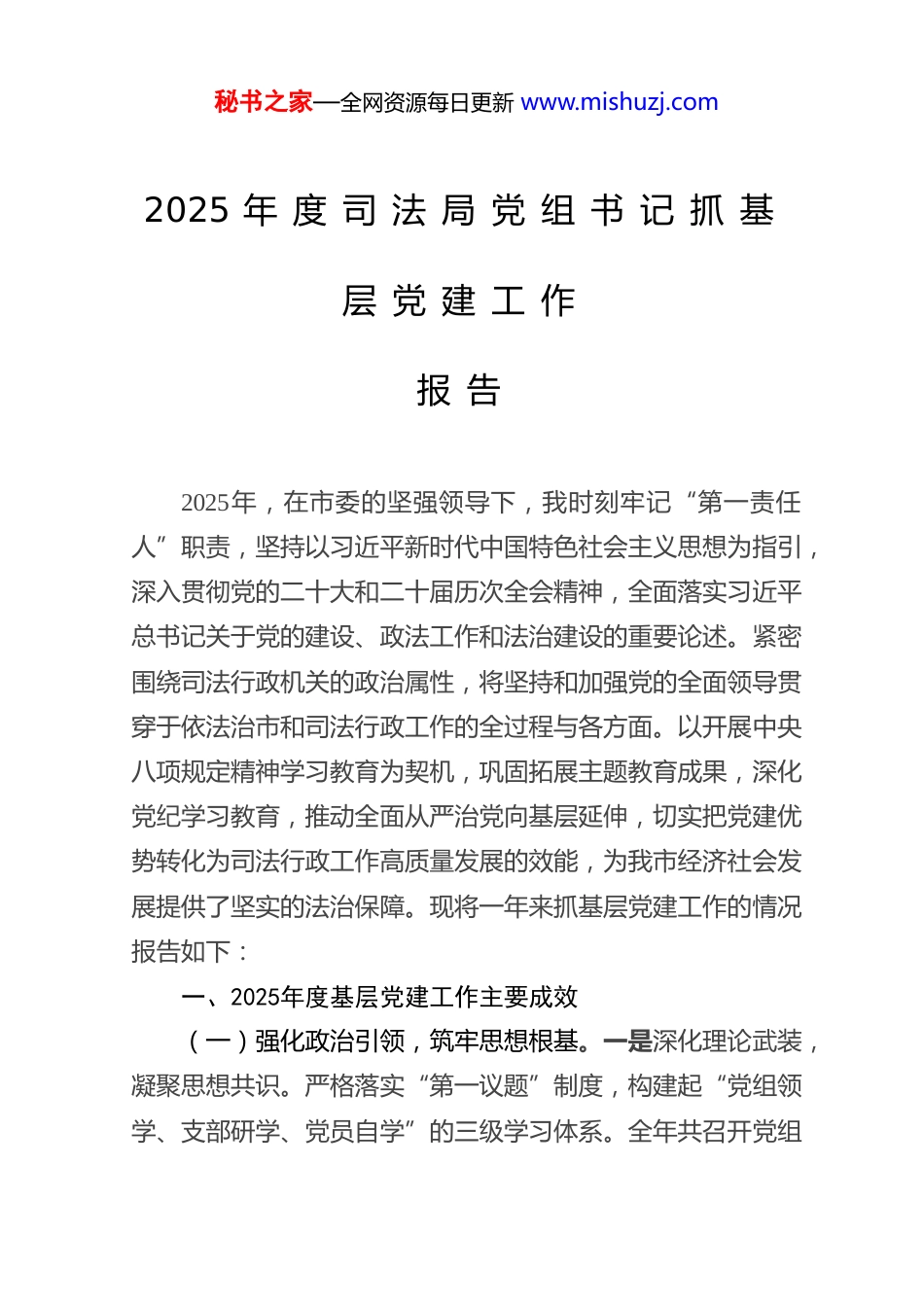 秘书之家—全网资源每日更新 www.mishuzj.com2025 年 度 司 法 局 党 组 书 记 抓 基层 党 建 工 作报 告2025年,在市委的坚强领导下,我时刻牢记“第一责任人”职责,坚持以习近平新时代中国特色社会主义思想为指引,深入贯彻党的二十大和二十届历次全会精神,全面落实习近平总书记关于党的建设、政法工作和法治建设的重要论述。紧密围绕司法行政机关的政治属性,将坚持和加强党的全面领导贯穿于依法治市和司法行政工作的全过程与各方面。以开展中央八项规定精神学习教育为契机,巩固拓展主题教育成果,深化党纪学习教育,推动全面从严治党向基层延伸,切实把党建优势转化为司法行政工作高质量发展的效能,为我市经济社会发展提供了坚实的法治保障。现将一年来抓基层党建工作的情况报告如下:一、2025年度基层党建工作主要成效(一)强化政治引领,筑牢思想根基。一是深化理论武装,凝聚思想共识。严格落实“第一议题”制度,构建起“党组领学、支部研学、党员自学”的三级学习体系。全年共召开党组秘书之家—全网资源每日更新 www.mishuzj.com会议36次,开展理论学习中心组学习12次,举办专题读书班4期,组织“走在前、作表率、开新局”专题研讨80余人次。重点深入学习党的二十届四中全会精神,围绕“中国式现代化法治任务”开展专题培训,覆盖党员干部500 余人次。通过系统学习,引导党员干部深刻领悟“两个确立”的决定性意义,增强“四个意识”、坚定“四个自信”、做到“两个维护”,切实把思想和行动统一到党中央的决策部署上来。二是锤炼过硬作风,树立良好形象。扎实推进中央八项规定精神学习教育,精心制定专项方案,将《习近平关于作风建设论述摘编》列为必学内容。组织领导干部读书班3 期,带动基层党支部开展学习研讨60余次。建立“班子查摆-台账管理-整改销号”的闭环机制,党组班子查摆问题20项,班子成员查摆问题30项。开展警示教育6 次,节前廉政谈话8 次,发送廉政提醒100 余次。通过一系列举措,进一步增强了党员干部的纪律意识和规矩意识,有效防止了“四风”问题反弹回潮,树立了司法行政机关的良好形象。三是守牢意识形态阵地,确保正确方向。专题研究意识形态工作8 次,严格执行网站、新媒体“三审三校”制度。建立司法行政领域舆情监测机制,定期分析思想动态,及时发现和处置潜在的意识形态风险。将意识形态要求融入律师、公证等行业管理,加强对法律服务从业人员的思想政治教育,确保其在执业过程中始终保持正确的政治方向。通过加强意识形态工作,为司法行政工作的顺利开展提供了有力的思想保障。秘书之家—全网资源每日更新 www.mishuzj.com(二)夯实组织基础,建强战斗堡垒。一是优化组织体系,提升党建效能。实施“书记领航”工程,班子成员建立党建联系点10个,开展“上门听会”20次,加强对基层党建工作的指导和监督。完成全市80家律所党建摸排工作,推动30家成立独立党支部,选派党建指导员20名。制定《律所党支部“三会一课”质量规范》,明确组织生活的内容、形式和要求,提升了组织生活的质量。通过优化组织体系,进一步加强了党组织对律师行业的领导,推动了律师行业党建工作的规范化、制度化发展。二是严格组织生活,增强党性修养。深化“四强”党支部创建活动,严格落实“三会一课”、组织生活会、民主评议党员等制度。举办党务培训5 期,提高了党务干部的业务能力和工作水平。开展“党建+‘枫桥经验’”等特色品牌创建活动,探索创新党建工作与业务工作深度融合的有效途径。推行“支部联社区”活动,签订共建协议30份,组织党员下沉服务500 余人次,充分发挥了基层党组织的战斗堡垒作用和党员的先锋模范作用。三是激活党员队伍,激发干事活力。发展党员10名,为党组织注入了新鲜血液。设立“党员先锋岗”30个,激励党员干部在工作中勇挑重担、争先创优。组建“党员法律服务团”“调解先锋队”,积极参与法治宣传、矛盾纠纷化解等工作,为群众提供优质高效的法律服务。开展“四好”党员评选活动,表彰先进20名,树立了榜样,激发了党员干部的干秘书之家—全网资源每日更新 www.mishuzj.com事创业热情。离...