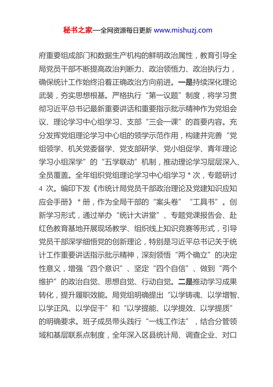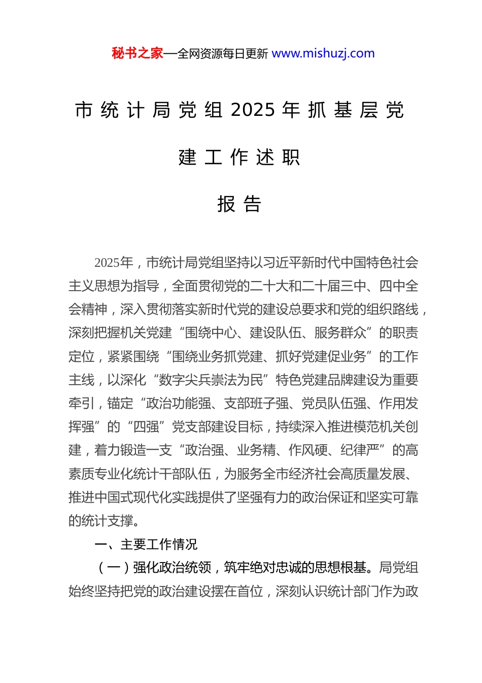 秘书之家—全网资源每日更新 www.mishuzj.com市 统 计 局 党 组 2025 年 抓 基 层 党建 工 作 述 职报 告2025年,市统计局党组坚持以习近平新时代中国特色社会主义思想为指导,全面贯彻党的二十大和二十届三中、四中全会精神,深入贯彻落实新时代党的建设总要求和党的组织路线,深刻把握机关党建“围绕中心、建设队伍、服务群众”的职责定位,紧紧围绕“围绕业务抓党建、抓好党建促业务”的工作主线,以深化“数字尖兵崇法为民”特色党建品牌建设为重要牵引,锚定“政治功能强、支部班子强、党员队伍强、作用发挥强”的“四强”党支部建设目标,持续深入推进模范机关创建,着力锻造一支“政治强、业务精、作风硬、纪律严”的高素质专业化统计干部队伍,为服务全市经济社会高质量发展、推进中国式现代化实践提供了坚强有力的政治保证和坚实可靠的统计支撑。一、主要工作情况(一)强化政治统领,筑牢绝对忠诚的思想根基。局党组始终坚持把党的政治建设摆在首位,深刻认识统计部门作为政秘书之家—全网资源每日更新 www.mishuzj.com府重要组成部门和数据生产机构的鲜明政治属性,教育引导全局党员干部不断提高政治判断力、政治领悟力、政治执行力,确保统计工作始终沿着正确政治方向前进。一是持续深化理论武装,夯实思想根基。严格执行“第一议题”制度,将学习贯彻习近平总书记最新重要讲话和重要指示批示精神作为党组会议、理论学习中心组学习、支部“三会一课”的首要内容。充分发挥党组理论学习中心组的领学示范作用,构建并完善“党组领学、机关党委督学、党支部研学、党小组促学、青年理论学习小组深学”的“五学联动”机制,推动理论学习层层深入、全员覆盖。全年组织党组理论学习中心组学习*次,专题研讨4 次。编印下发《市统计局党员干部政治理论及党建知识应知应会手册》*册,作为全局干部的“案头卷”“工具书”。创新学习形式,通过举办“统计大讲堂”、专题党课报告会、赴红色教育基地开展现场教学、组织线上知识竞赛等形式,引导党员干部深学细悟党的创新理论,特别是习近平总书记关于统计工作重要讲话指示批示精神,深刻领悟“两个确立”的决定性意义,增强“四个意识”、坚定“四个自信”、做到“两个维护”的政治自觉、思想自觉、行动自觉。二是推动学习成果转化,提升履职效能。局党组明确提出“以学铸魂、以学增智、以学正风、以学促干”和“以学提能、以学提效、以学提质”的明确要求。班子成员带头践行“一线工作法”,结合分管领域和基层联系点制度,全年深入区县统计局、调查企业、对口秘书之家—全网资源每日更新 www.mishuzj.com社区(村)开展专题调研和党建指导*次,既宣讲政策、传导压力,又现场办公、解决难题,切实做到“出思路、教方法、传经验”。全局党员干部坚持学思用贯通、知信行统一,自觉将党中央重大决策部署、省委、省政府和市委、市政府的工作要求,同贯彻落实习近平总书记关于统计工作“真实准确、完整及时”的核心要求紧密结合起来,转化为健全统计制度方法、严把数据质量关口、提升统计分析服务水平、强化统计监督职能、推进统计现代化改革的具体行动方案和工作实效,确保党的路线方针政策在统计领域不折不扣落地生根。三是坚决扛牢政治责任,守好意识形态阵地。局党组高度重视意识形态工作,将其纳入党建工作责任制、纳入领导班子和领导干部目标管理,年初制定印发《市统计局2025年度意识形态工作要点及责任清单》,层层传导压力、压实责任。建立健全干部职工思想动态定期分析研判机制,党组成员、支部书记常态化开展谈心谈话60余人次,及时掌握思想脉搏,有针对性地做好教育引导和疏解工作。严格管理局门户网站、“统计”微信公众号、内部工作群等意识形态阵地,坚持正确的政治方向、舆论导向和价值取向,加强对统计信息发布、数据解读、政策宣传内容的审核把关,旗帜鲜明地反对和抵制各种错误思潮和负面言论,全年未发生任何意识形态领域问题,有效维护了统计领域意识形态安全。秘书之家—全网资源每日更新 www.mishuzj.com(二)聚焦强基固本,锻造素质过硬的先锋队伍。局党组牢固树立大抓基层的鲜明导向...
