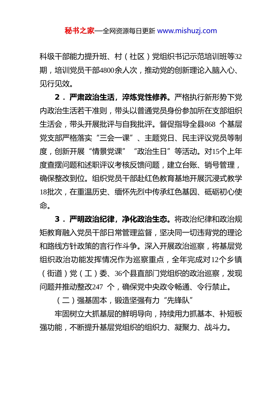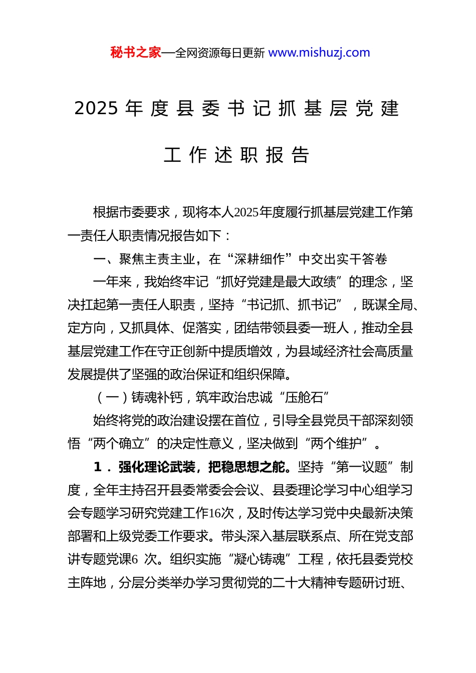 秘书之家—全网资源每日更新 www.mishuzj.com2025 年 度 县 委 书 记 抓 基 层 党 建工 作 述 职 报 告根据市委要求,现将本人2025年度履行抓基层党建工作第一责任人职责情况报告如下:一、聚焦主责主业,在“深耕细作”中交出实干答卷一年来,我始终牢记“抓好党建是最大政绩”的理念,坚决扛起第一责任人职责,坚持“书记抓、抓书记”,既谋全局、定方向,又抓具体、促落实,团结带领县委一班人,推动全县基层党建工作在守正创新中提质增效,为县域经济社会高质量发展提供了坚强的政治保证和组织保障。(一)铸魂补钙,筑牢政治忠诚“压舱石”始终将党的政治建设摆在首位,引导全县党员干部深刻领悟“两个确立”的决定性意义,坚决做到“两个维护”。1 .强化理论武装,把稳思想之舵。坚持“第一议题”制度,全年主持召开县委常委会会议、县委理论学习中心组学习会专题学习研究党建工作16次,及时传达学习党中央最新决策部署和上级党委工作要求。带头深入基层联系点、所在党支部讲专题党课6 次。组织实施“凝心铸魂”工程,依托县委党校主阵地,分层分类举办学习贯彻党的二十大精神专题研讨班、秘书之家—全网资源每日更新 www.mishuzj.com科级干部能力提升班、村(社区)党组织书记示范培训班等32期,培训党员干部4800余人次,推动党的创新理论入脑入心、见行见效。2 .严肃政治生活,淬炼党性修养。严格执行新形势下党内政治生活若干准则,带头以普通党员身份参加所在支部组织生活会,带头开展批评与自我批评。督促指导全县868 个基层党支部严格落实“三会一课”、主题党日、民主评议党员等制度,创新开展“情景党课”“政治生日”等活动。对15个上年度查摆问题和述职评议考核反馈问题,建立台账、销号管理,确保整改到位。组织党员干部赴红色教育基地开展沉浸式教学18批次,在重温历史、缅怀先烈中传承红色基因、砥砺初心使命。3 .严明政治纪律,净化政治生态。将政治纪律和政治规矩教育融入党员干部日常管理监督,坚决同一切违背党的理论和路线方针政策的言行作斗争。深入开展政治巡察,将基层党组织政治功能发挥情况作为巡察重点,全年完成对12个乡镇(街道)党(工)委、36个县直部门党组织的政治巡察,发现问题并推动整改247 个,确保党中央政令畅通、令行禁止。(二)强基固本,锻造坚强有力“先锋队”牢固树立大抓基层的鲜明导向,持续用力抓基本、补短板强功能,不断提升基层党组织的组织力、凝聚力、战斗力。秘书之家—全网资源每日更新 www.mishuzj.com1 .建强骨干队伍,优化“头雁”方阵。圆满完成村(社区)“两委”换届“回头看”,动态调整不胜任、不尽职的村党组织书记8 名、其他“两委”成员37名。深入实施“头雁培育”计划,公开招录35名全日制本科以上学历的乡村振兴专干到村任职,选派28名优秀年轻机关干部到村担任第一书记。目前,全县村党组织书记、村委会主任“一肩挑”比例达100 %,大专以上学历占比提升至68%,平均年龄下降至46.5岁。举办村(社区)党组织书记“擂台比武”4 期,营造比学赶超浓厚氛围。2 .严密组织体系,扩大“两个覆盖”。扎实开展非公企业和社会组织党组织组建攻坚行动,新建党组织18个,调整优化联合党支部设置12个,向重点企业、社会组织精准选派党建指导员、驻企联络员73名,党的组织和工作覆盖率分别提升至92%和100 %。积极探索产业链、供应链、创新链党建,在3个重点产业集群建立党建联盟。加强新业态、新就业群体党建工作,依托社区、商圈楼宇建立“暖心驿站”26个,成立流动党员党支部4 个。3 .强化党员管理,激发队伍活力。全面推行党员积分量化管理和“承诺践诺评诺”制度,设立党员先锋岗、责任区1560余个。严把党员发展“入口关”,全年发展党员365 名,其中35岁以下、大专以上学历、生产工作一线占比均达80%以上。健全党内关怀帮扶机制,走访慰问生活困难党员、老党员秘书之家—全网资源每日更新 www.mishuzj.com1250人次。在防汛救灾、重大项目建设、信访维稳等急难险重任务一线,组建临时党支部42个、党员突击队(志愿服务队)220 支,引导广大党员冲锋在前、担当作为...